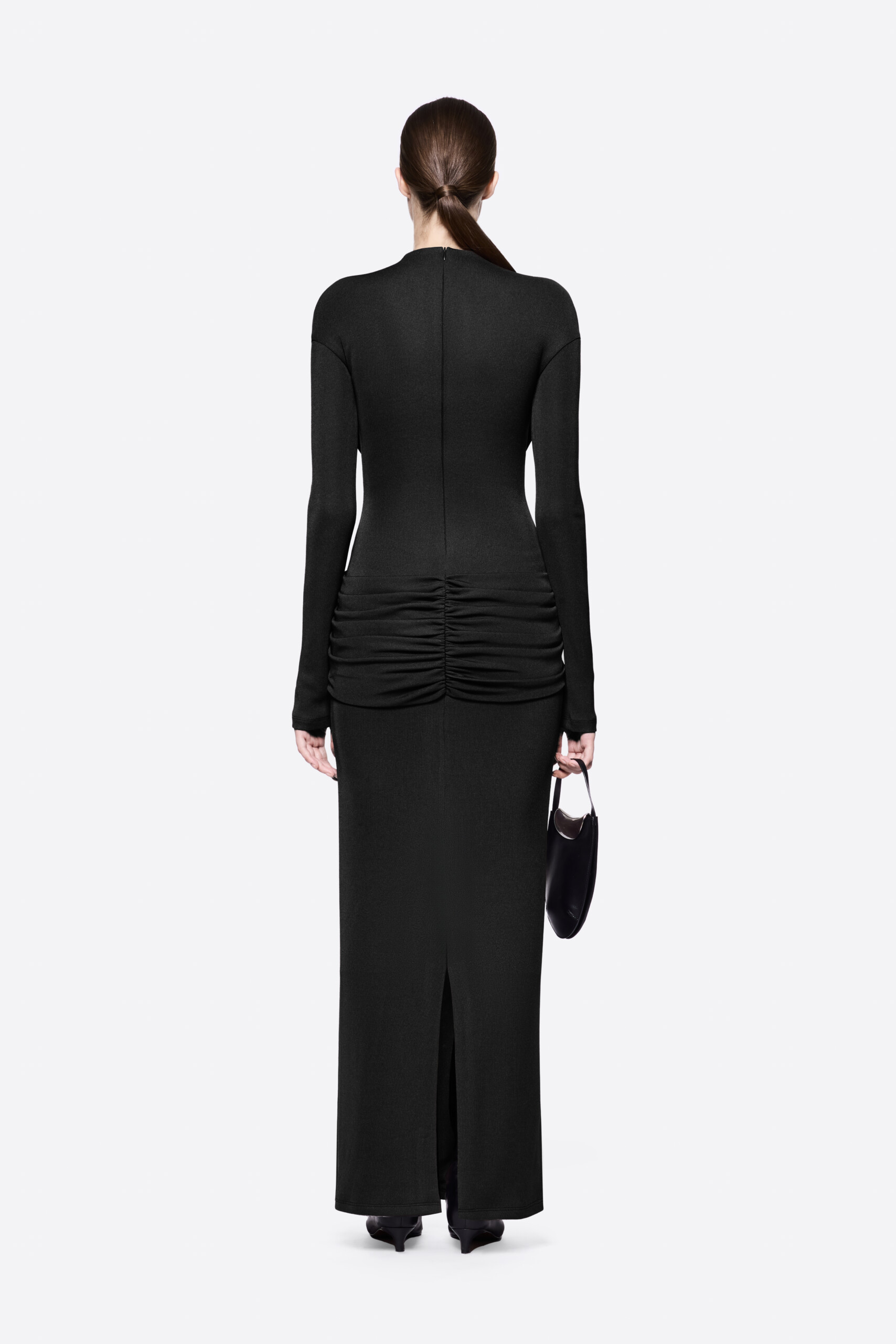 Form-fitting long dress with diagonal draping on the body and metalic detail