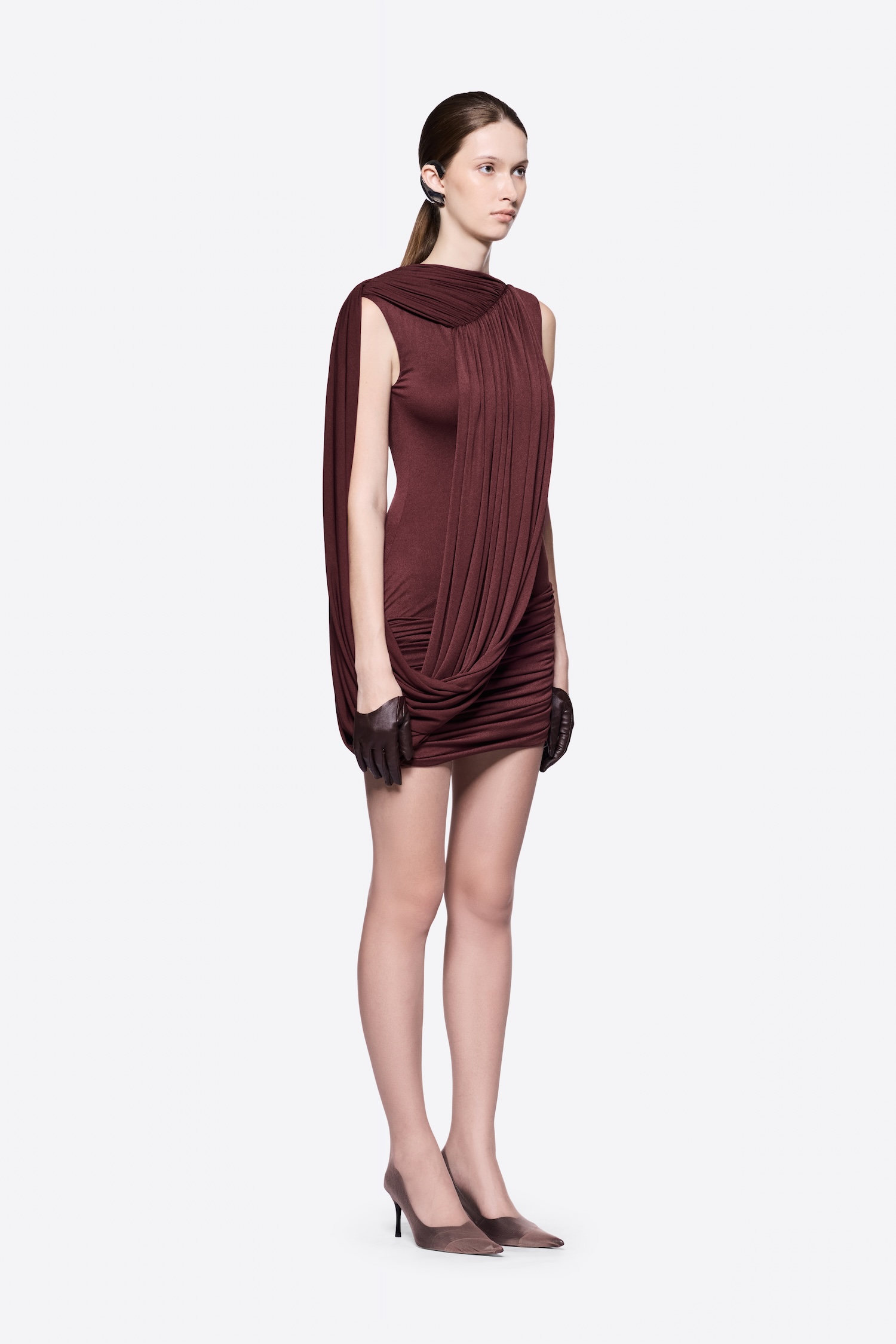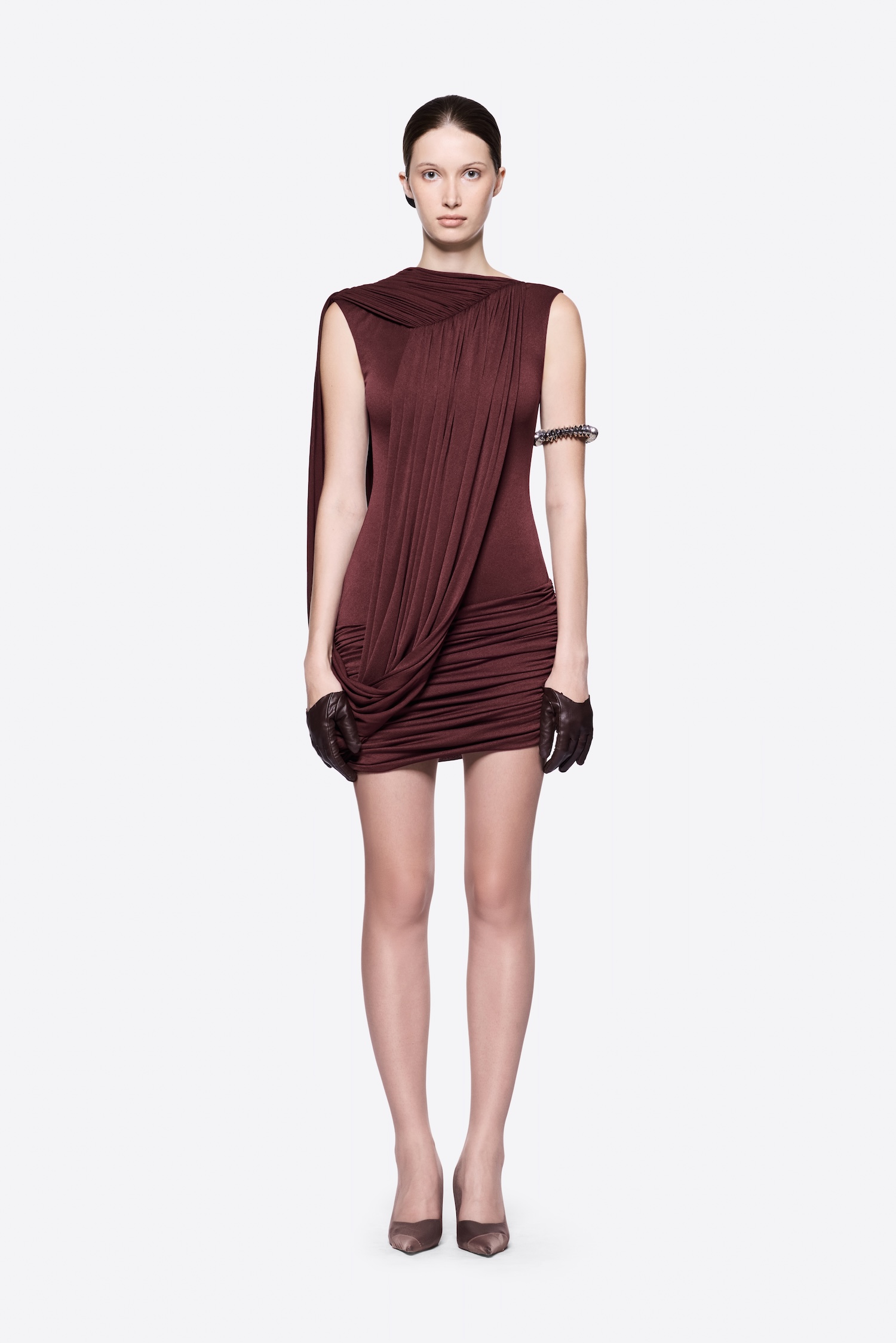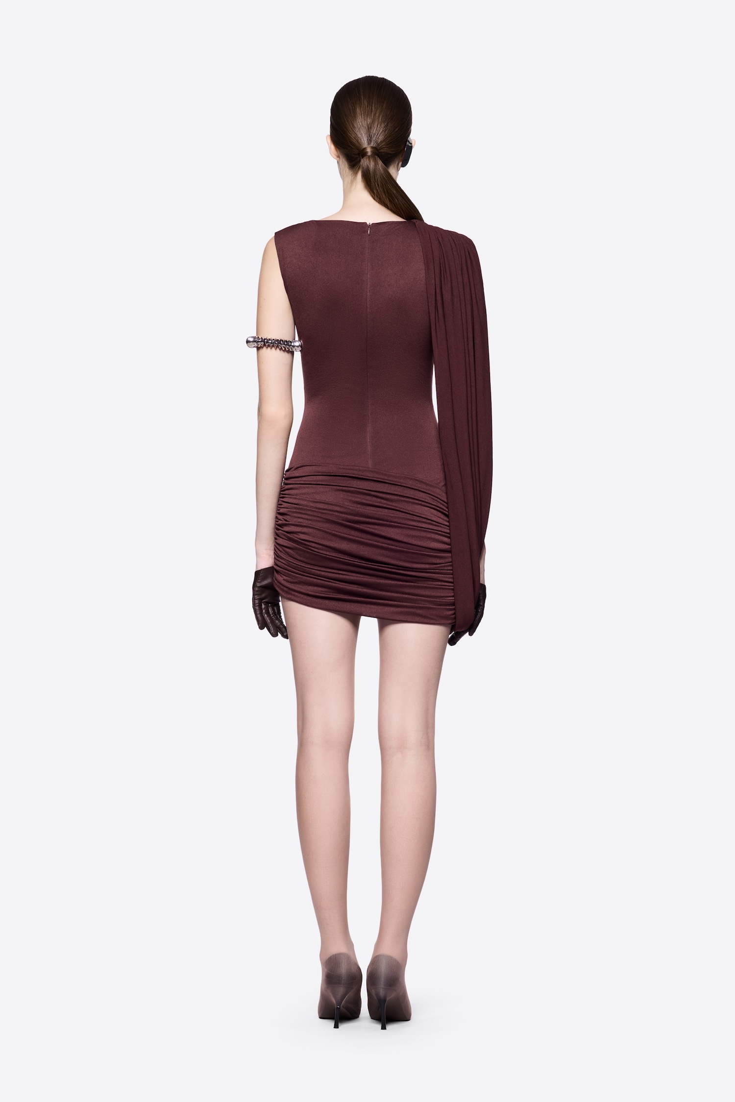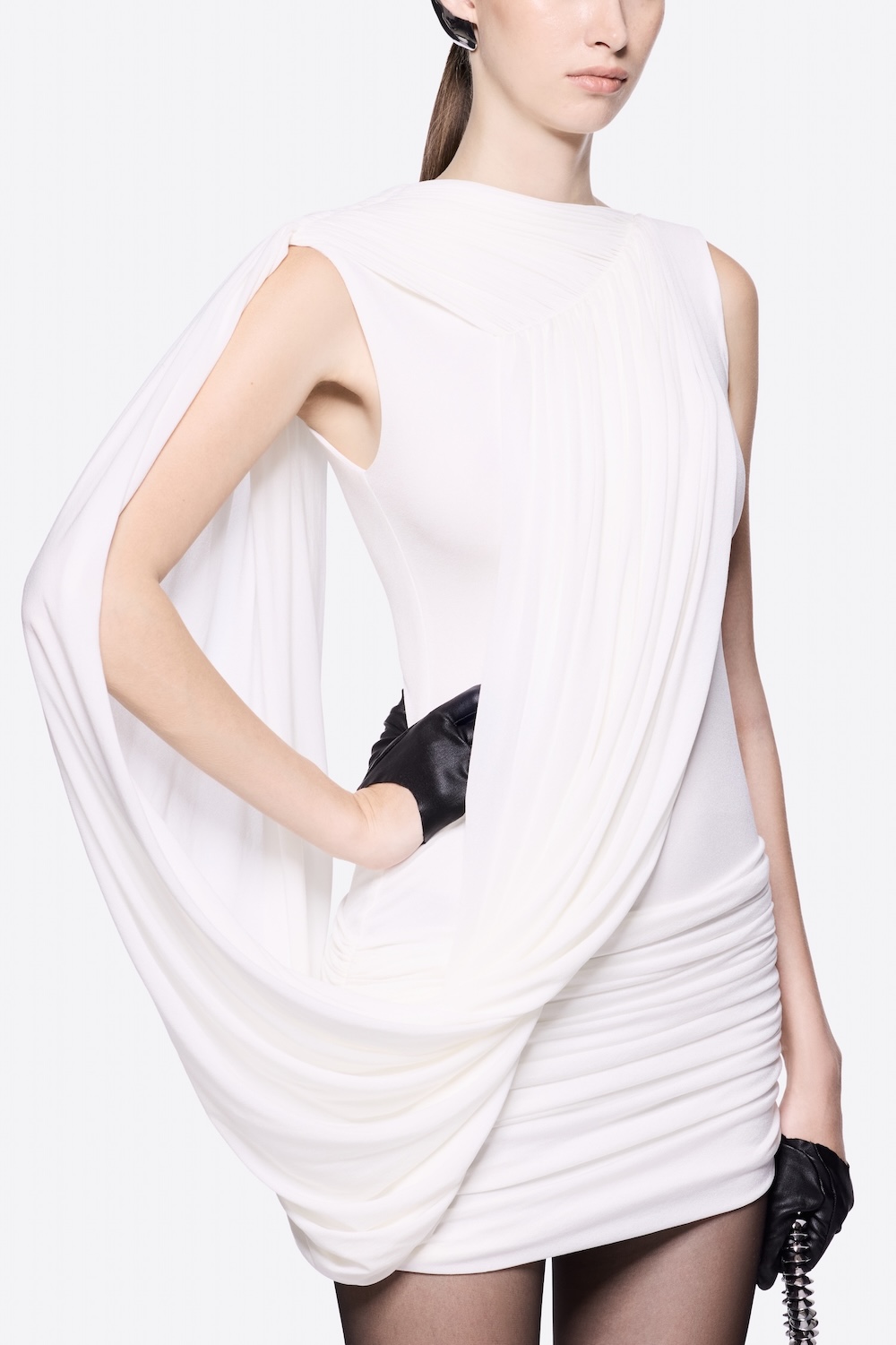Form-fitting shoulder-padded mini dress with asymmetrical cross-draped shoulder details