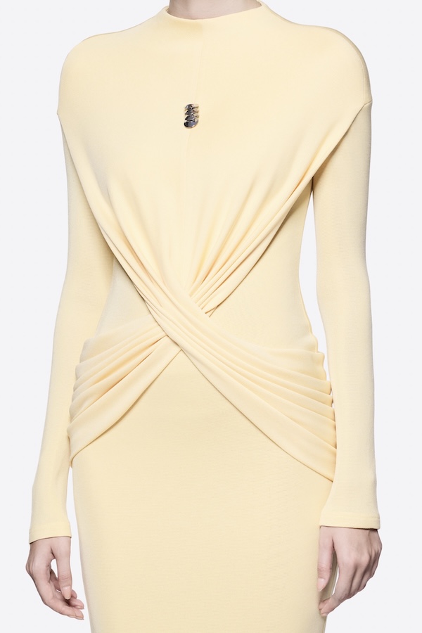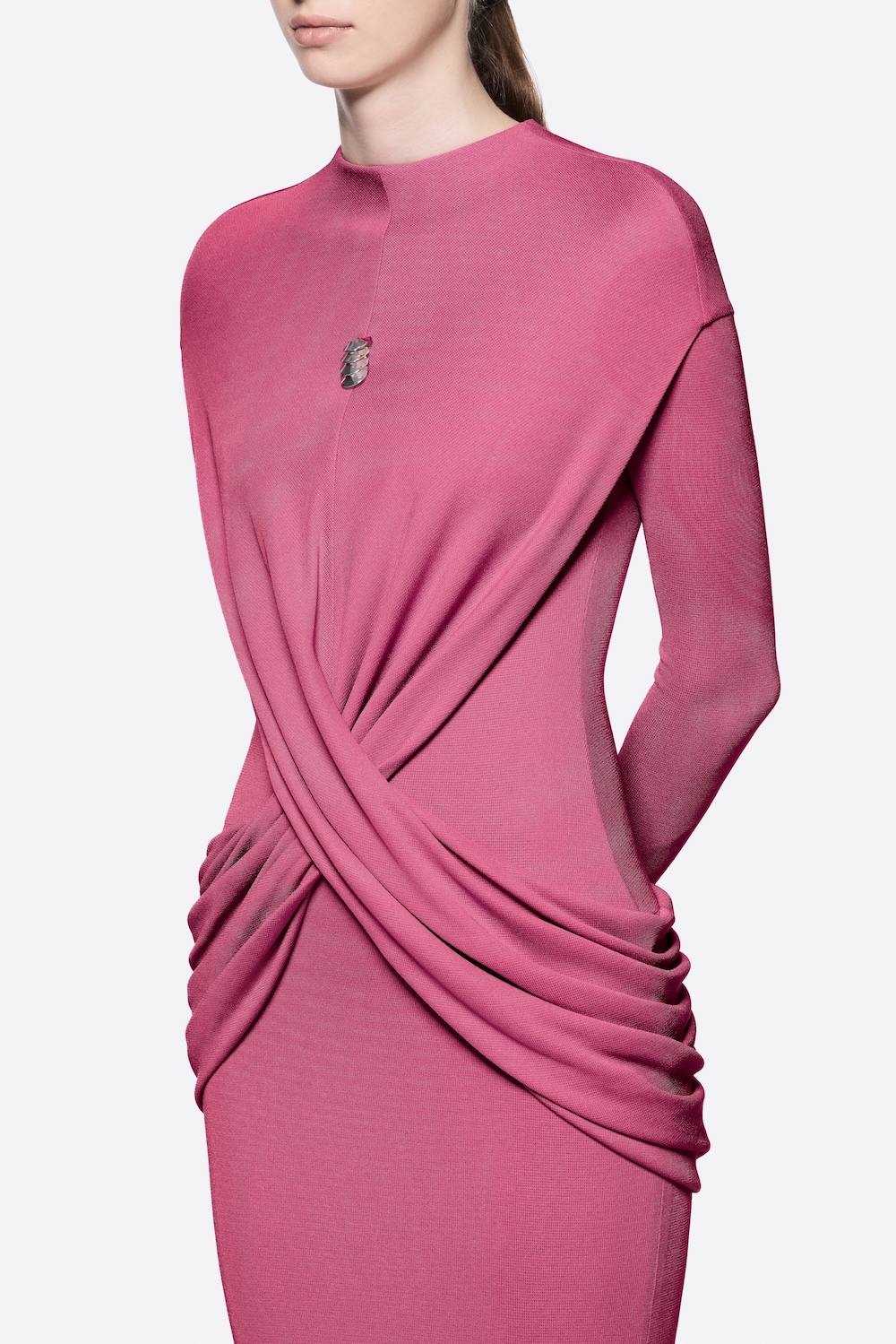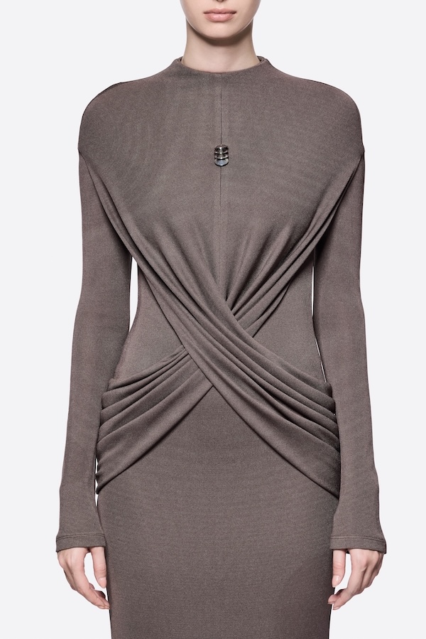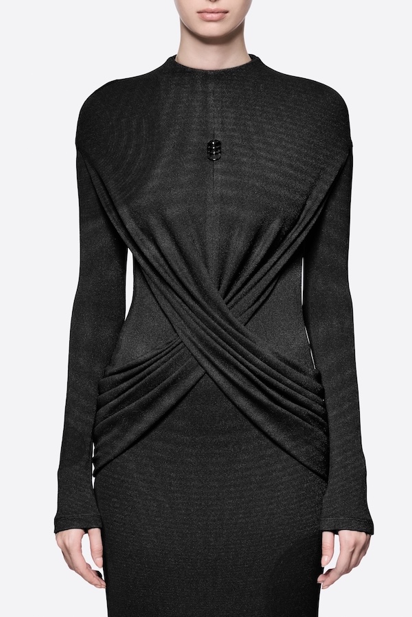 – Detail: Long sleeves, Diagonal draping details on the body, metallic detail