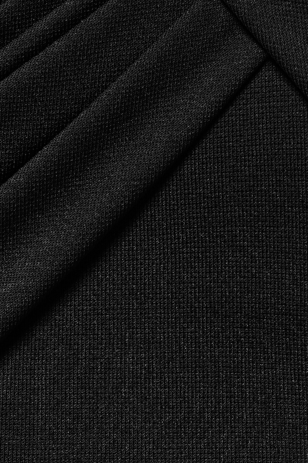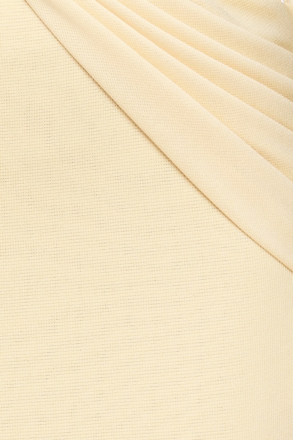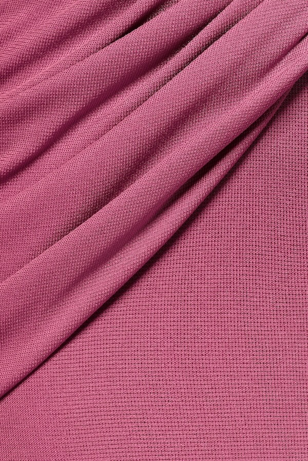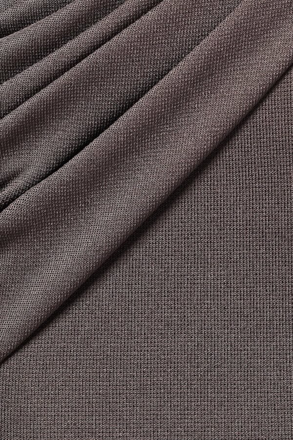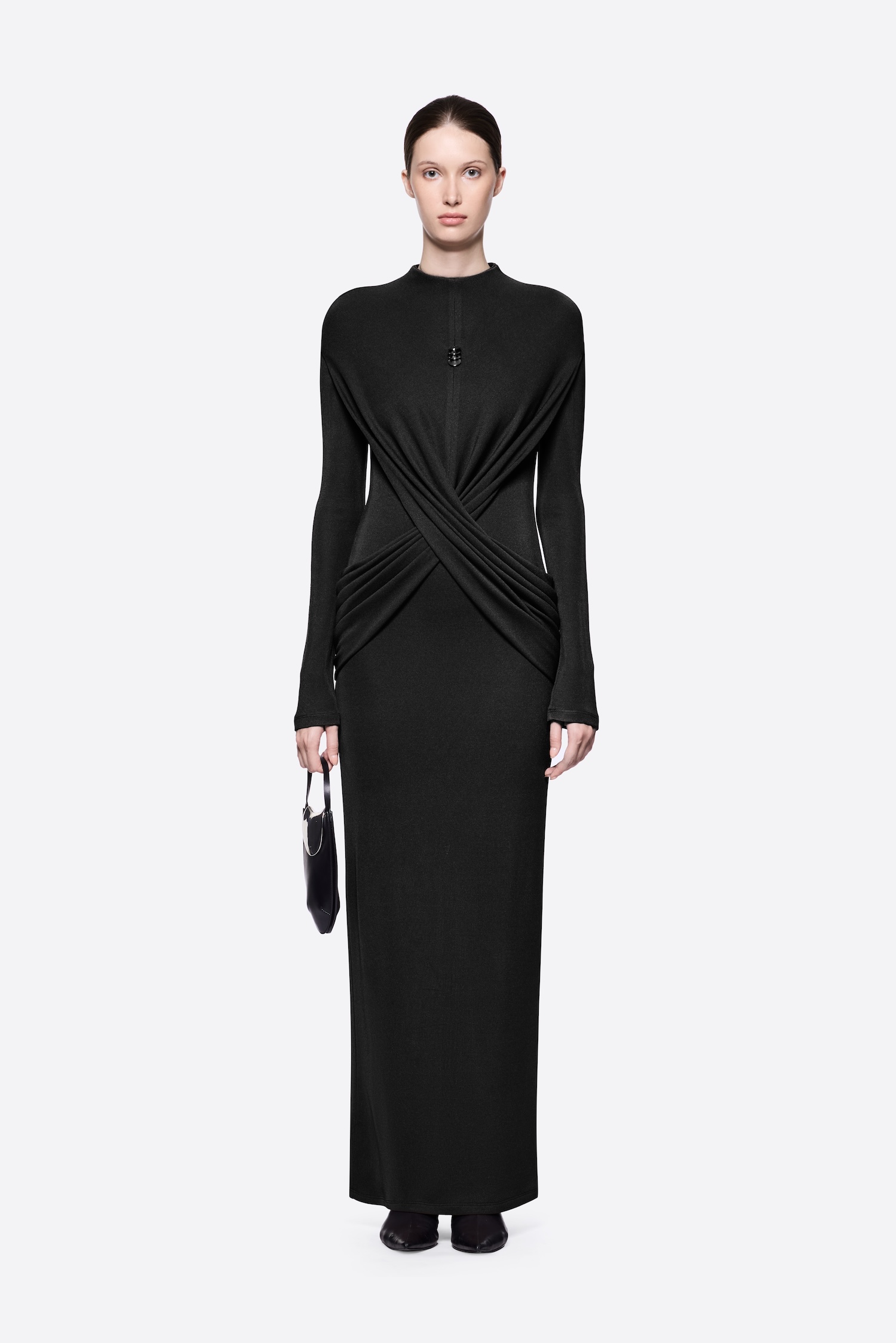 – Detail: Long sleeves, Diagonal draping details on the body, metallic detail