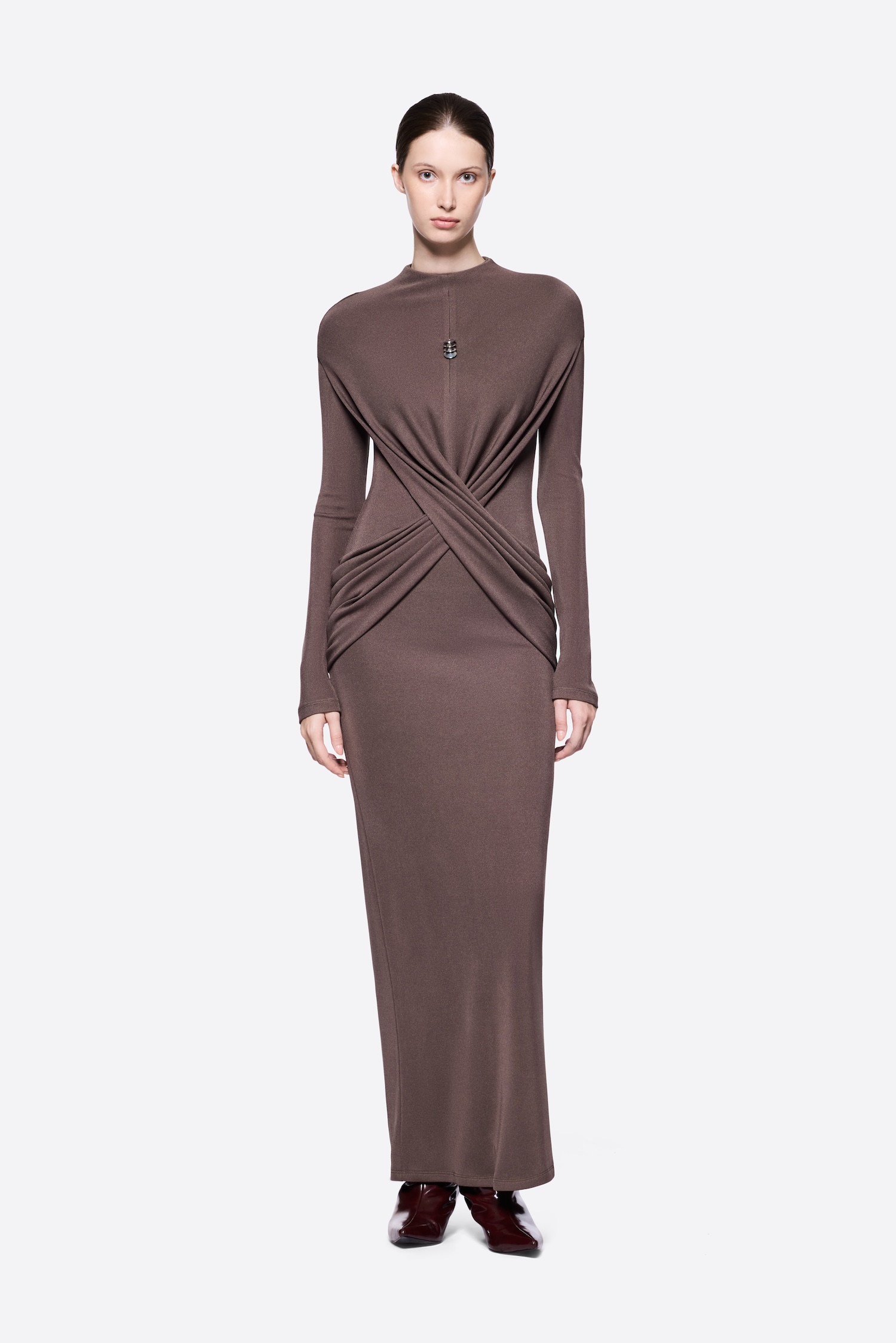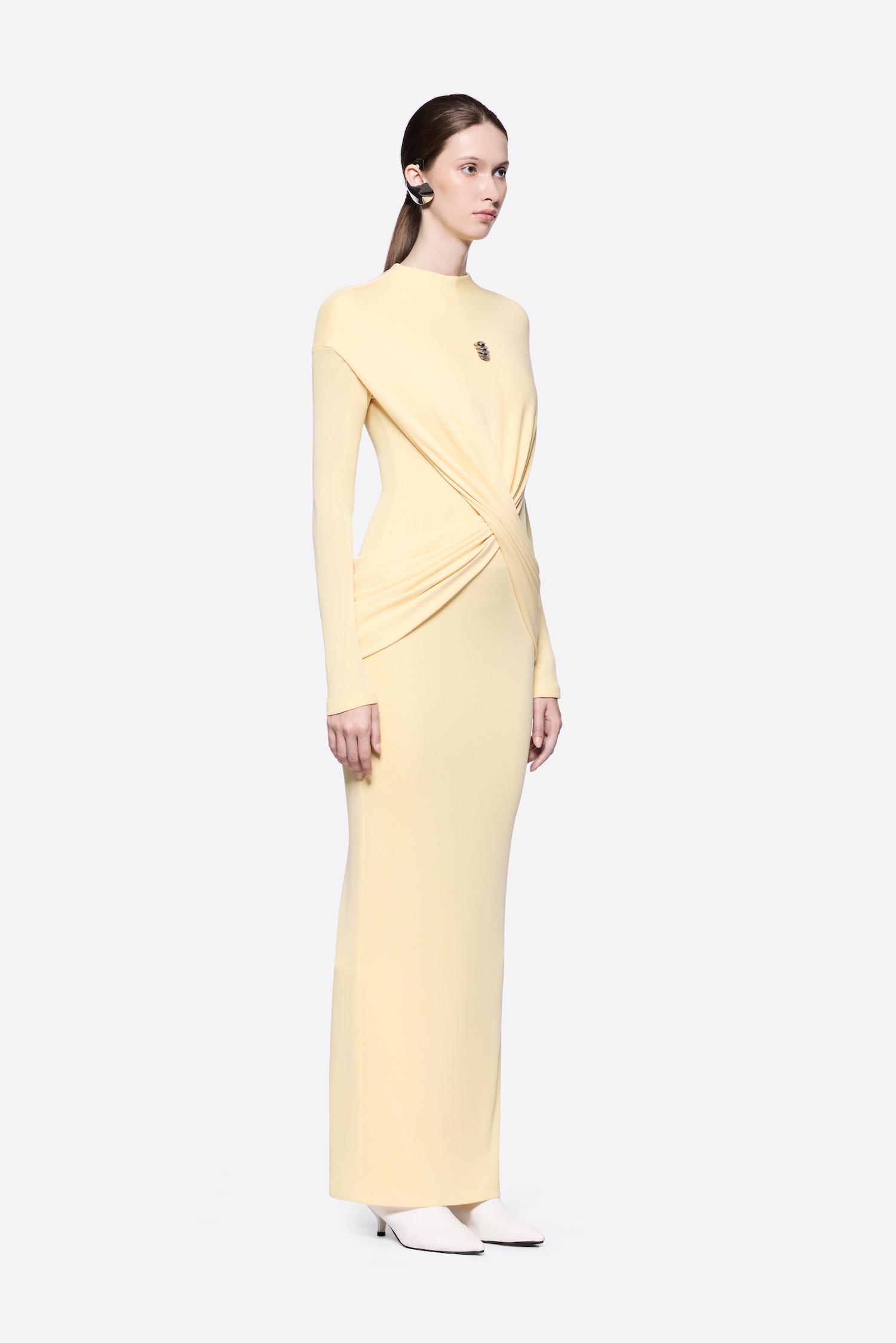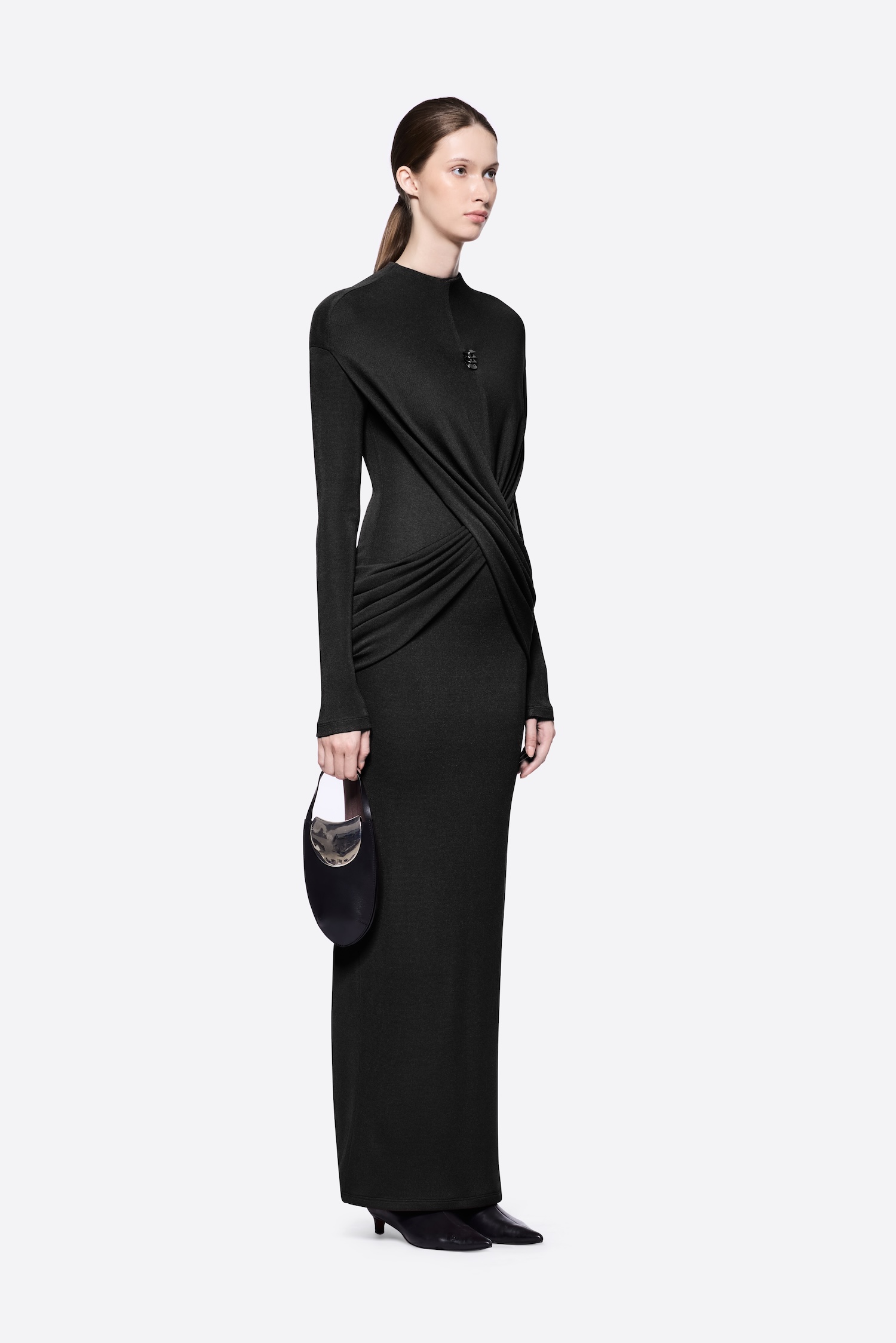 Form-fitting long dress with diagonal draping on the body and metalic detail