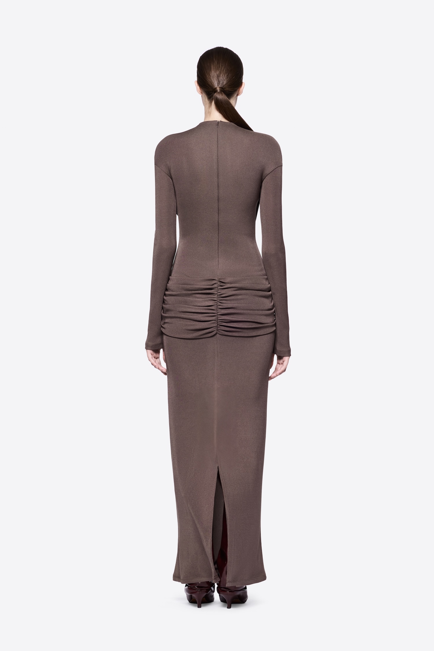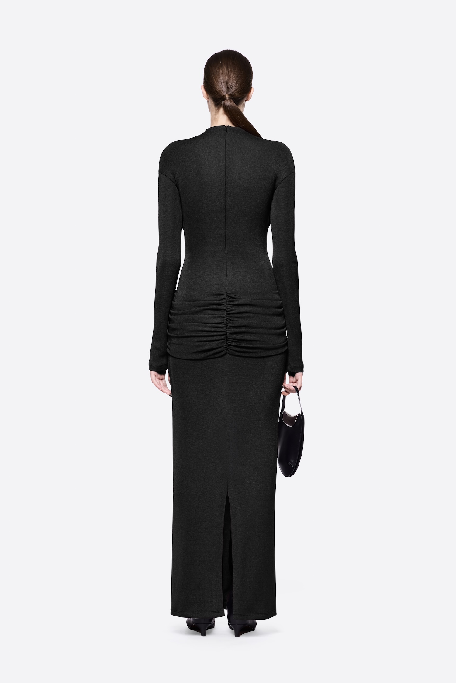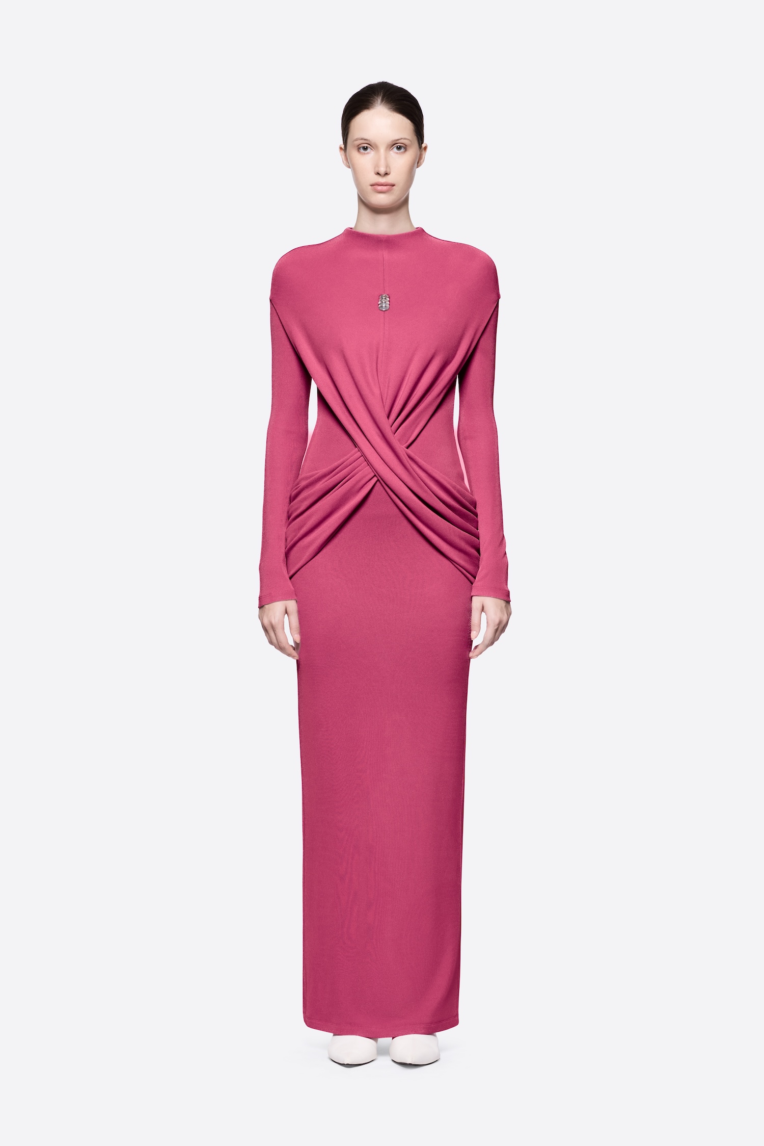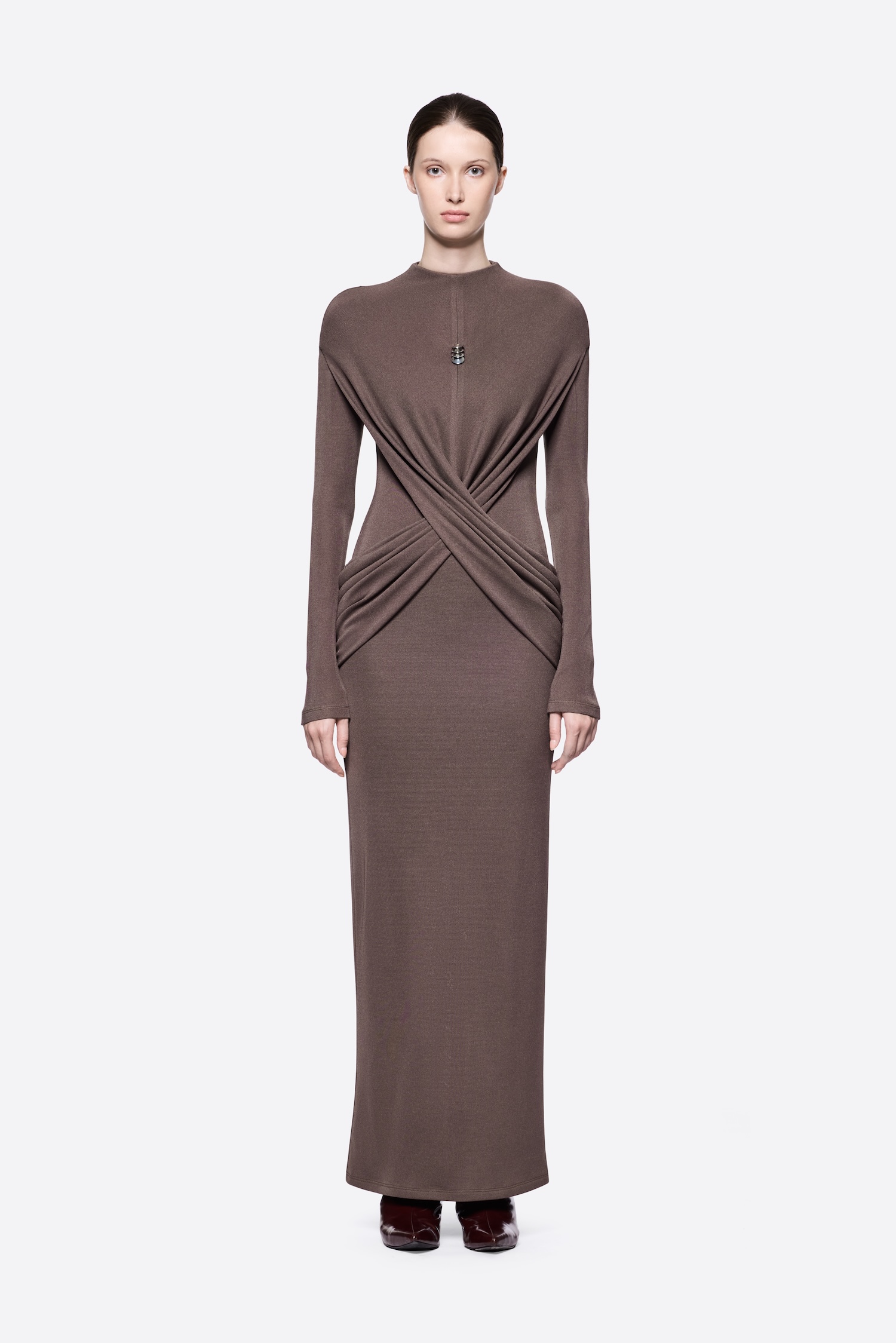 Form-fitting long dress with diagonal draping on the body and metalic detail