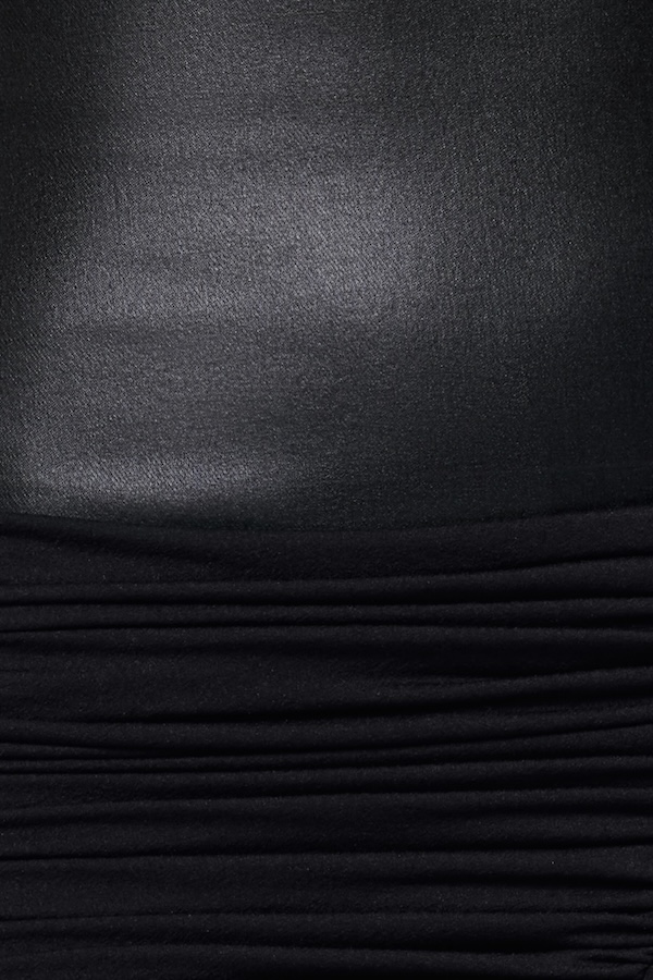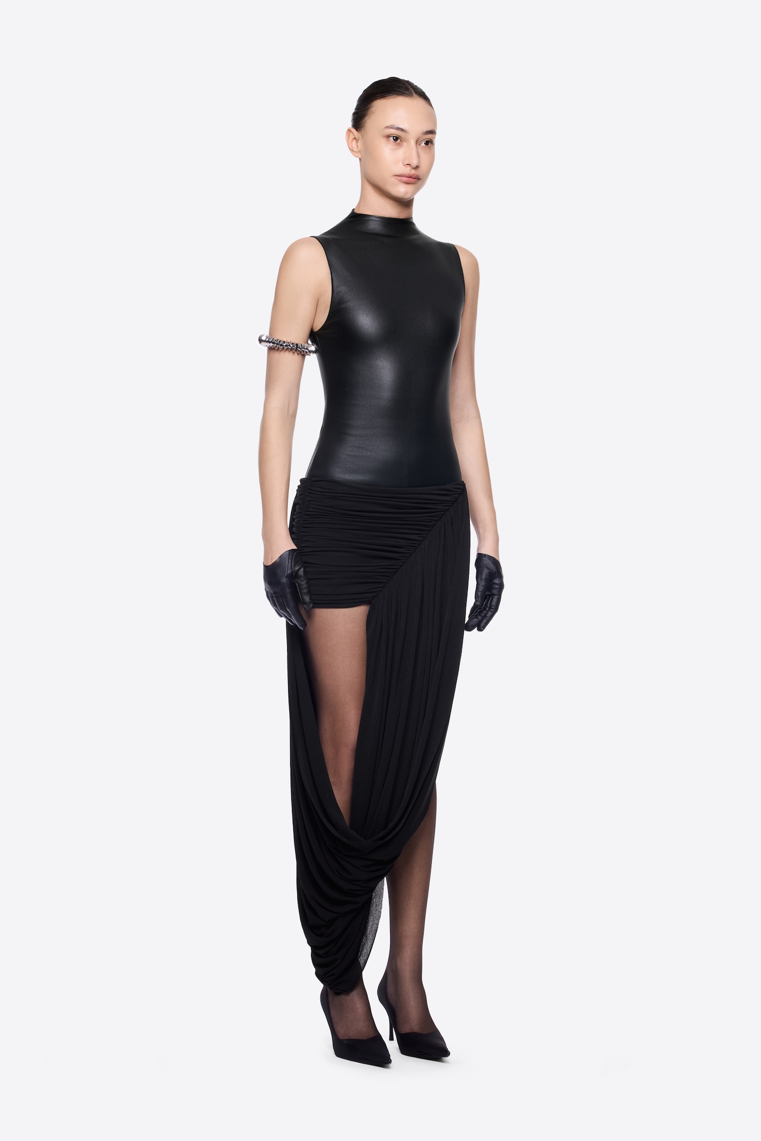 Form-fitting sleeveless dress with asymmetrical hip draping details