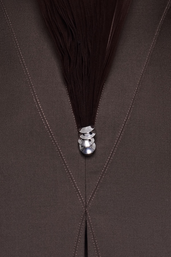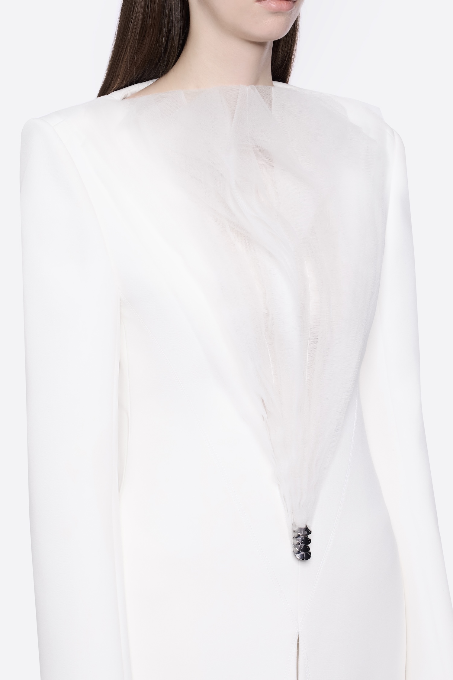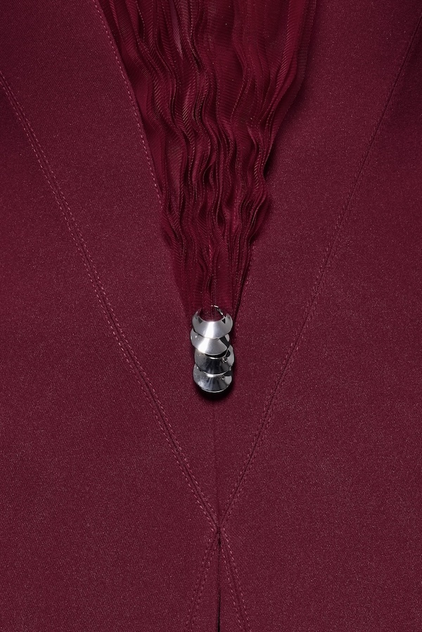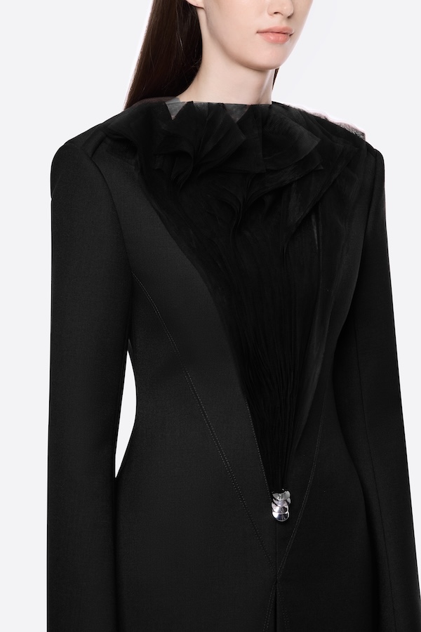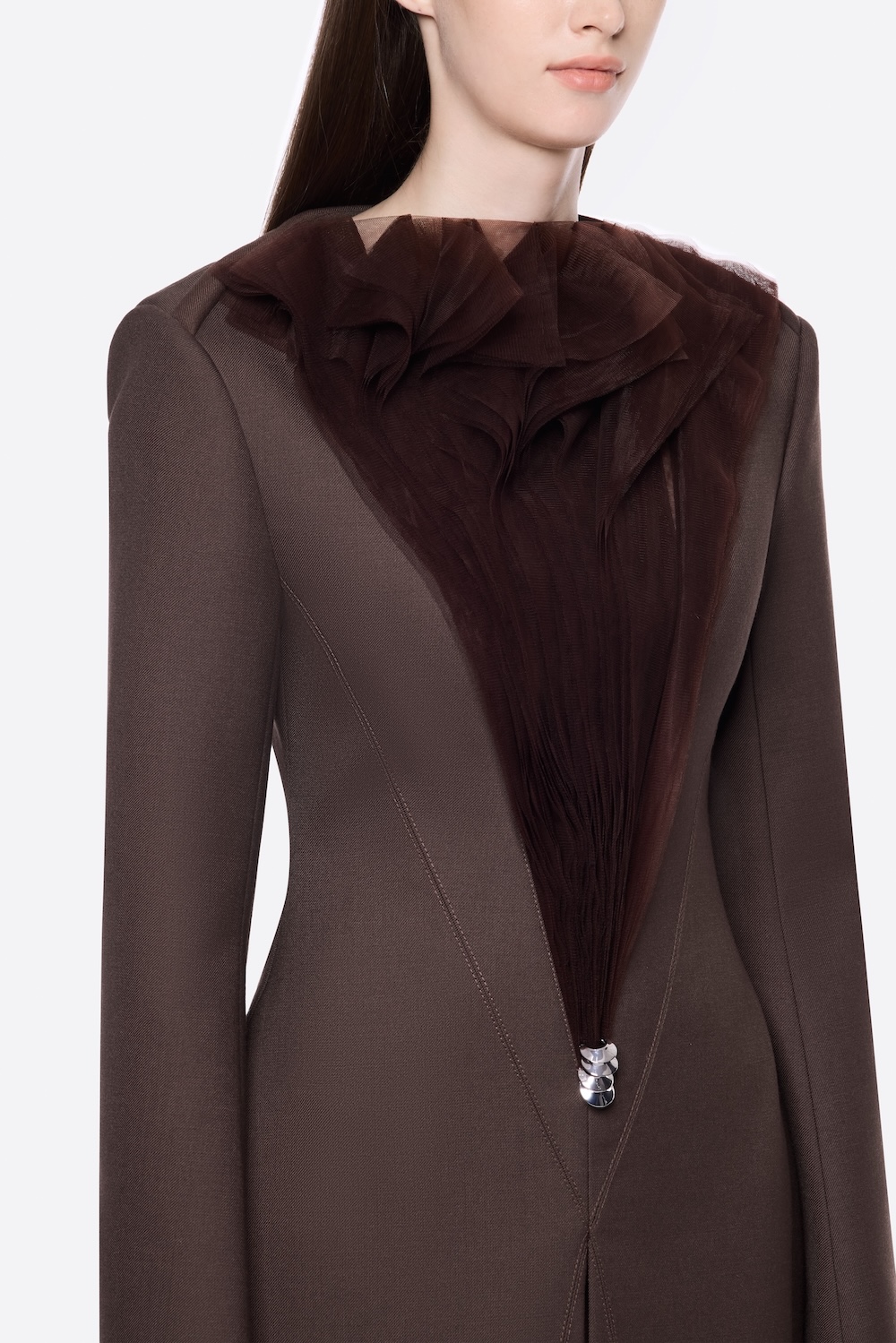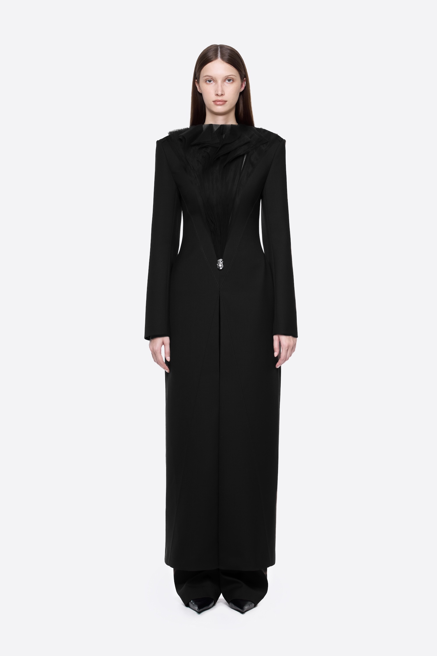 Form-fitting coat with triangular shaped sheer module, symmetrical raised stitches and metalic detail
