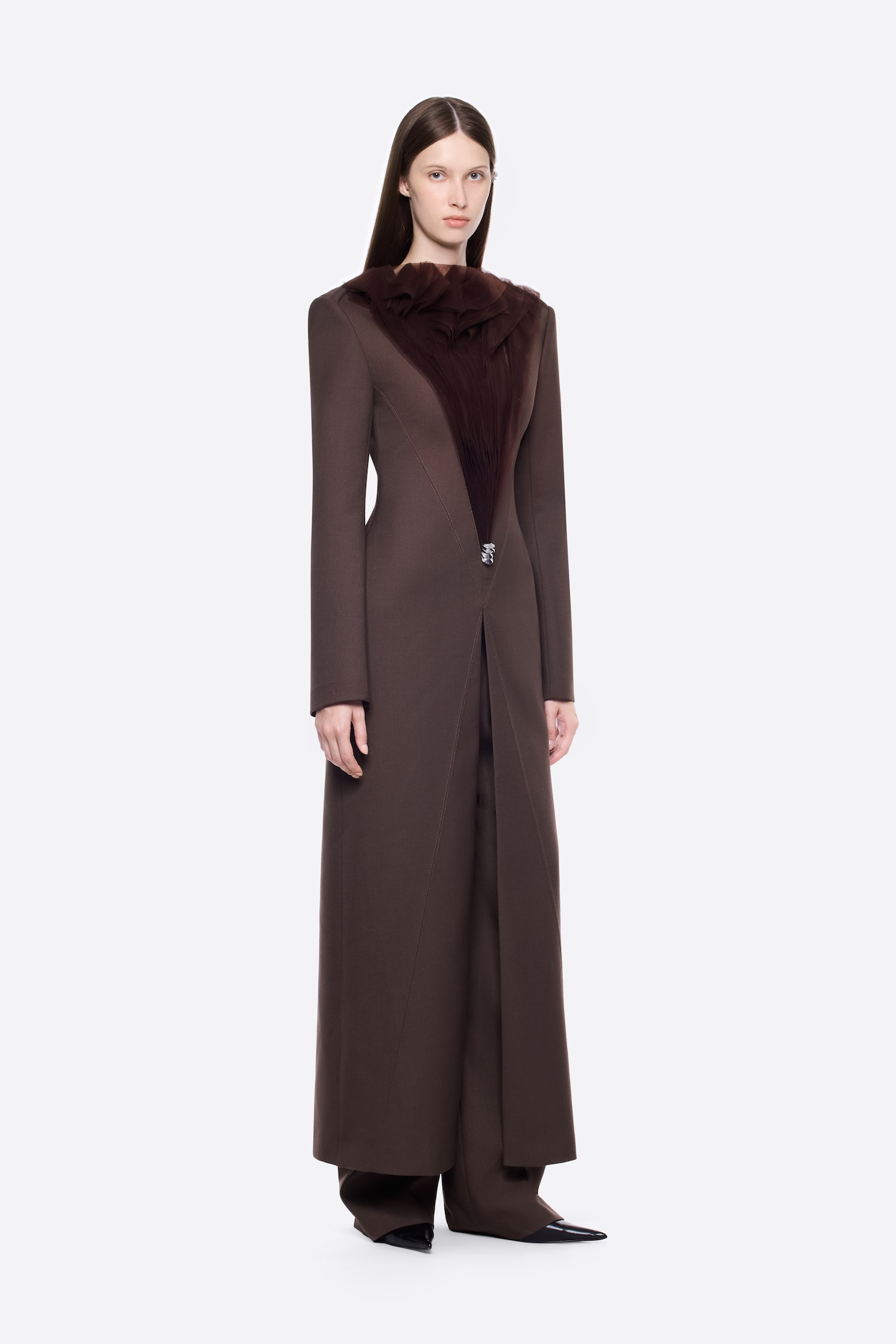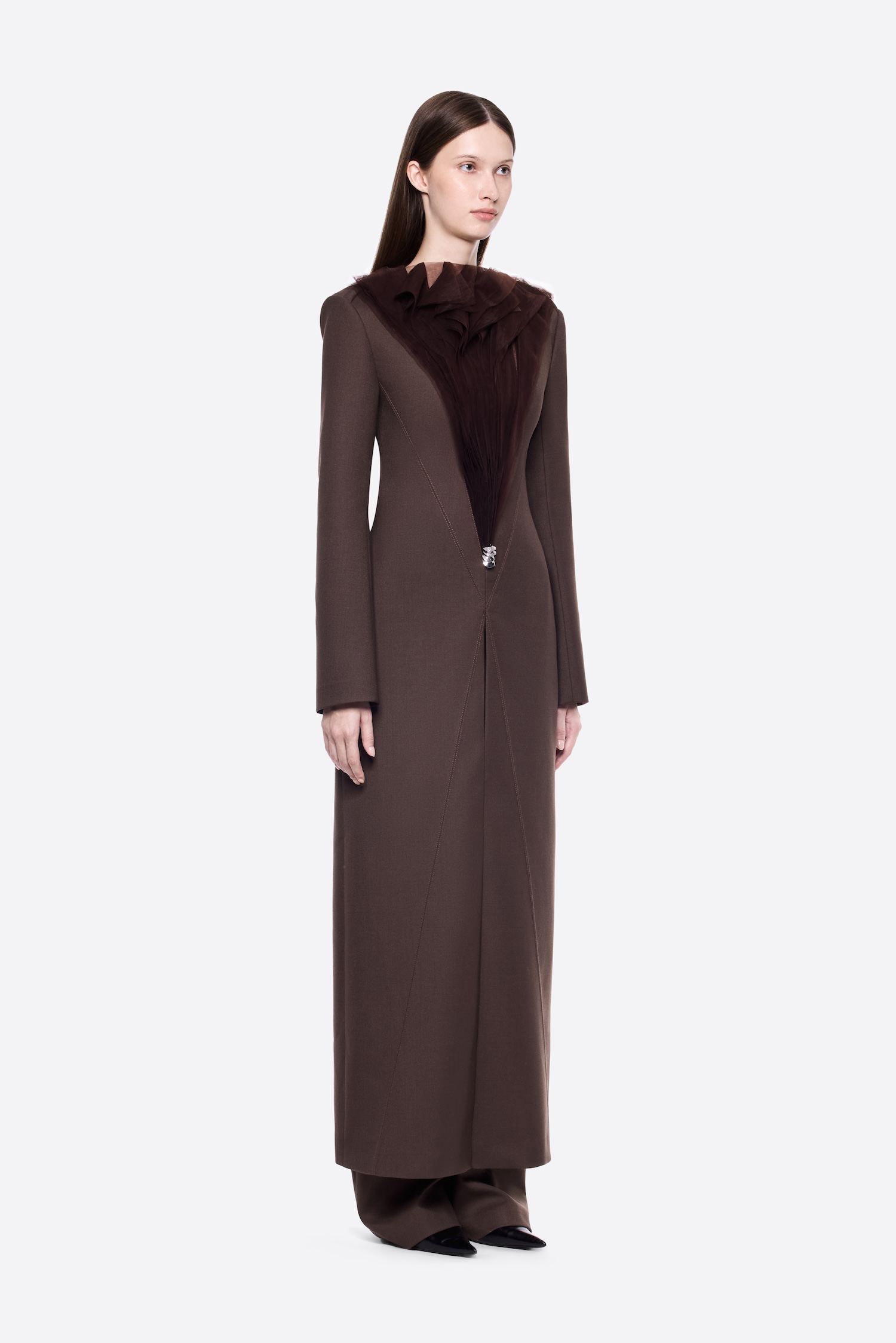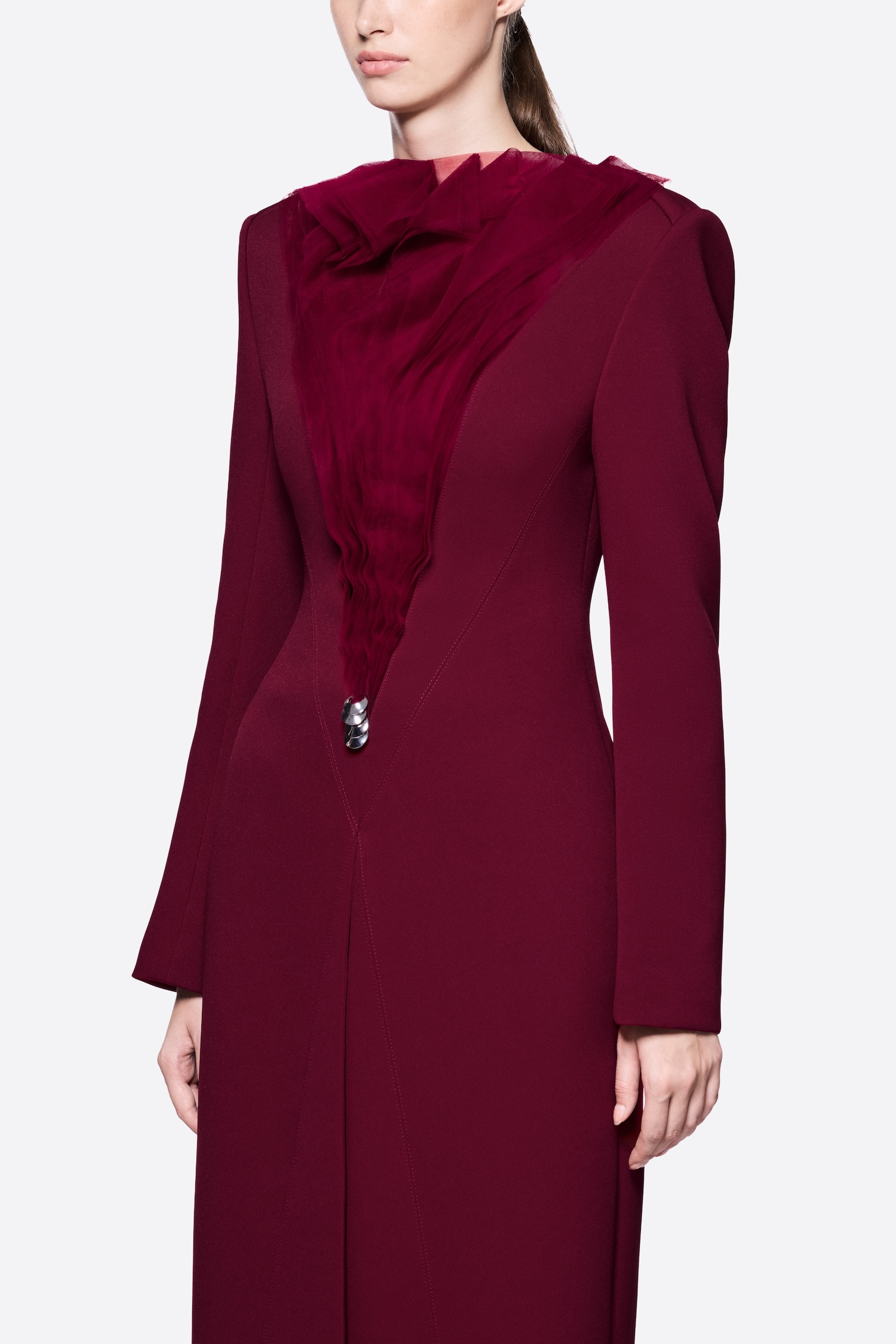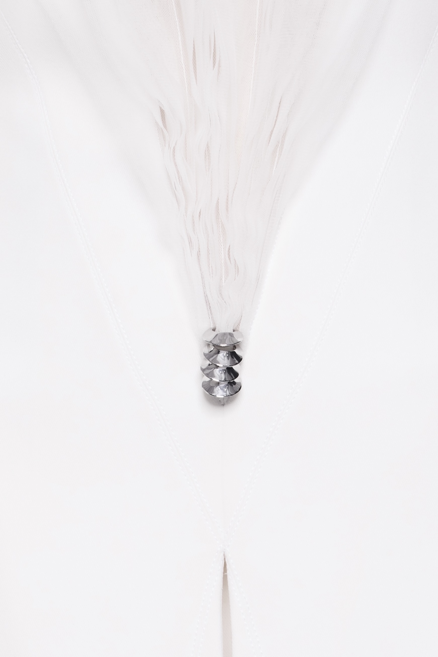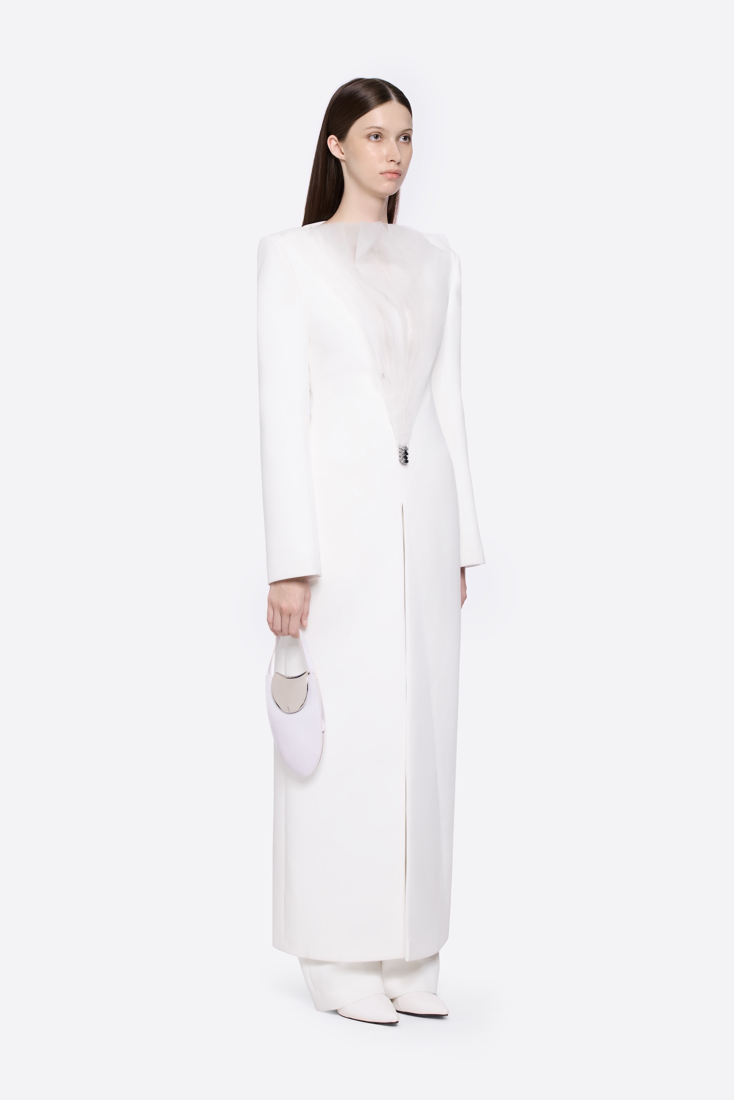 Form-fitting coat with triangular shaped sheer module, symmetrical raised stitches and metalic detail