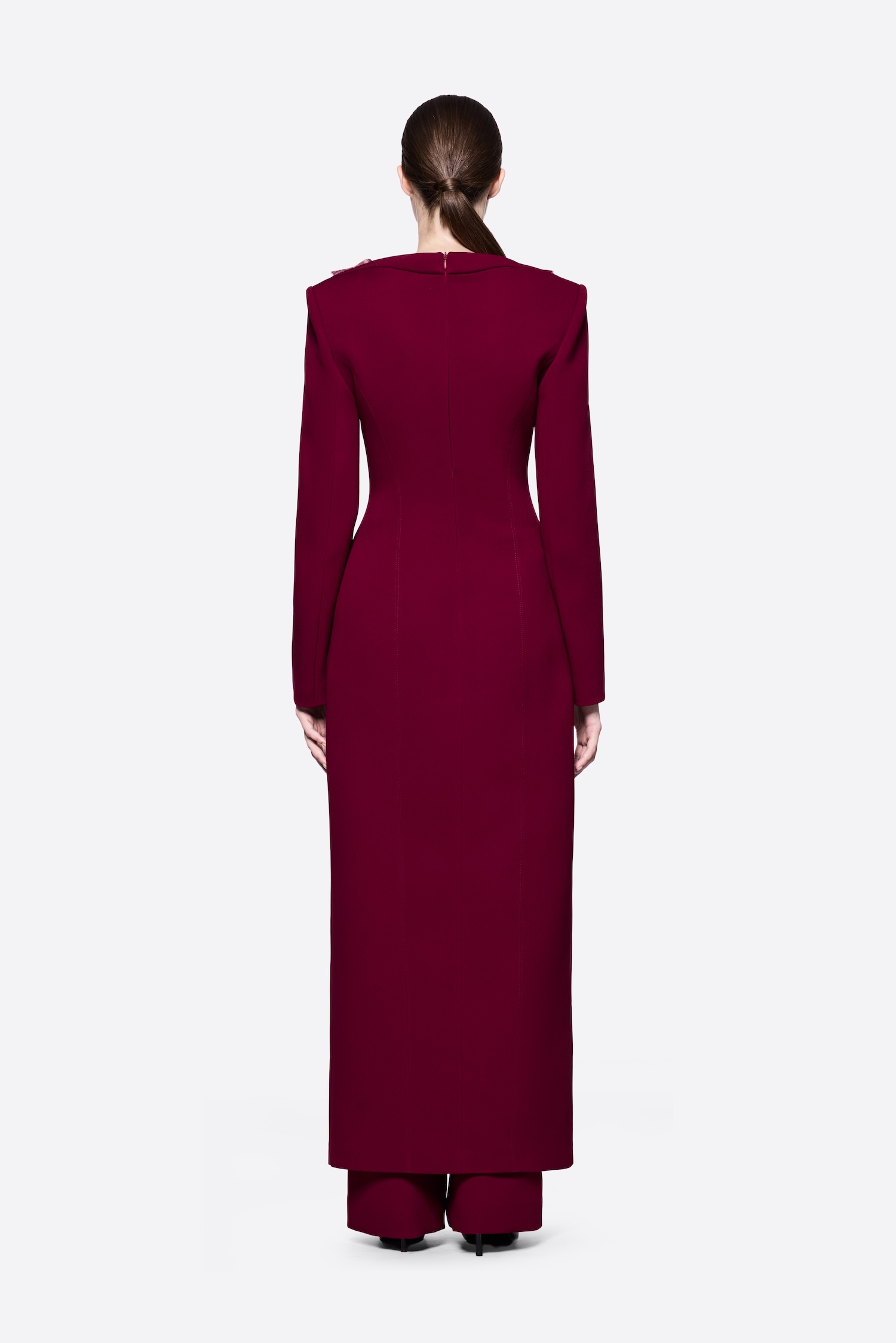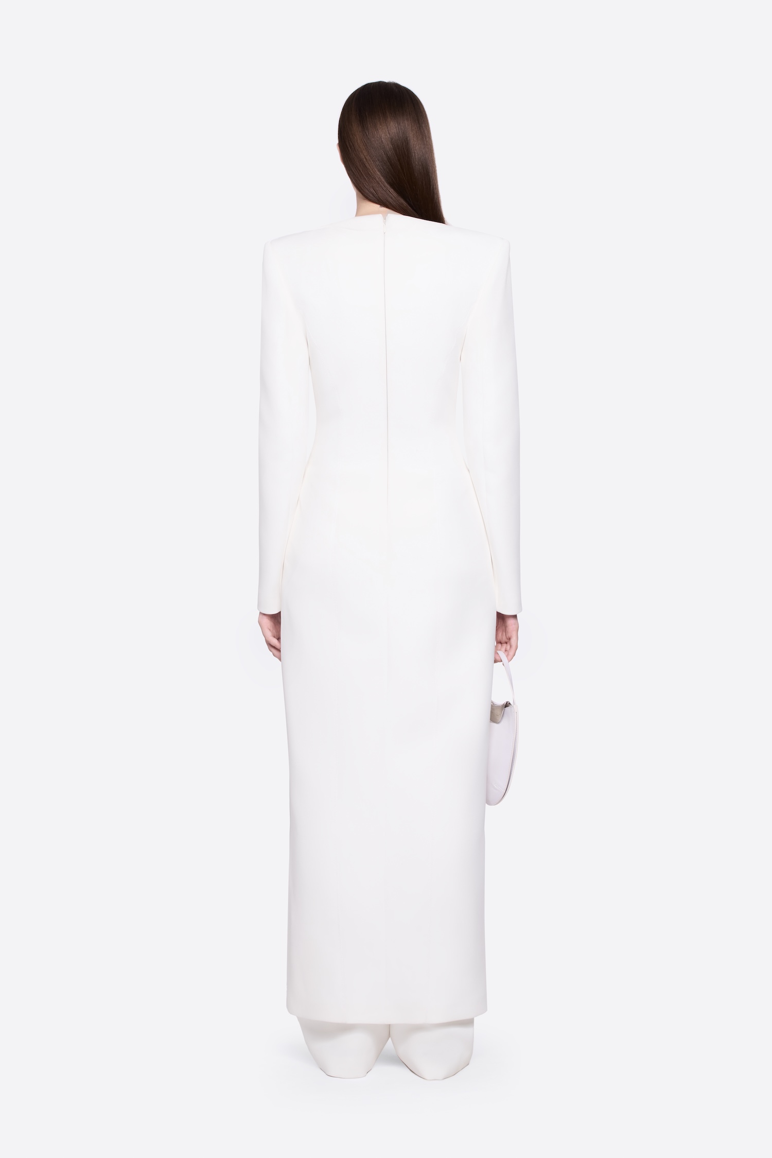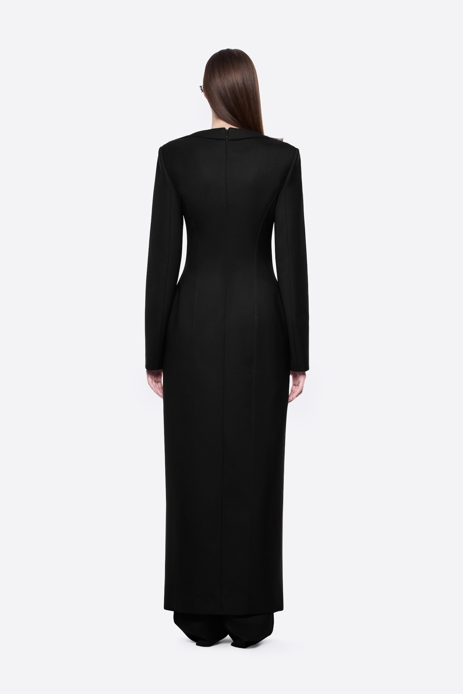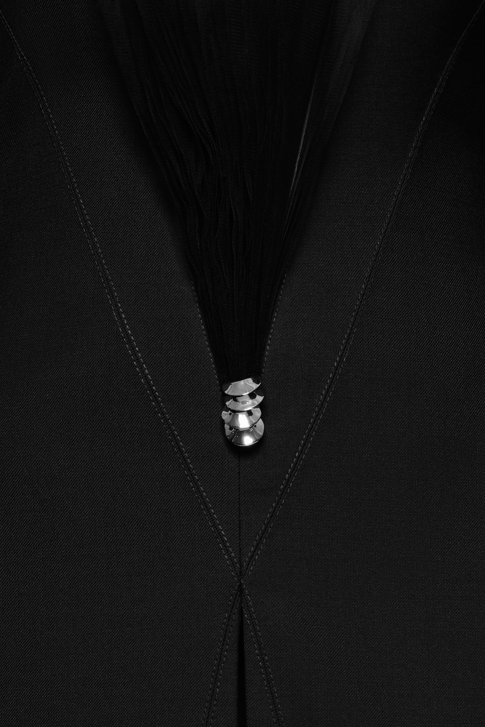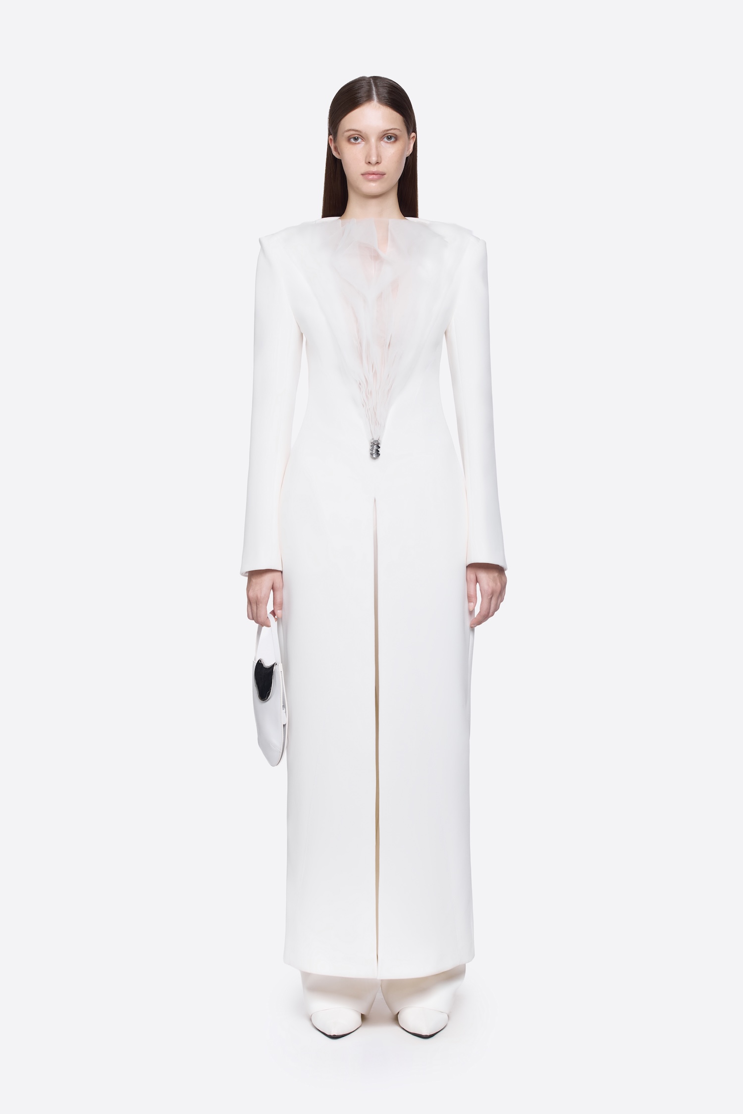 Form-fitting coat with triangular shaped sheer module, symmetrical raised stitches and metalic detail