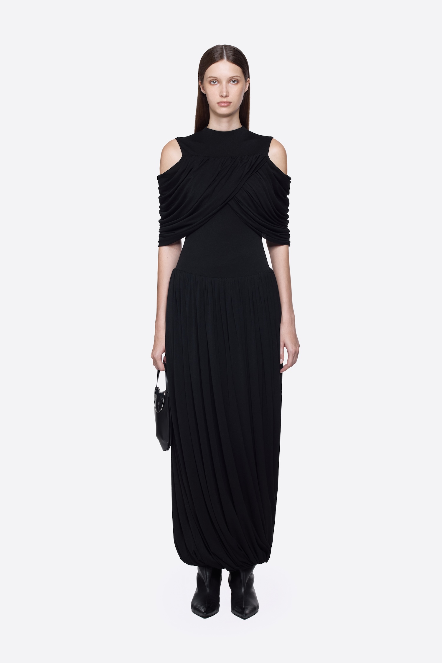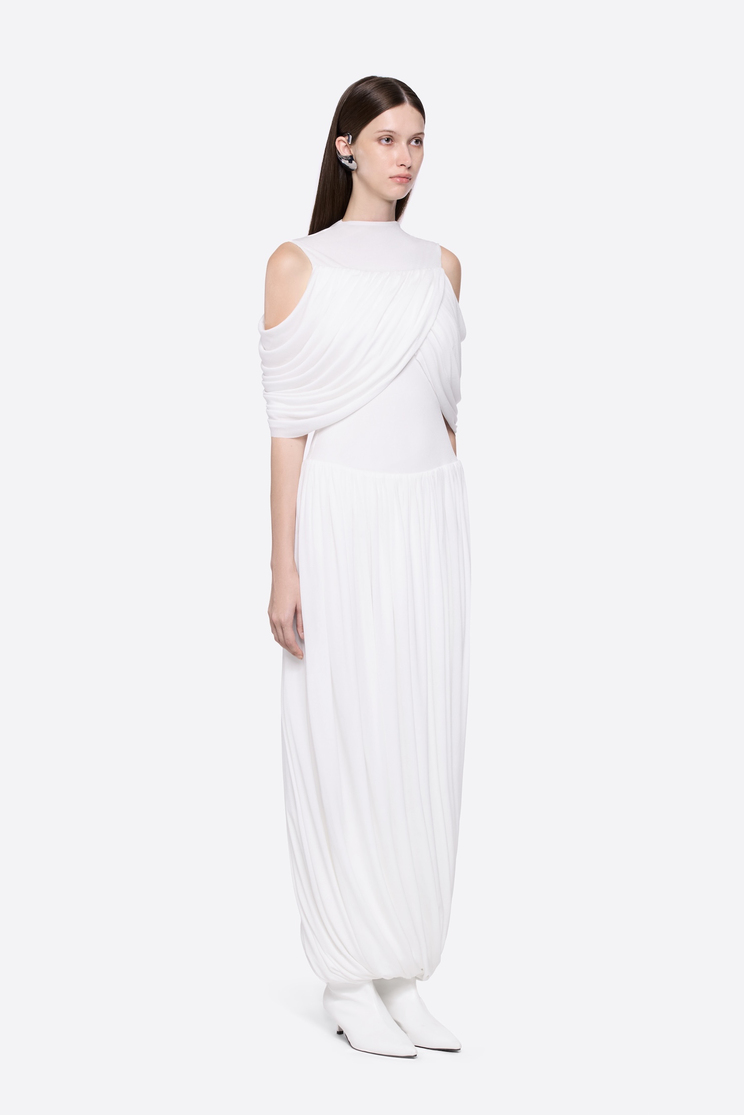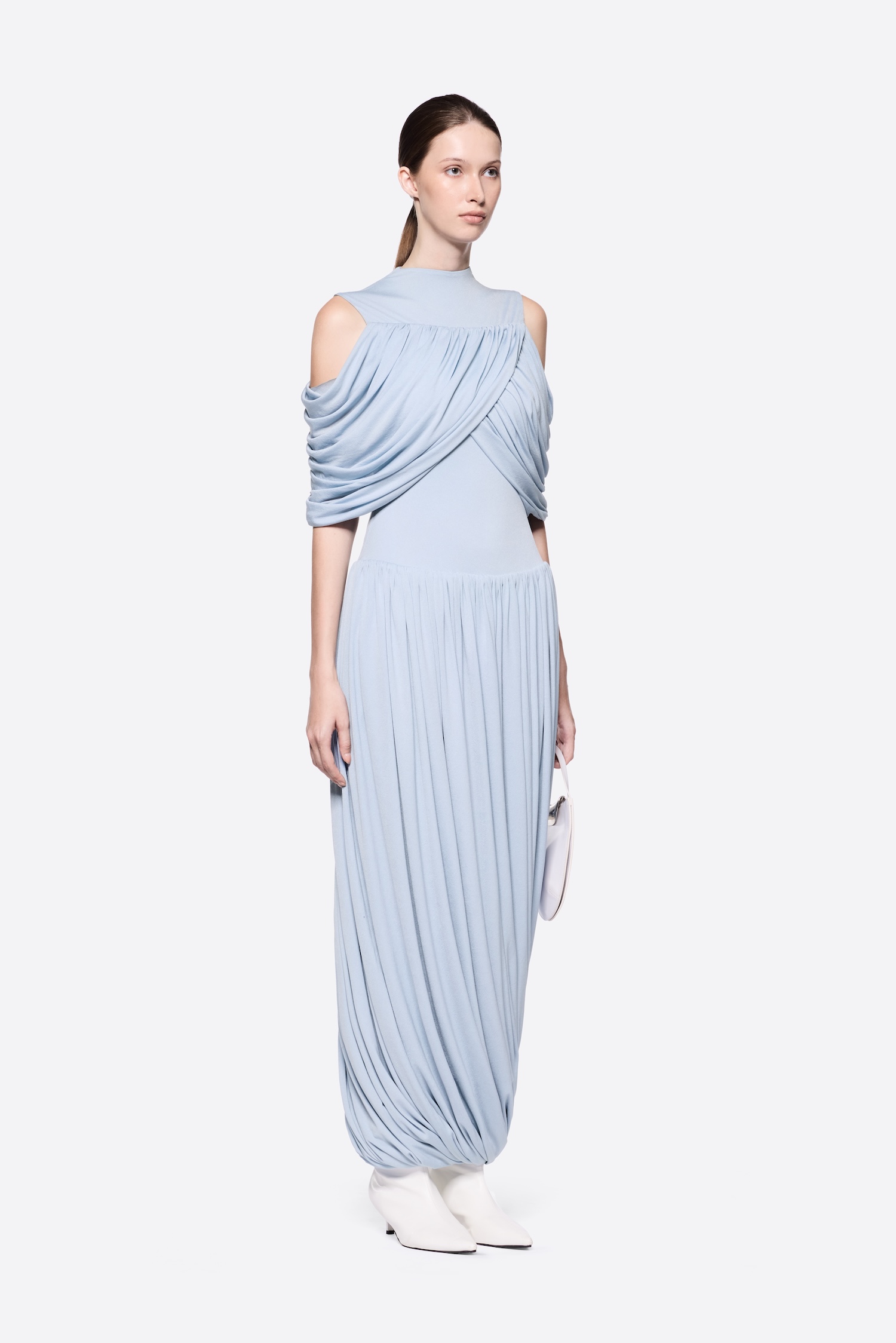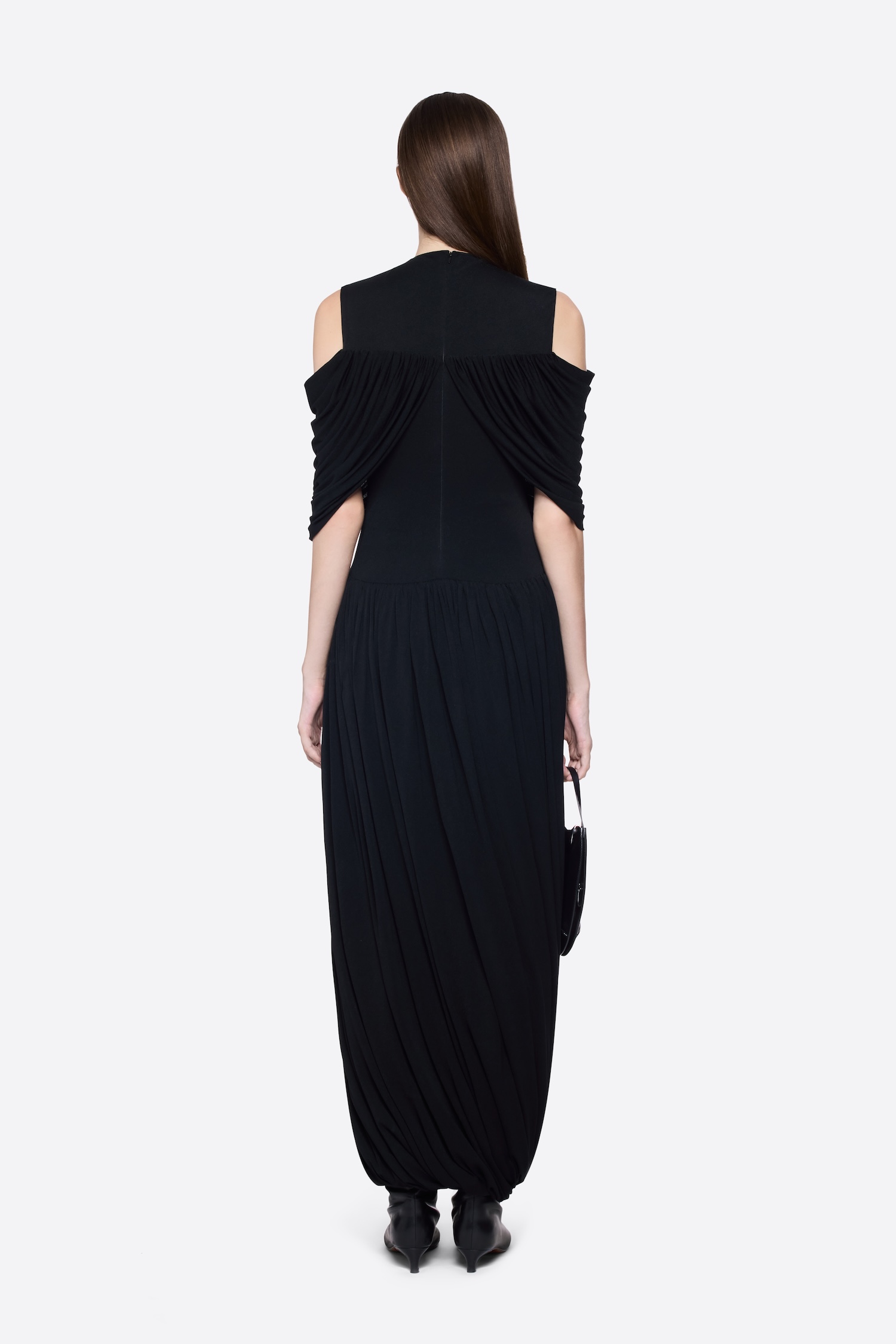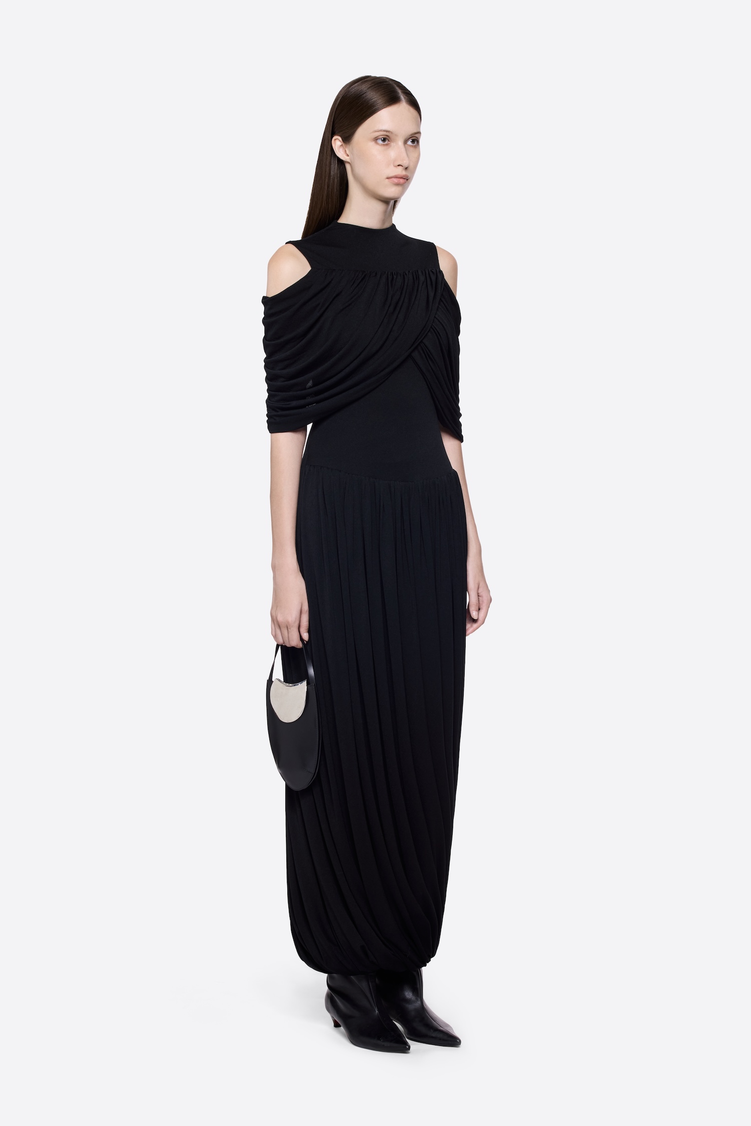 Long dropped-waist dress with circular draped skirt and symmetrical cutouts on the shoulder
