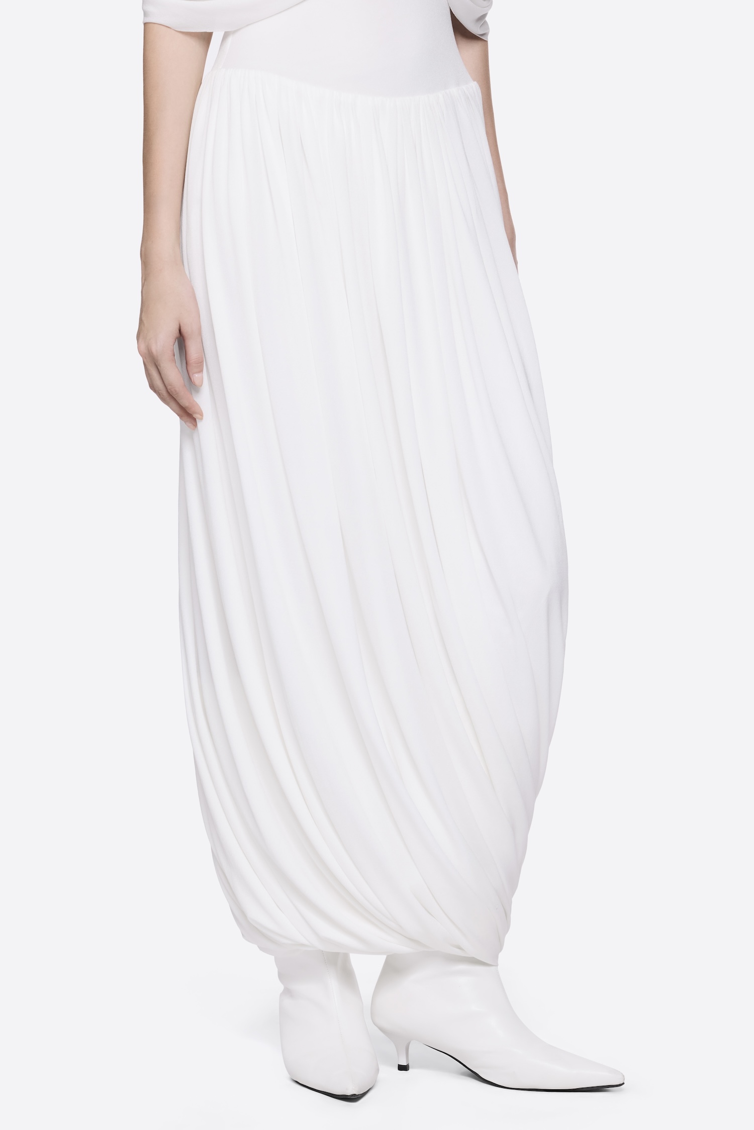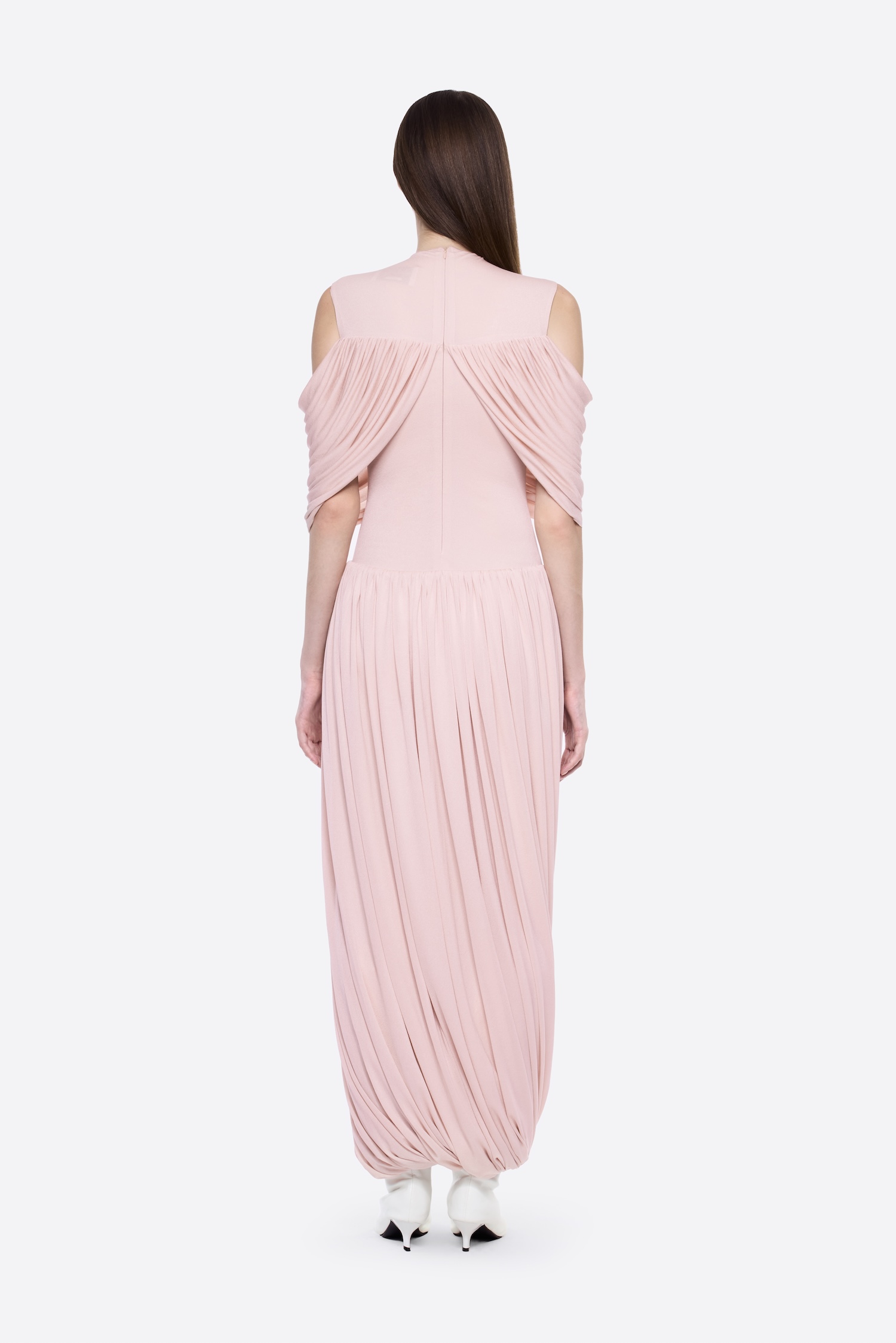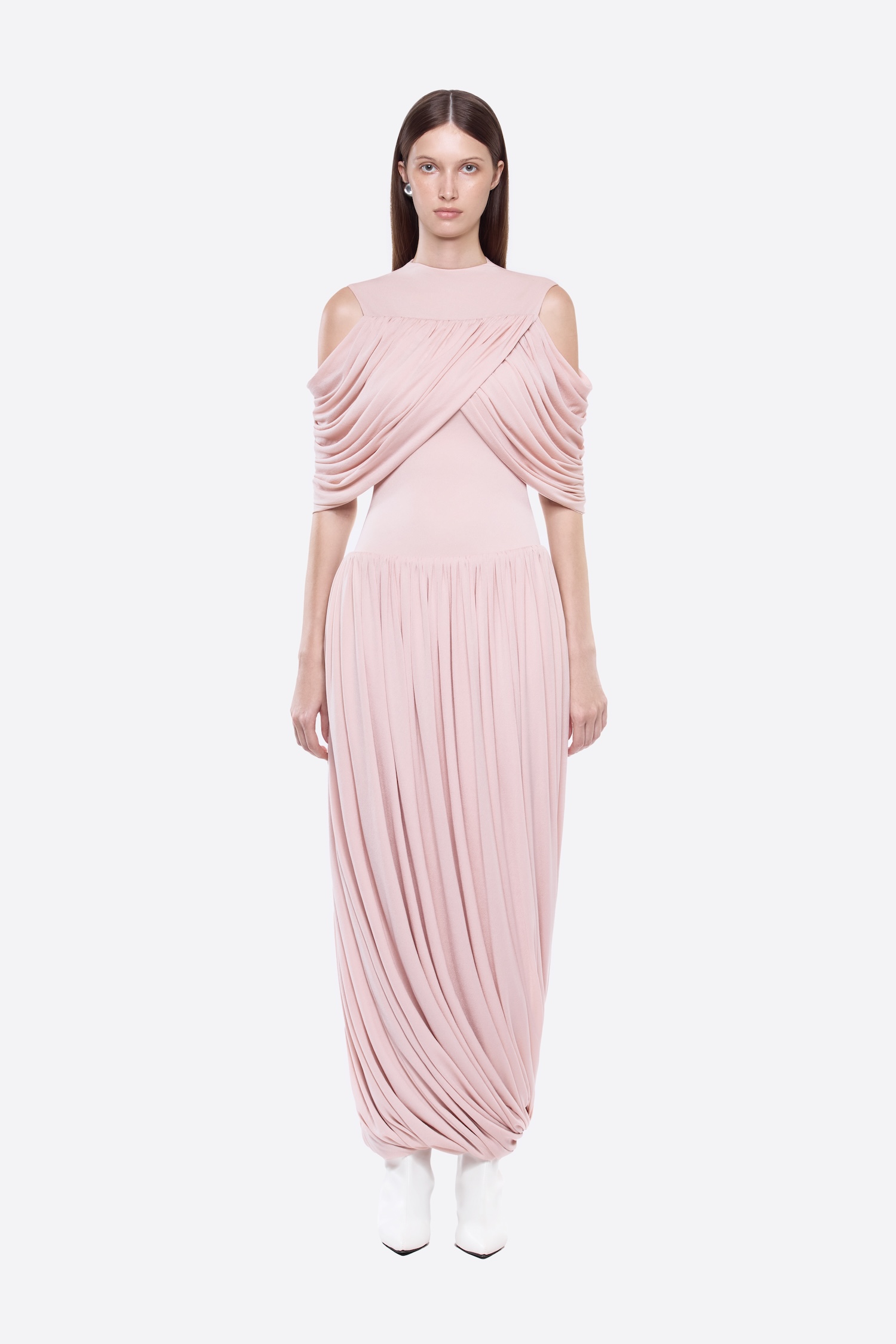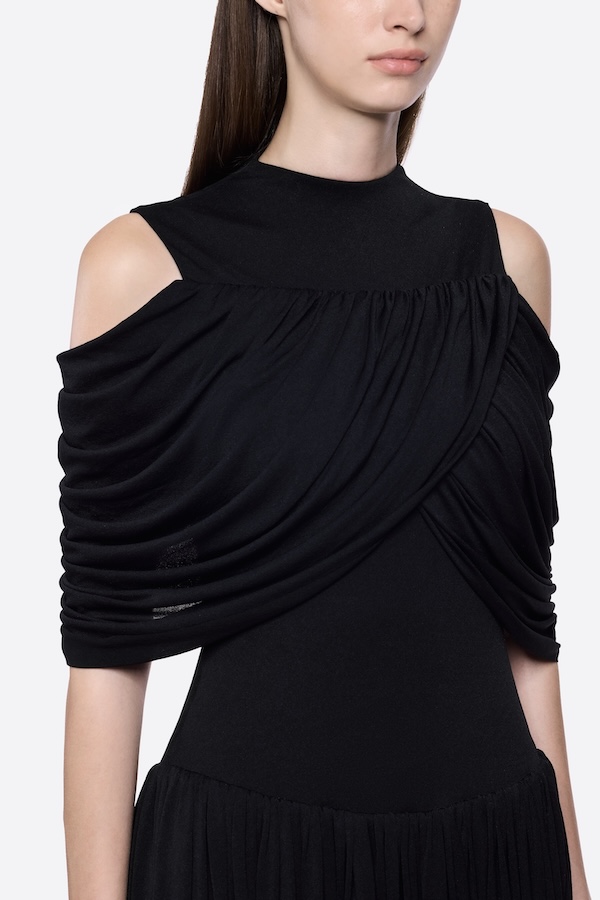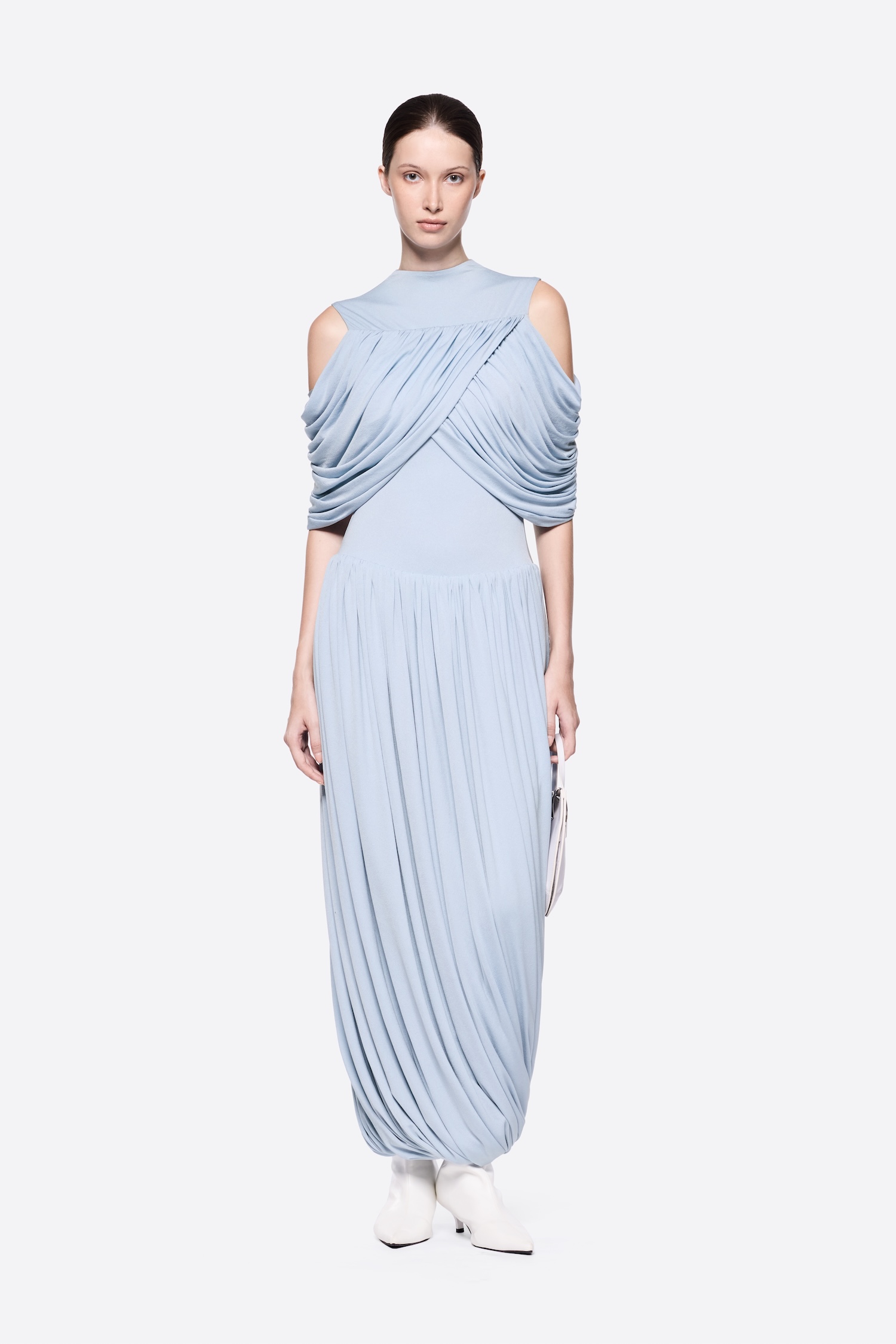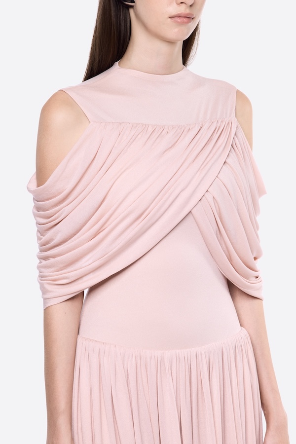 Long dropped-waist dress with circular draped skirt and symmetrical cutouts on the shoulder