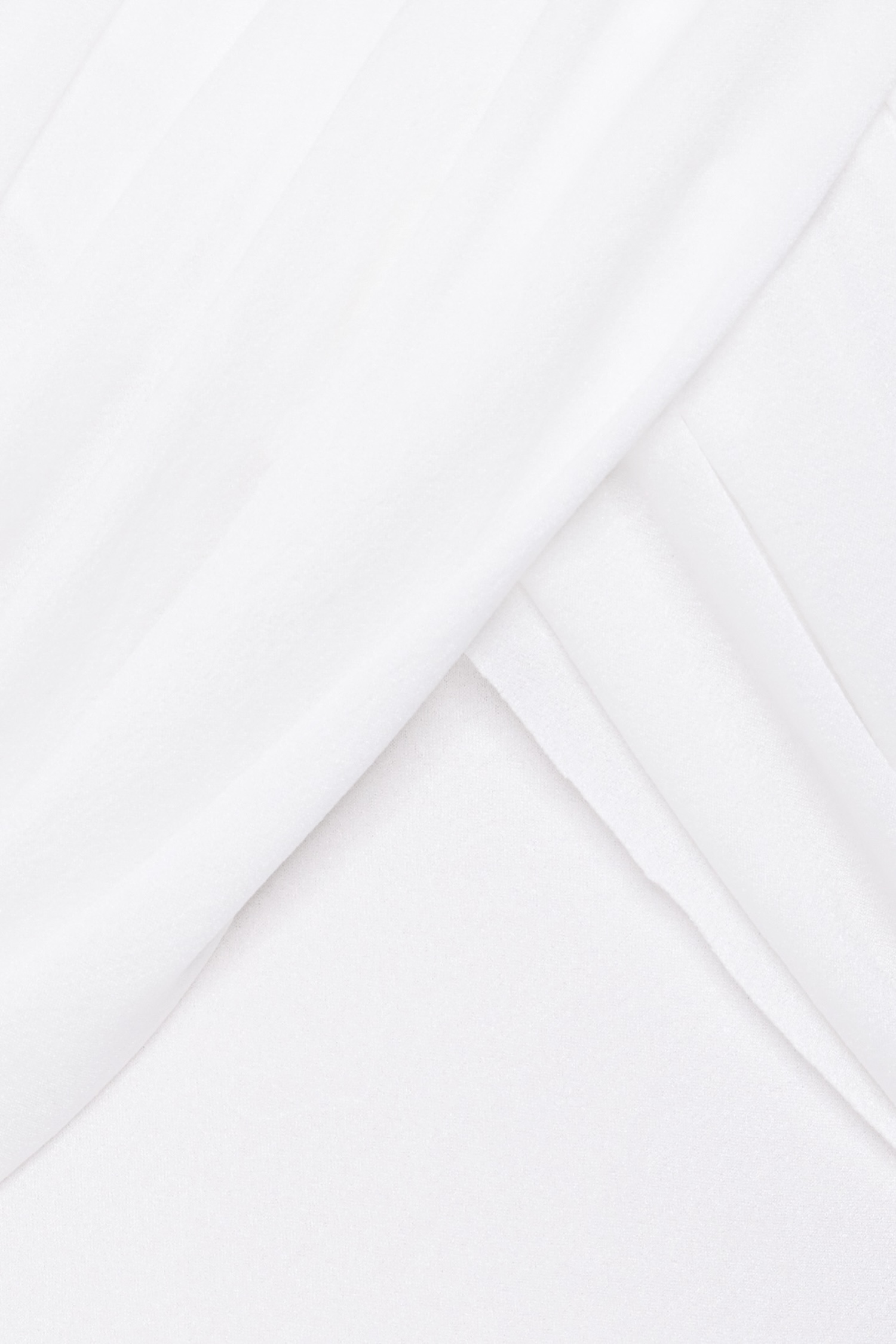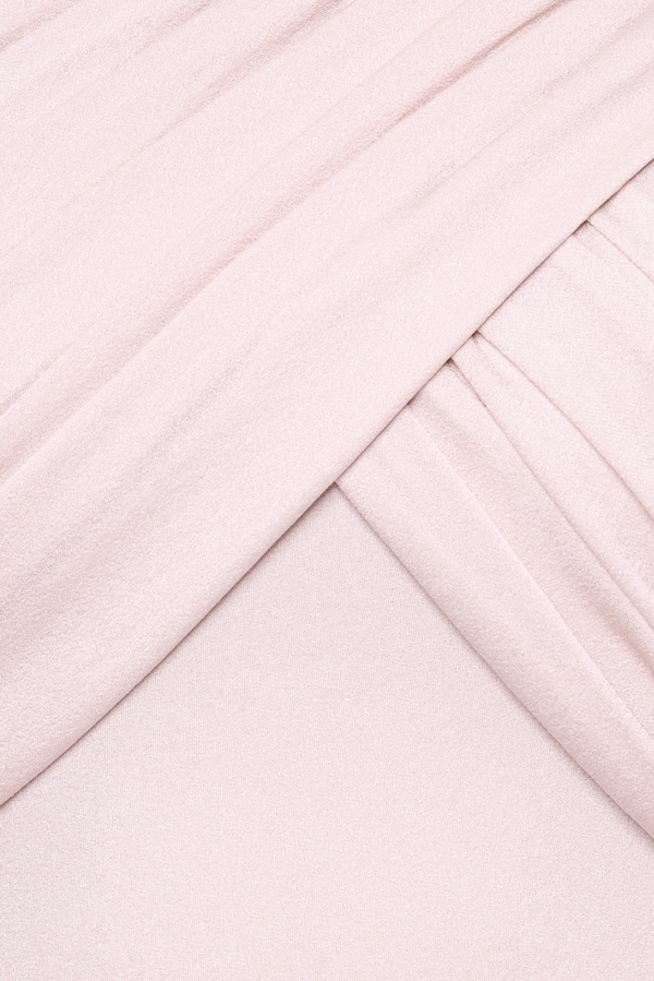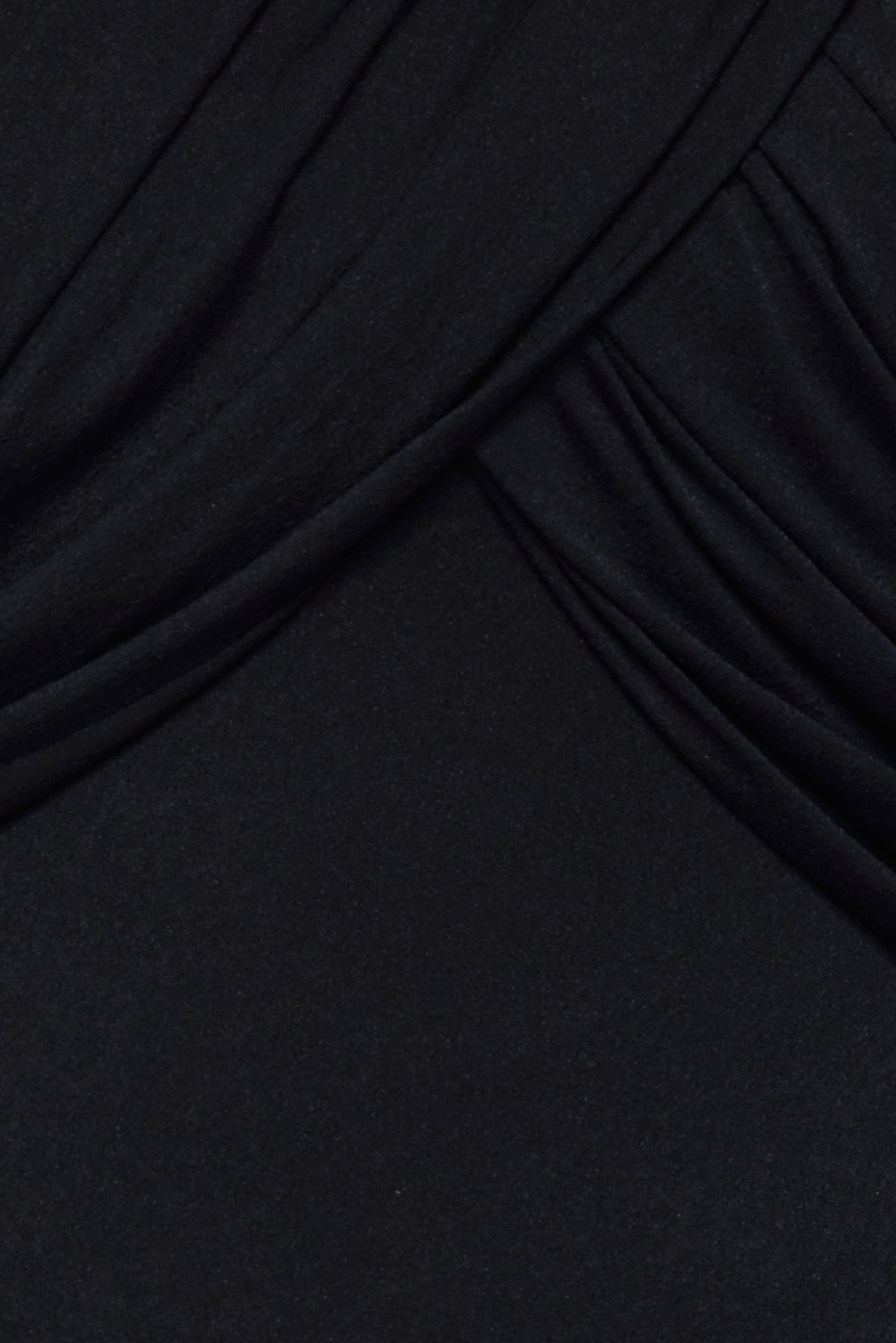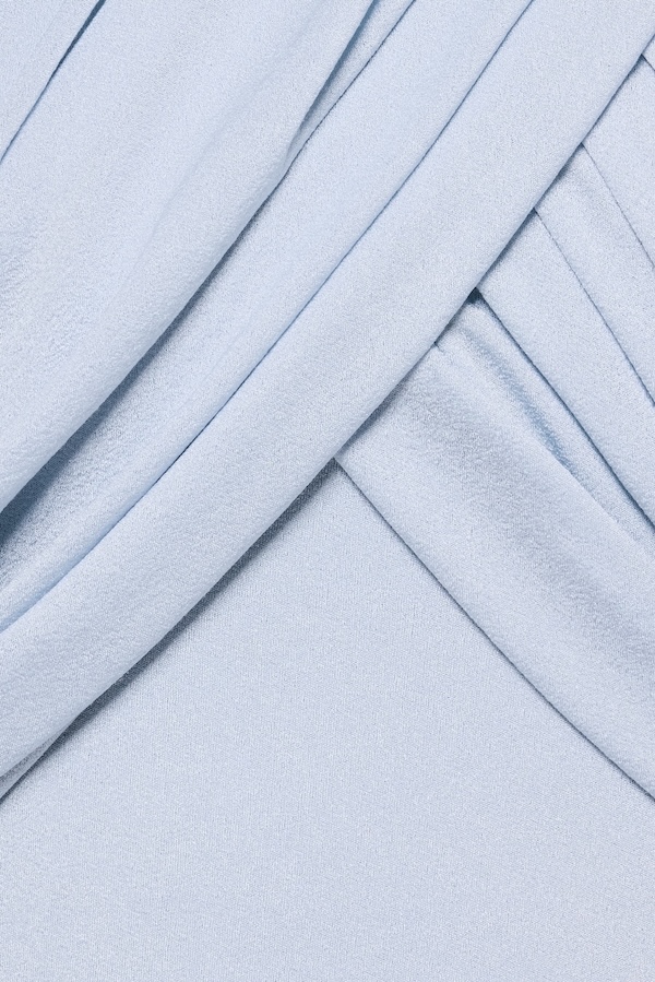 – Detail: Circular twisted lower train, Cross-draped details at bust, Over-shoulder cascading panel, Symmetrical cutouts, Twisted bottom skirt