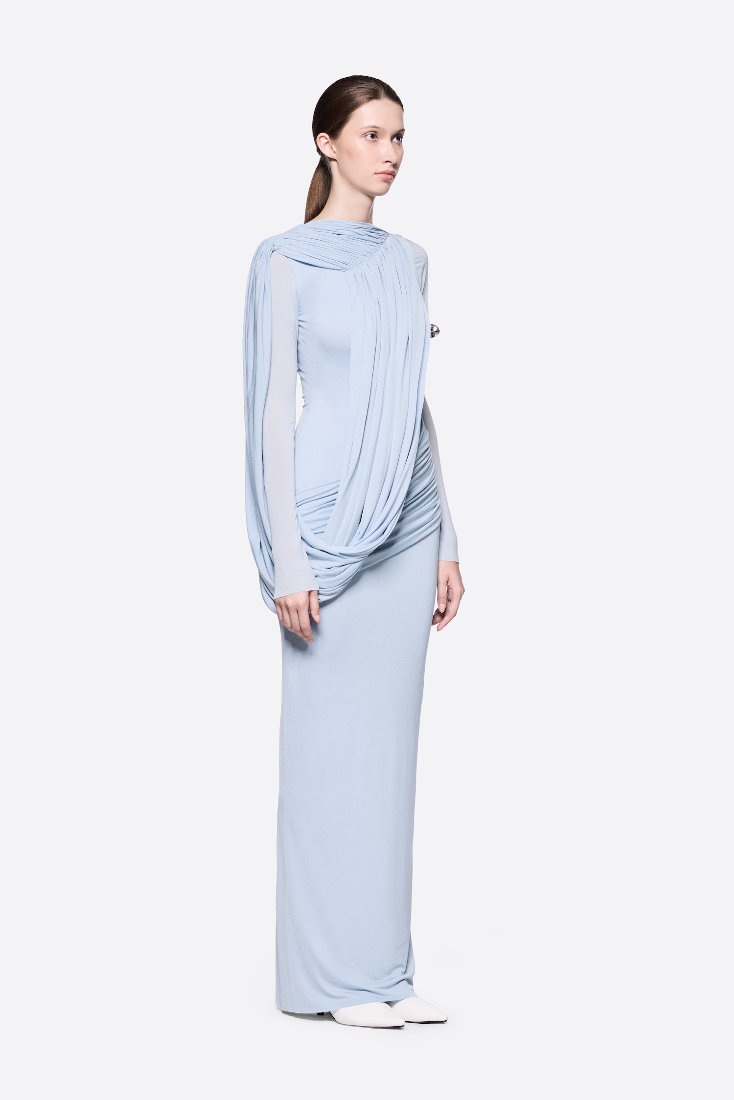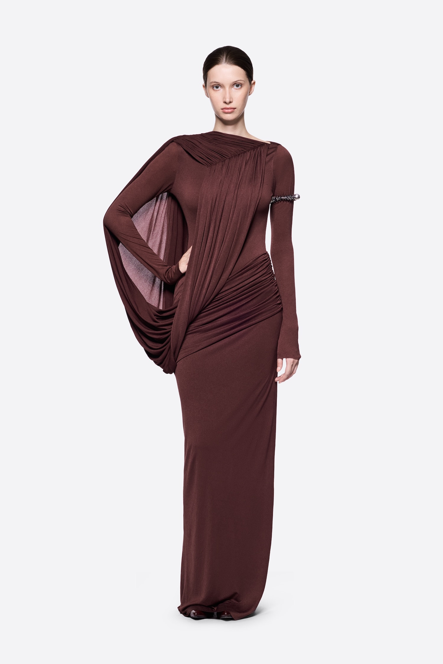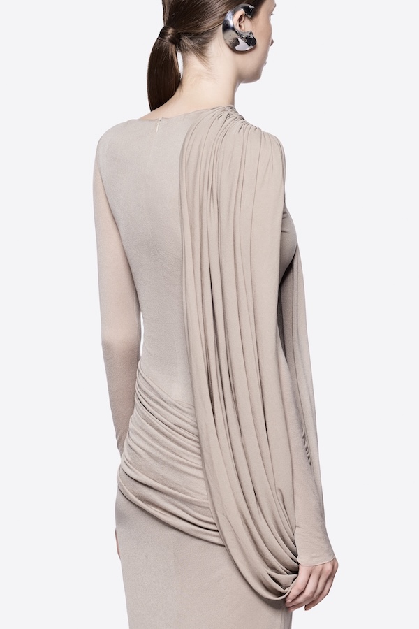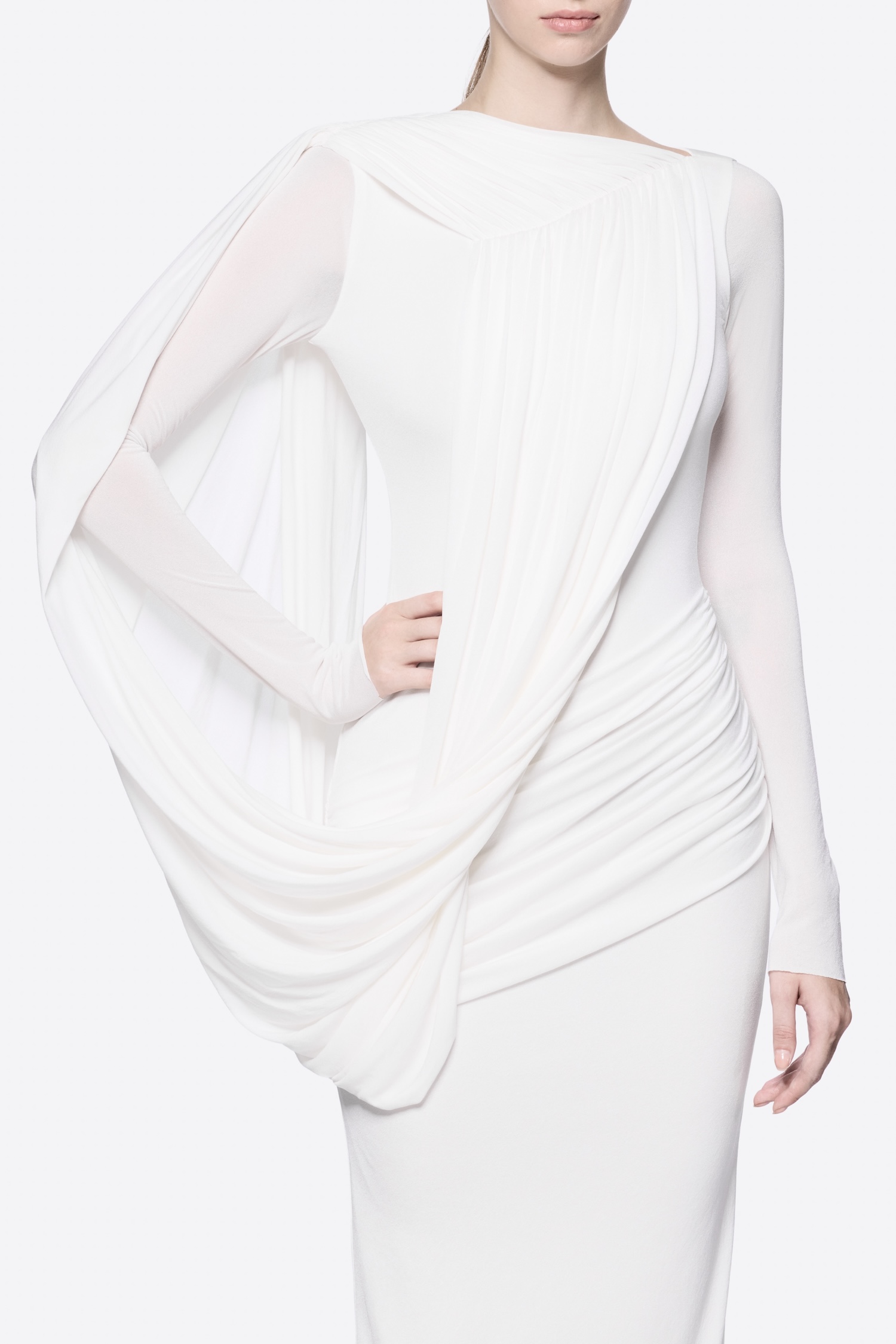 – Detail: Long sleeves, Asymmetrical, Cross-draped shoulder