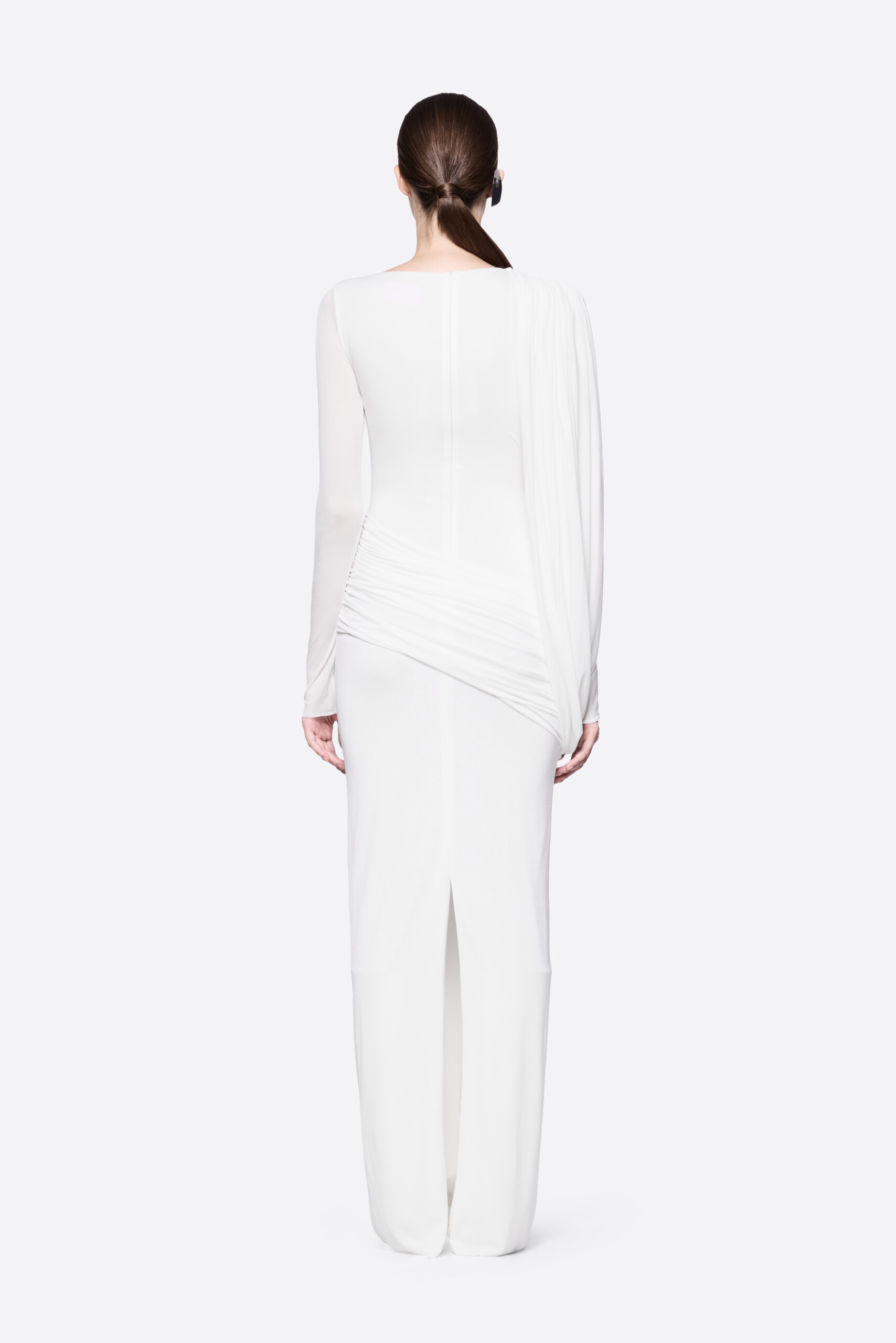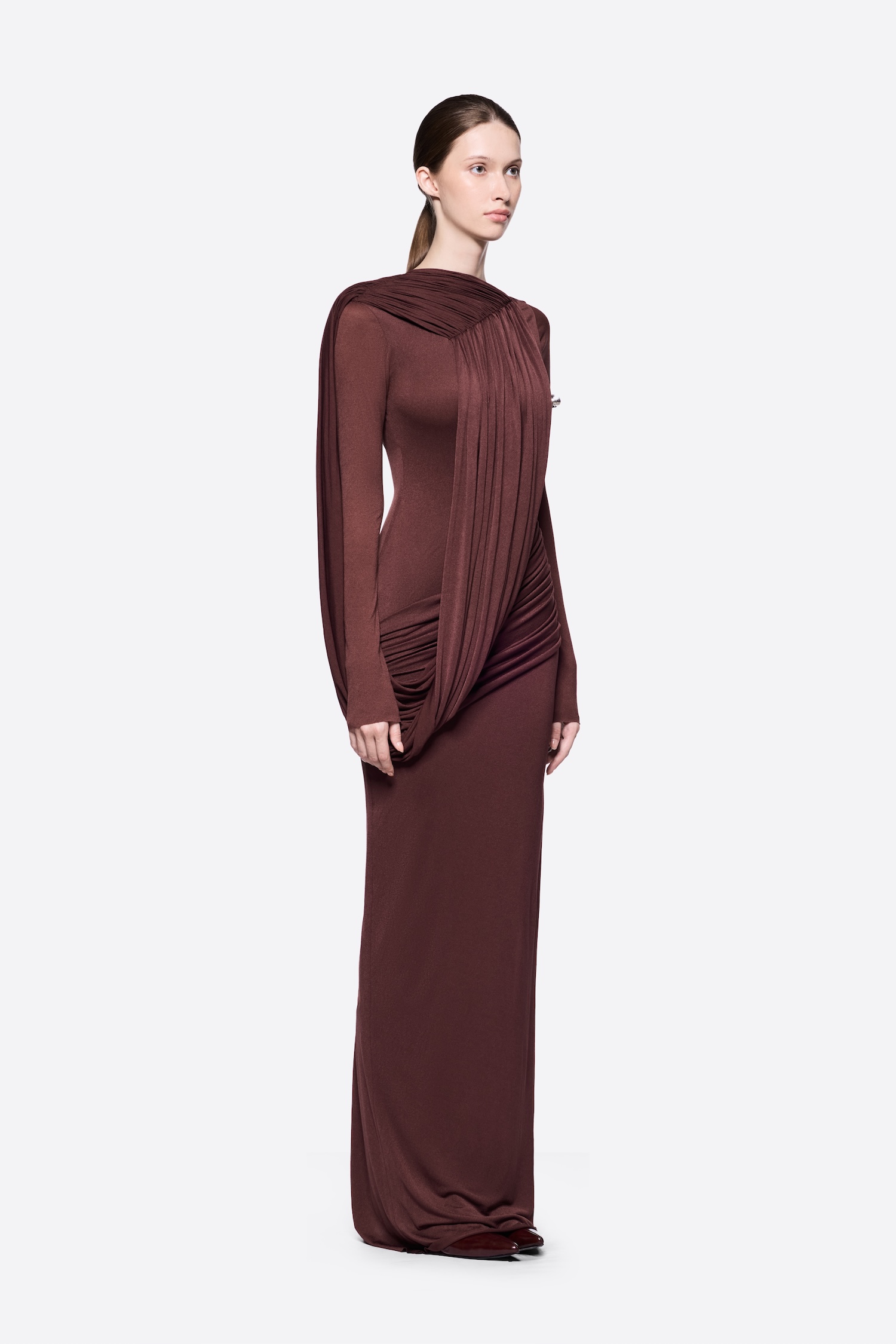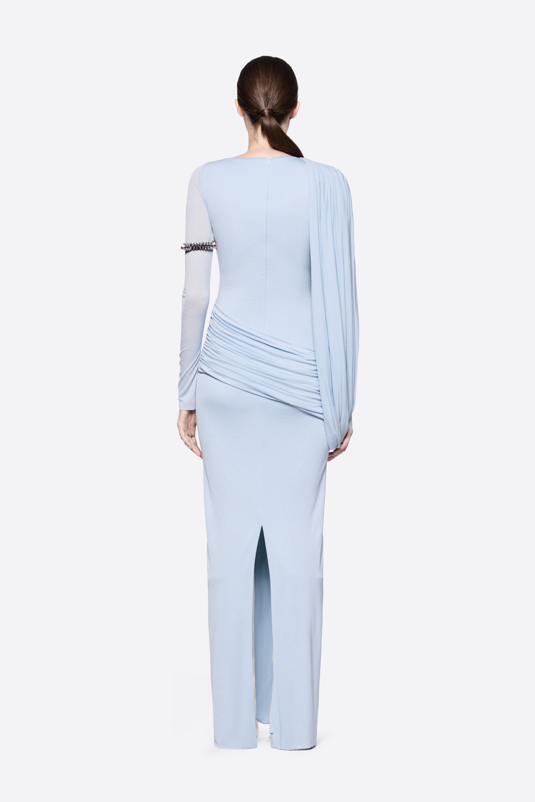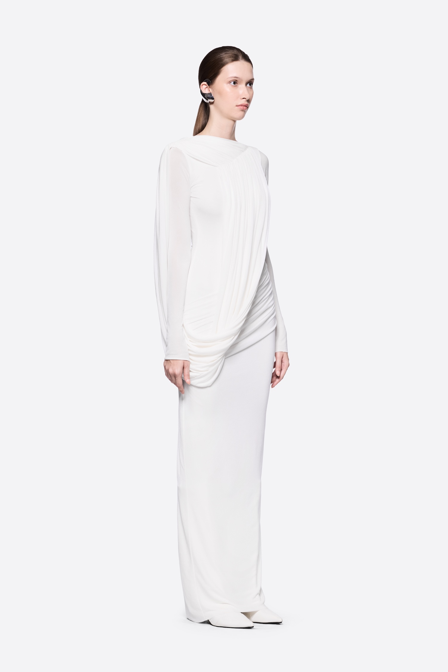 – Detail: Long sleeves, Asymmetrical, Cross-draped shoulder
