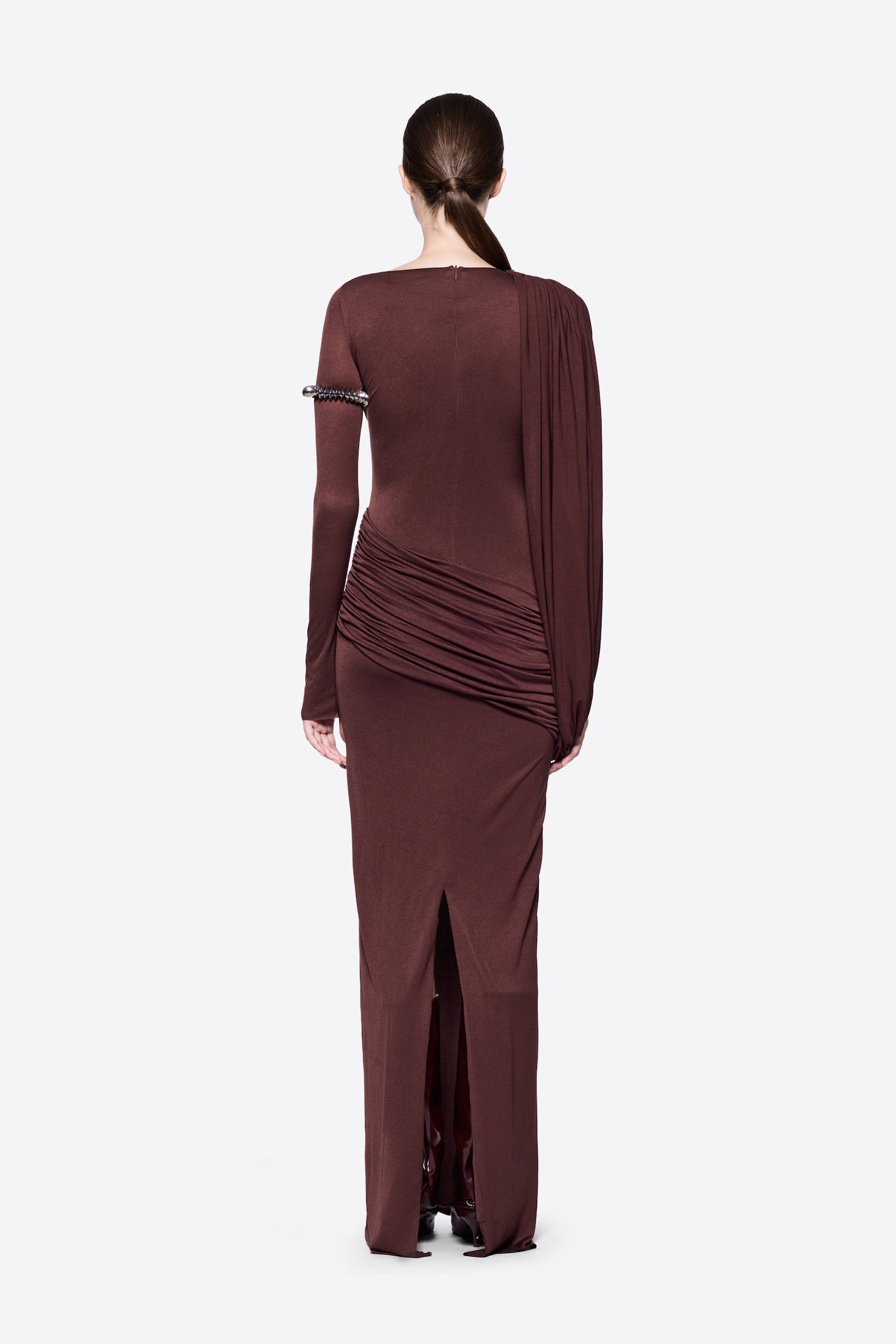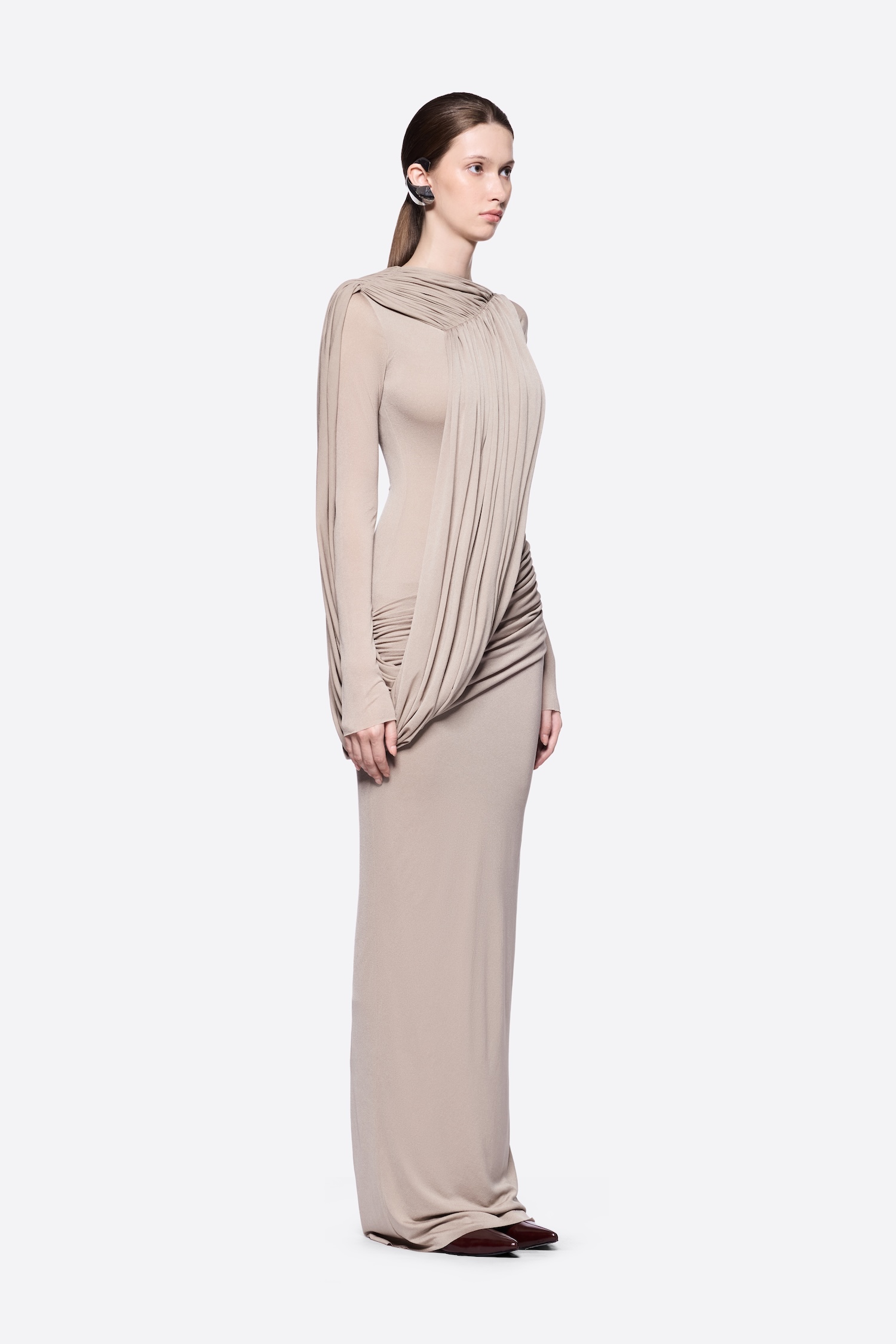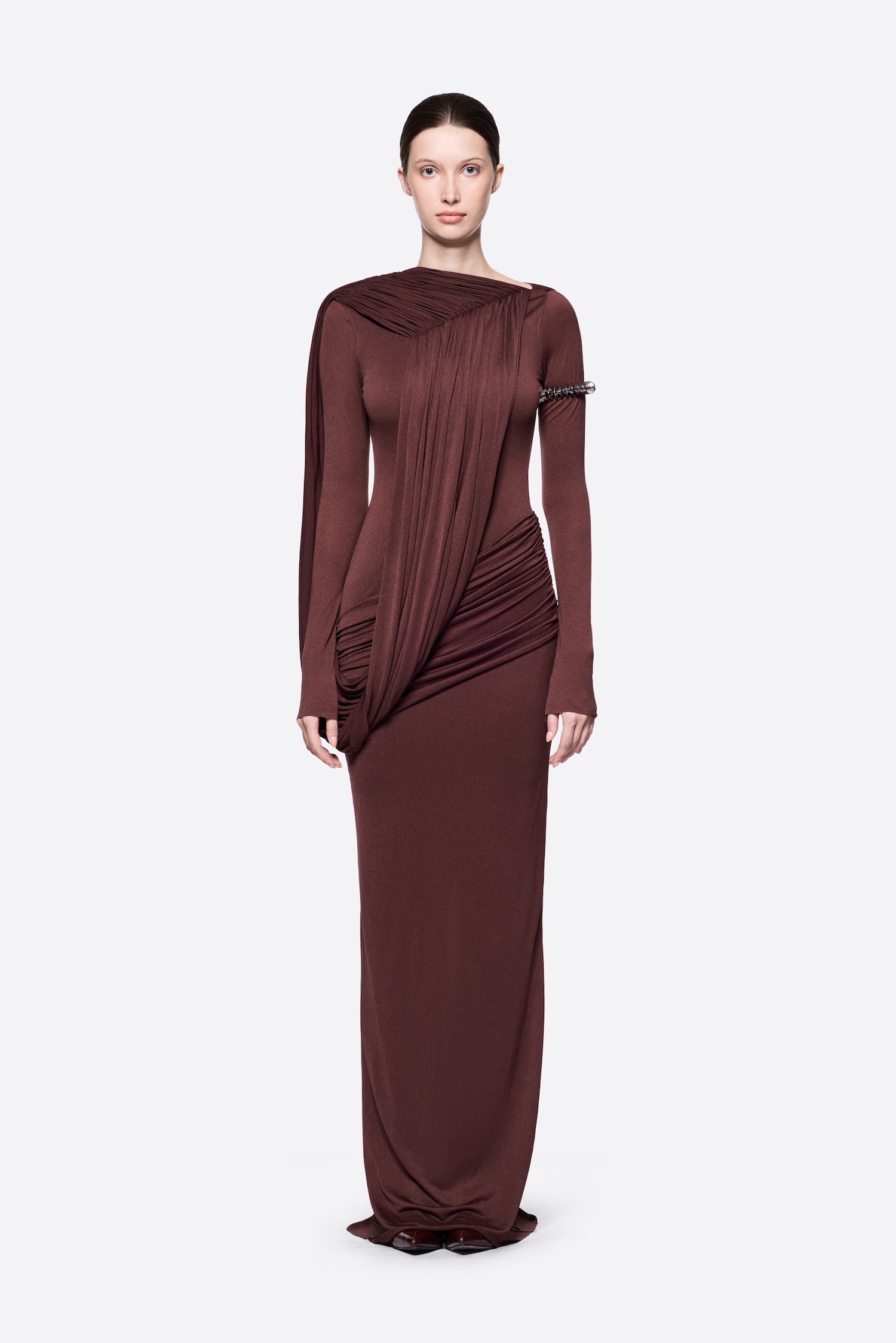 – Detail: Long sleeves, Asymmetrical, Cross-draped shoulder