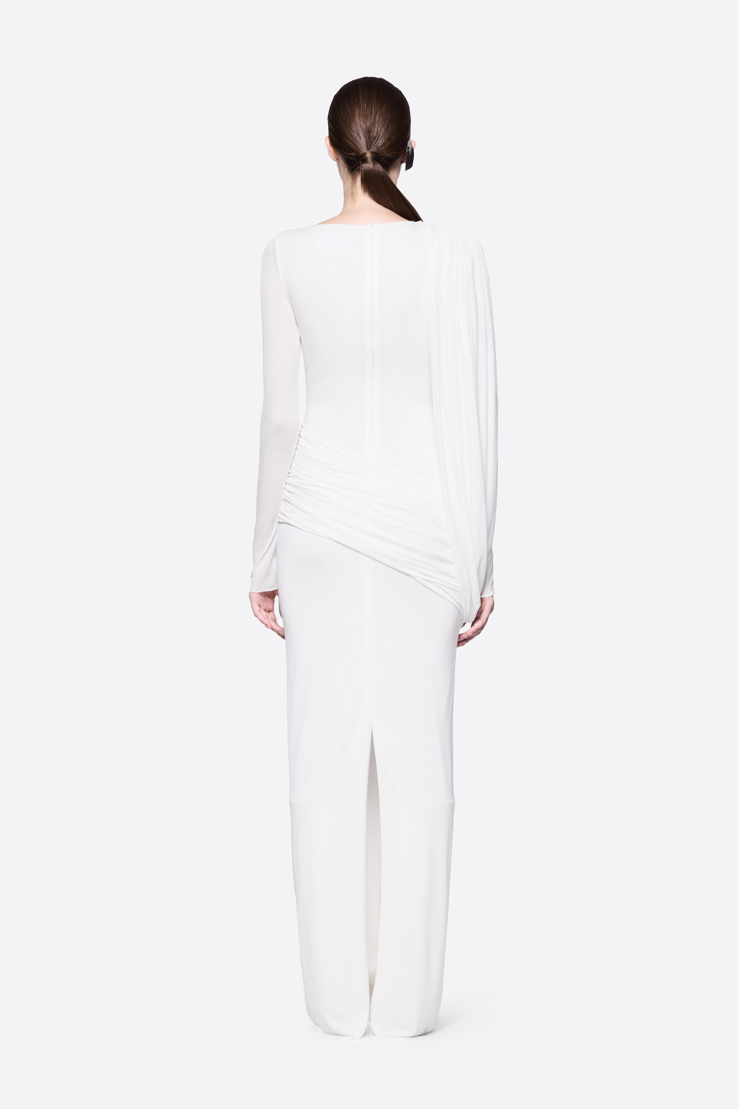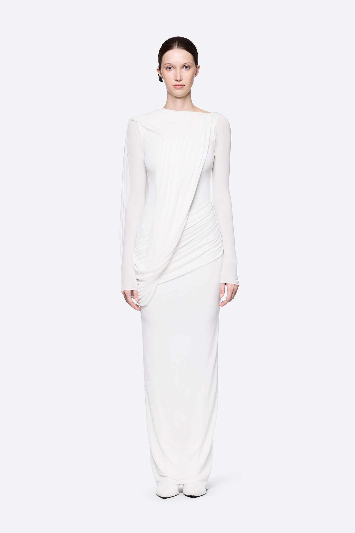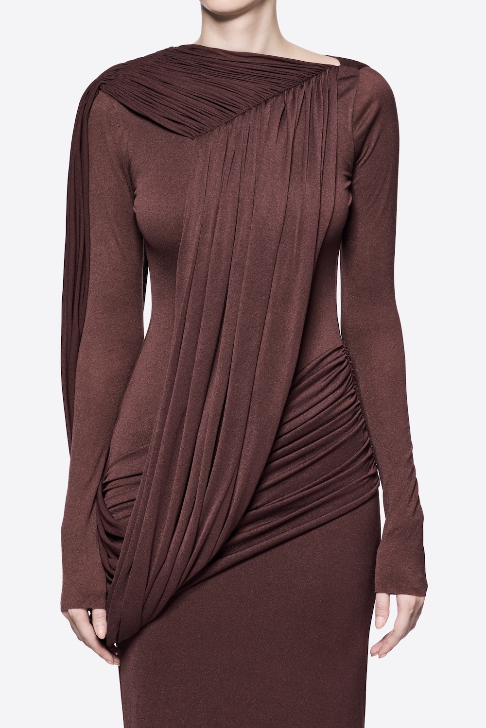 Form-fitting long-sleeve dress with asymmetrical shoulder-crossed draping details