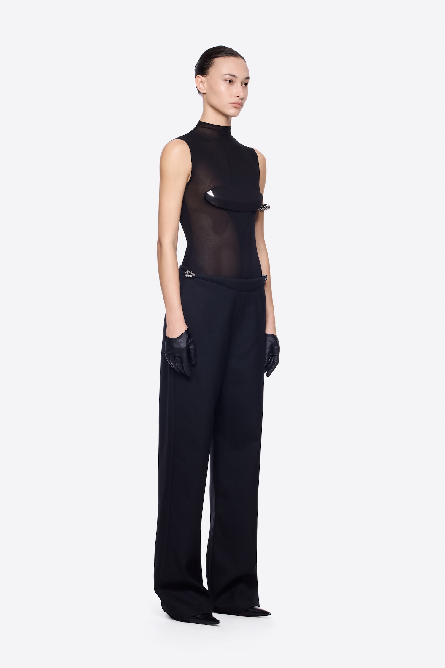 Form-fitting sleeveless top with metallic cup on symbolic module detail