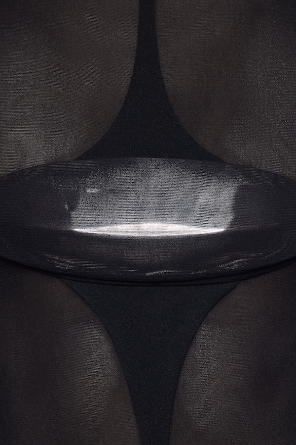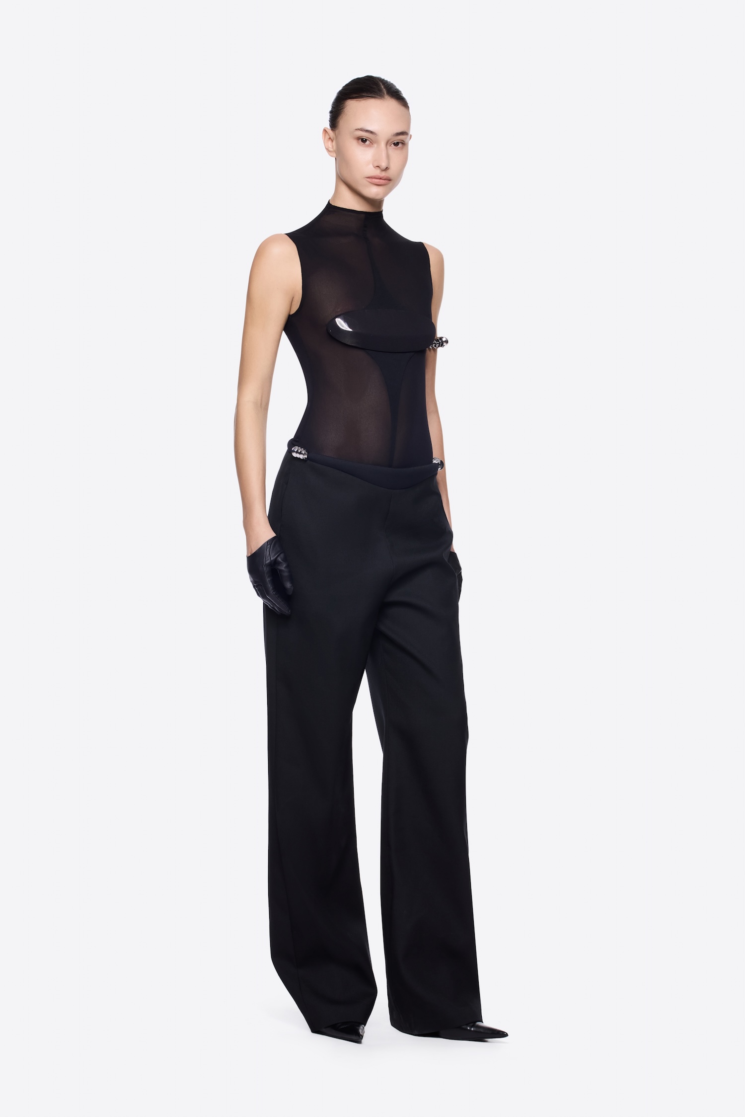 – Detail: Asymmetrical draping details, Sleeveless, Metallic cup wrapped in sheer detail, Symbolic Module
