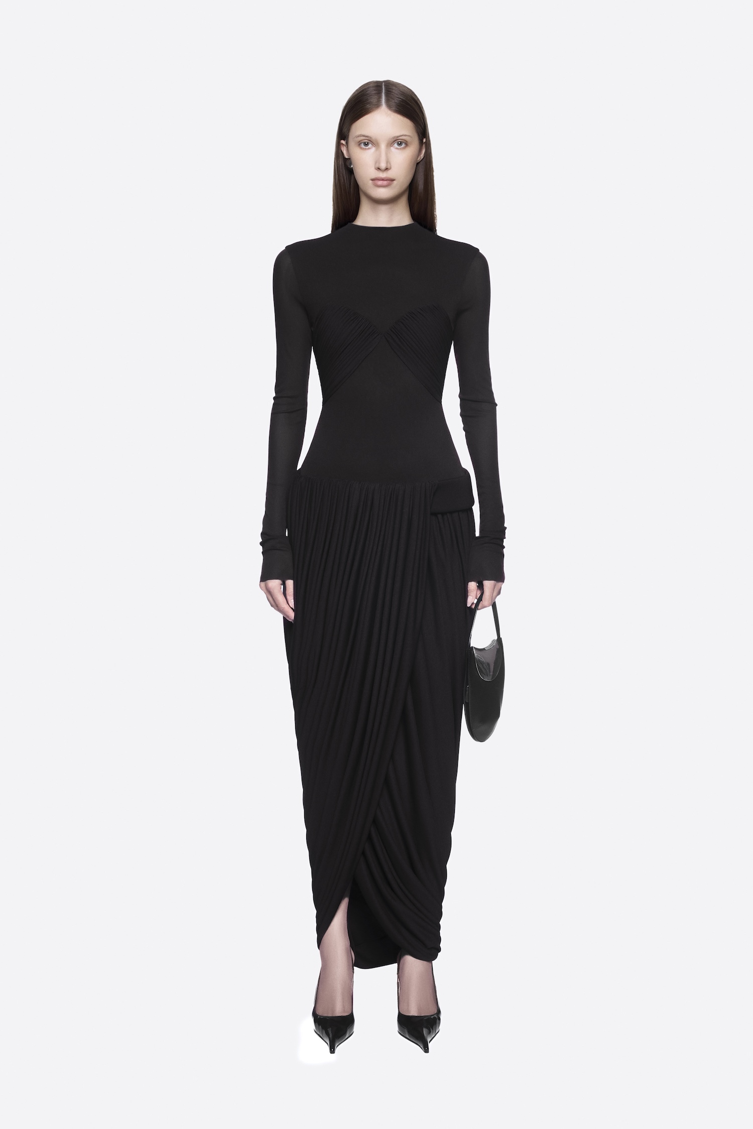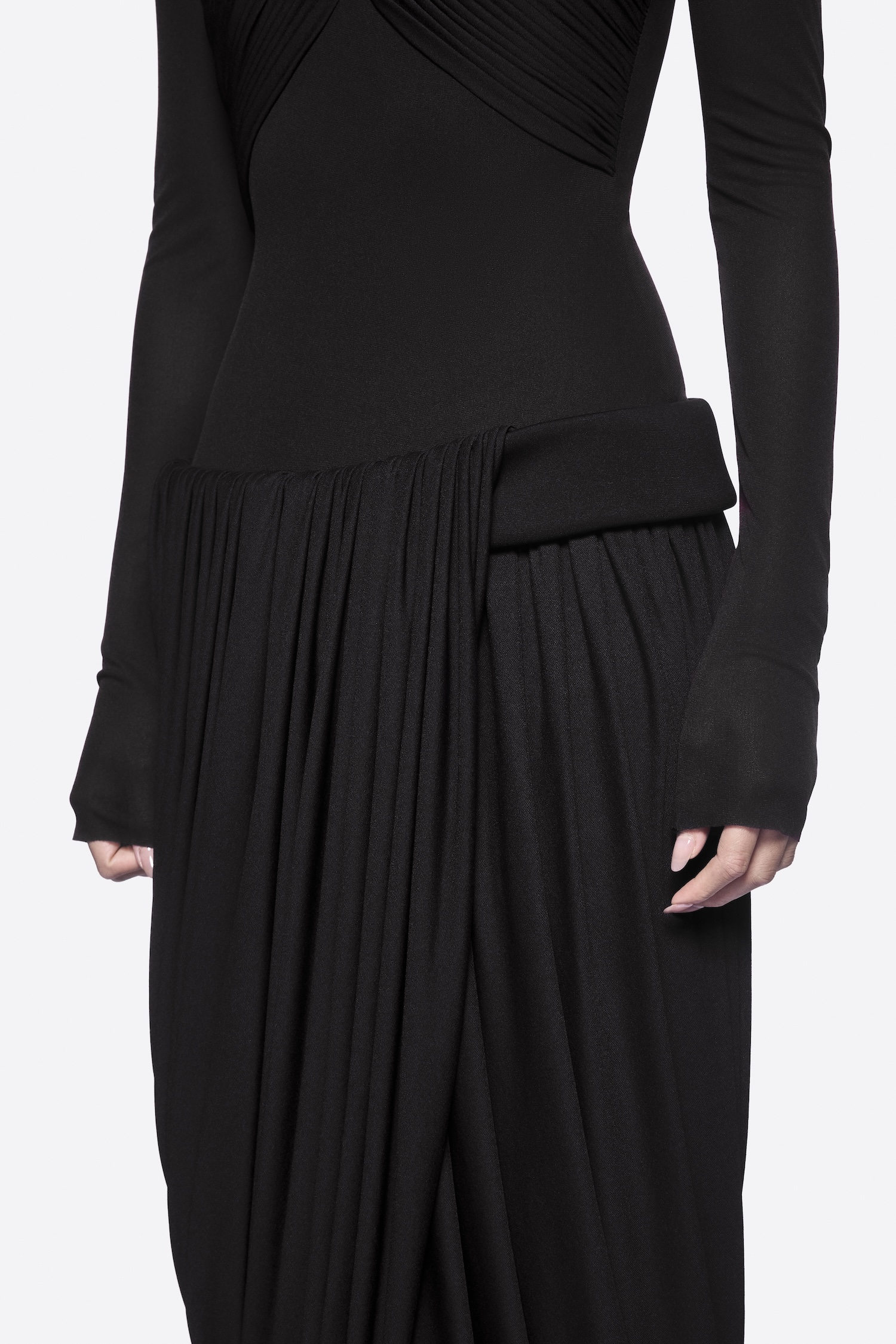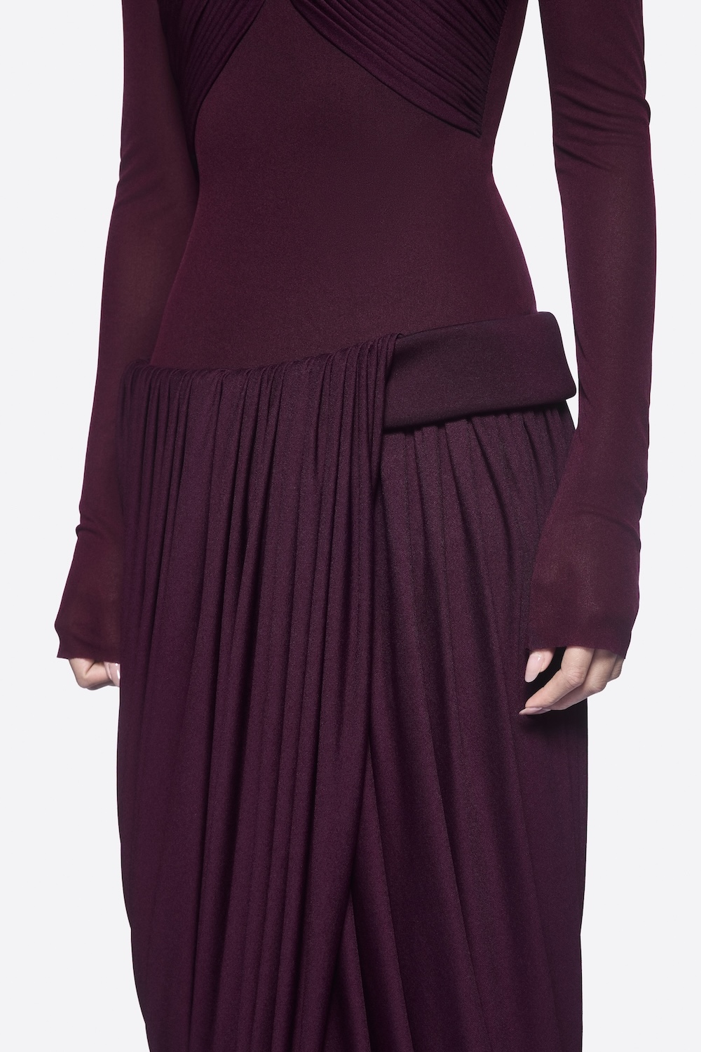 Dropped-waist dress with twisted skirt, pumped hip band, symmetrical draped bust, and long sleeves