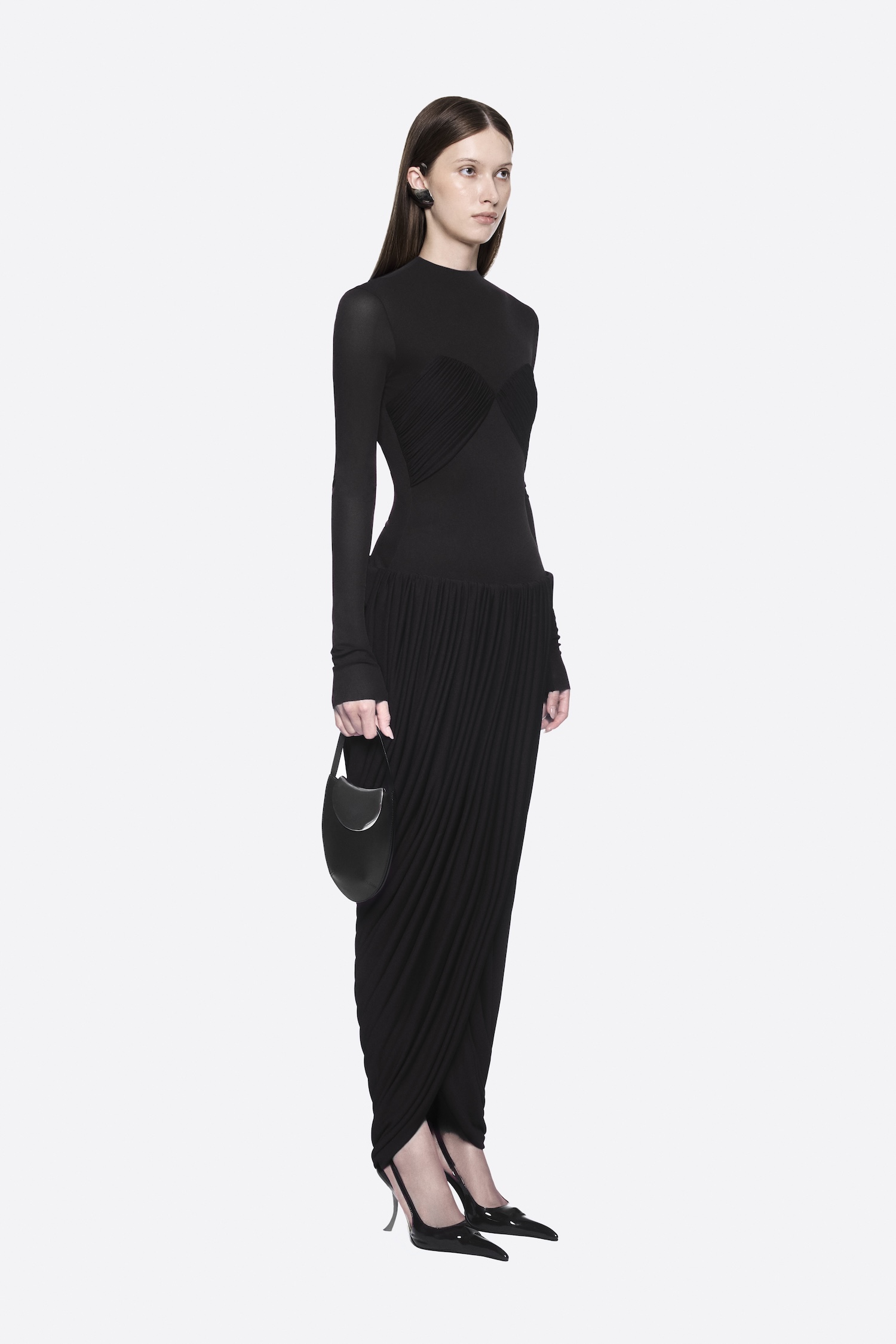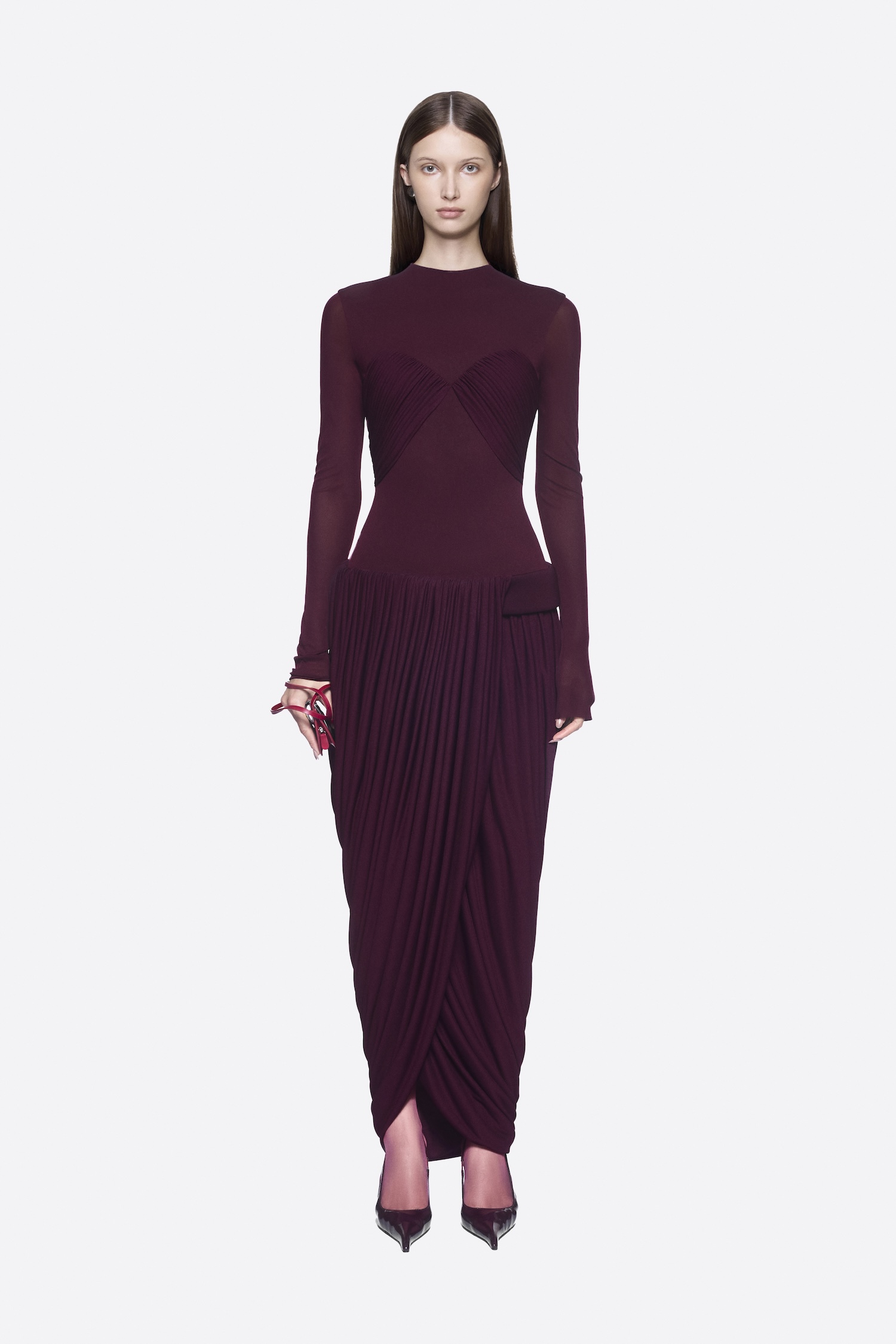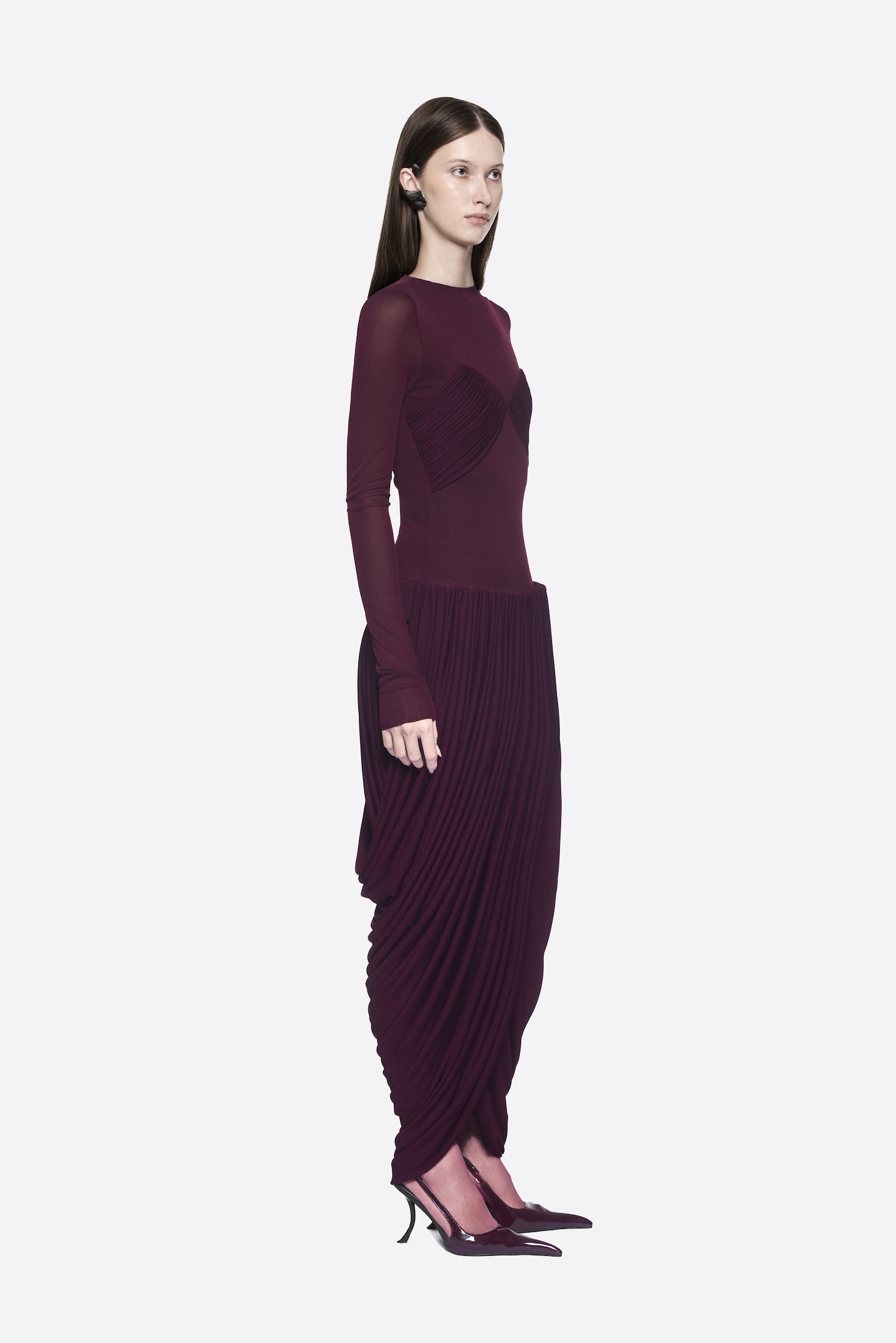 Dropped-waist dress with twisted skirt, pumped hip band, symmetrical draped bust, and long sleeves