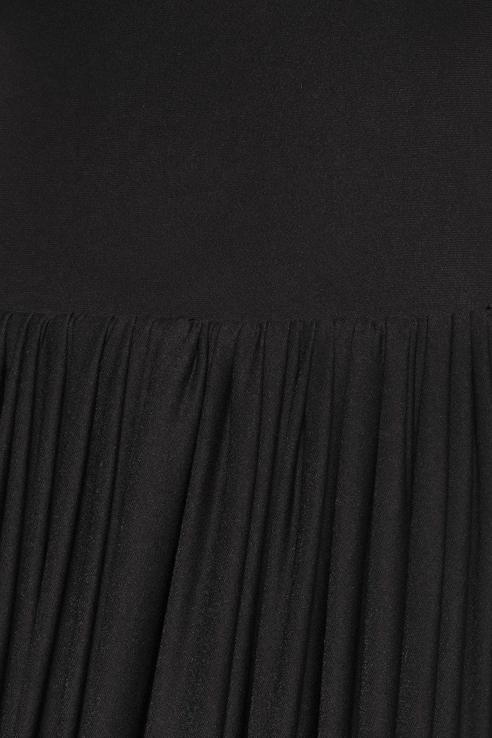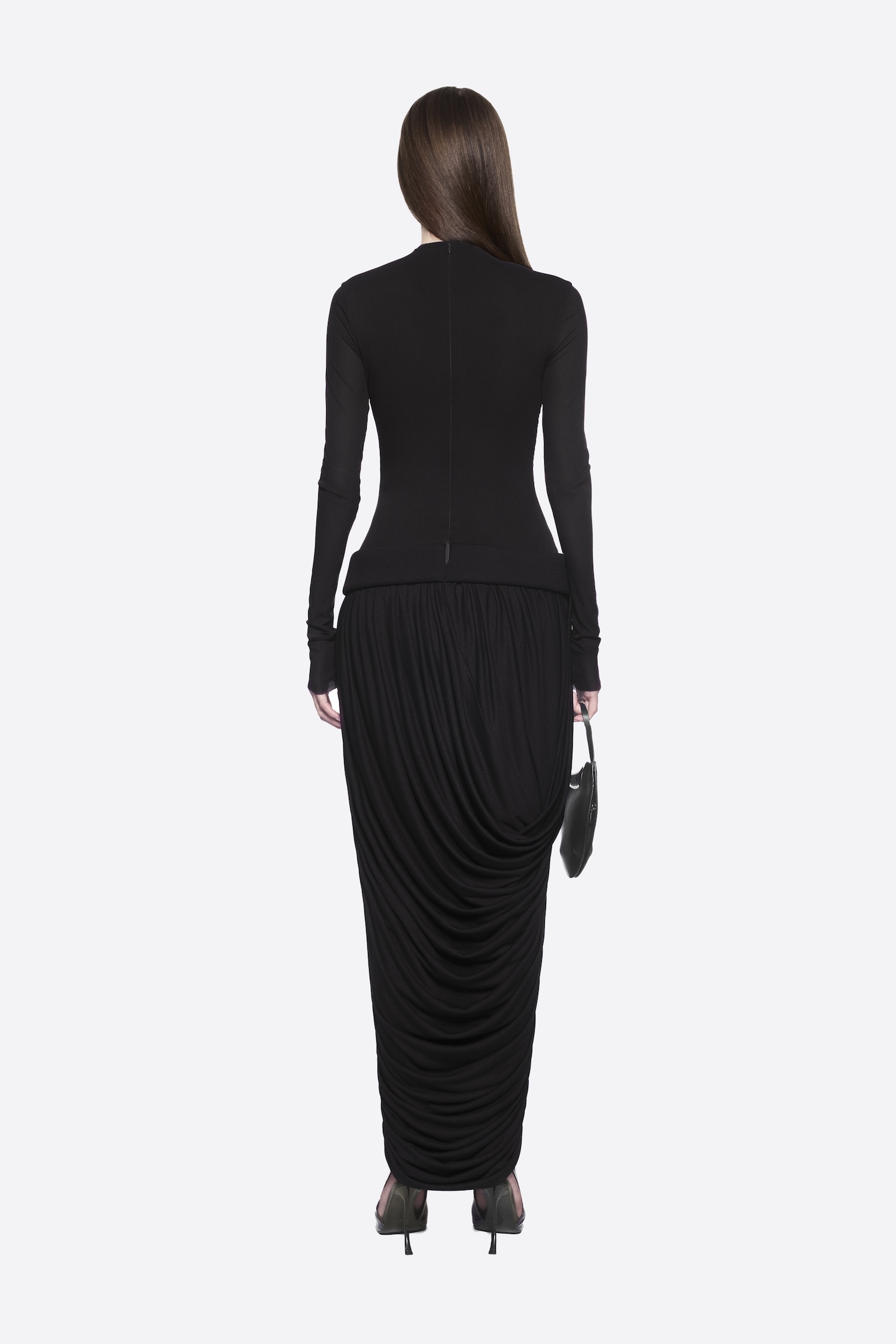 – Detail: Symmetrical draping details at bust, Double-layered top, Long sleeves, Twisted skirt, Pumped dress waistband