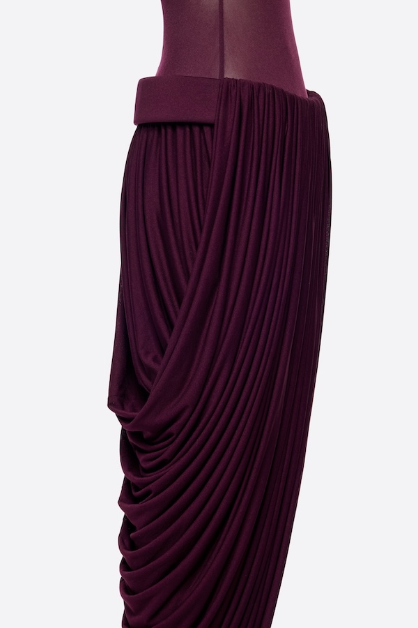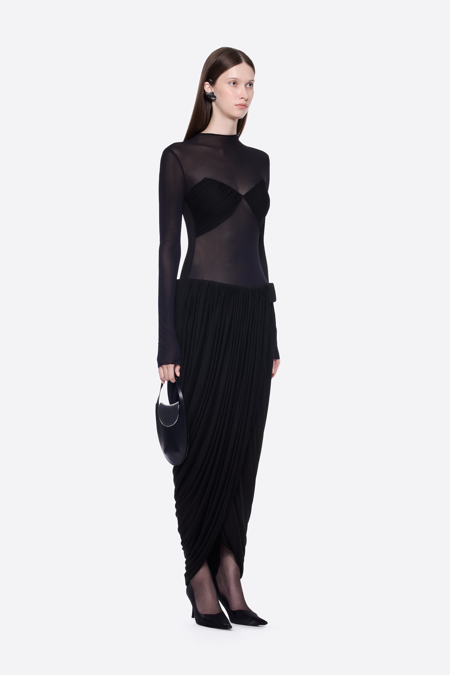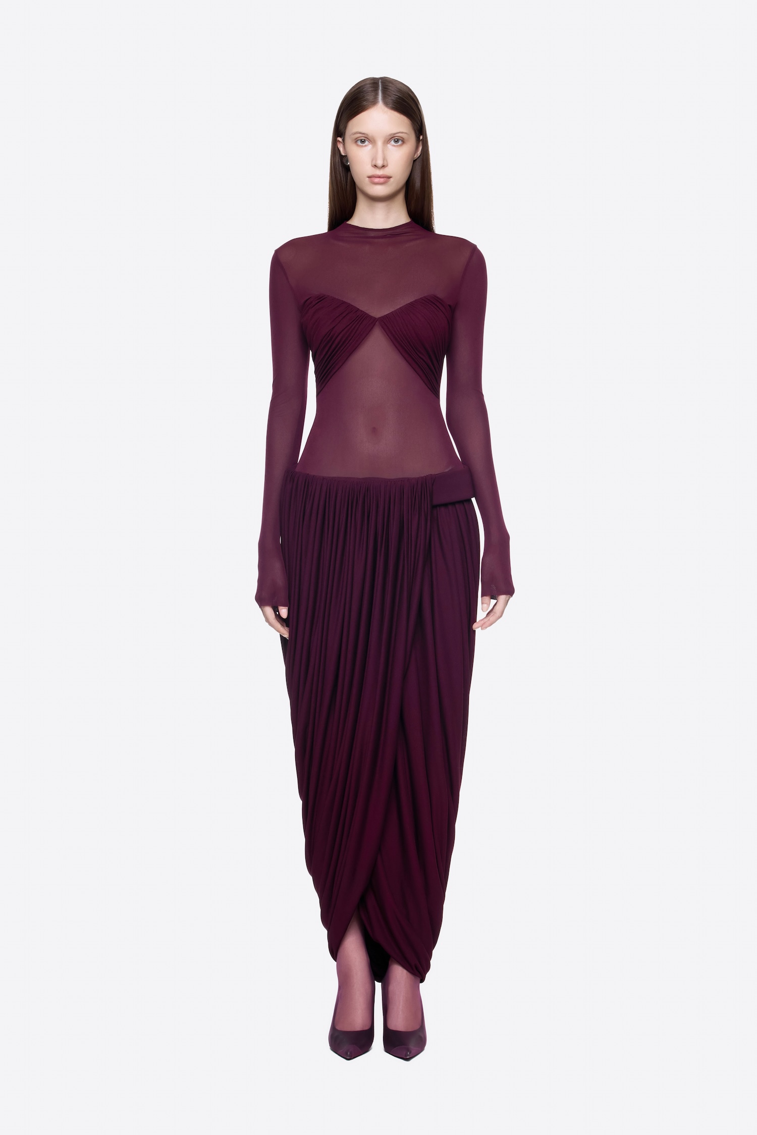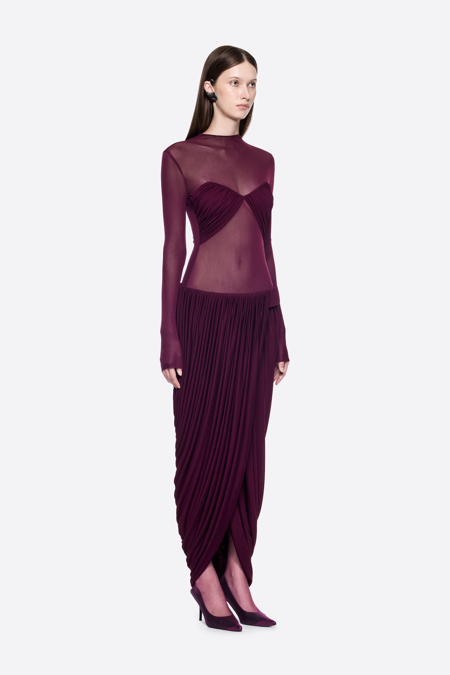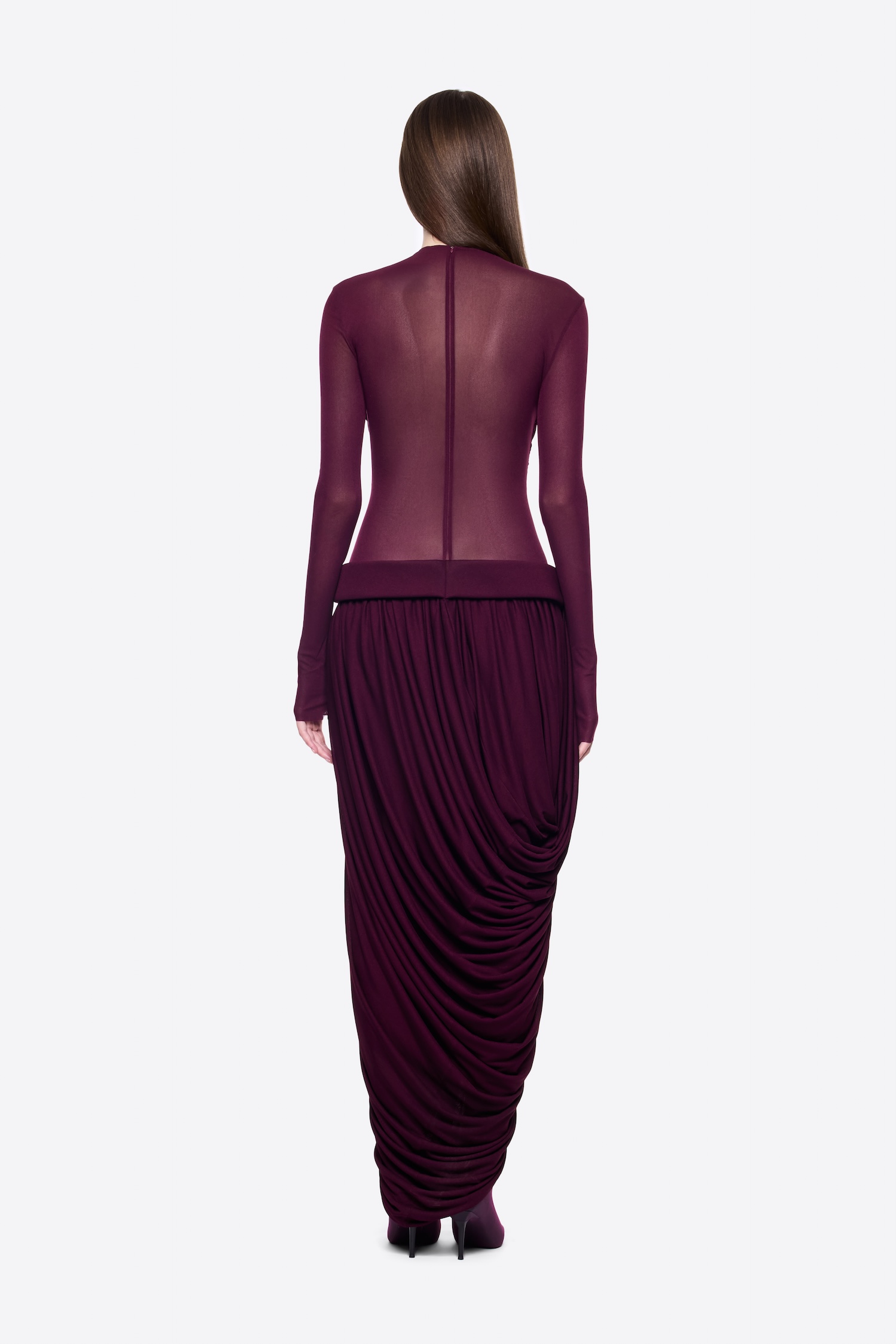 Dropped-waist dress with twisted skirt, pumped hip band, symmetrical draped bust, and long sleeves