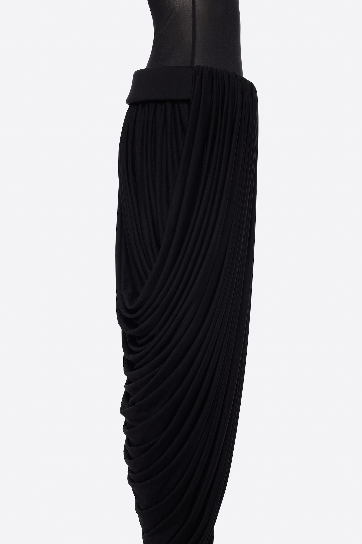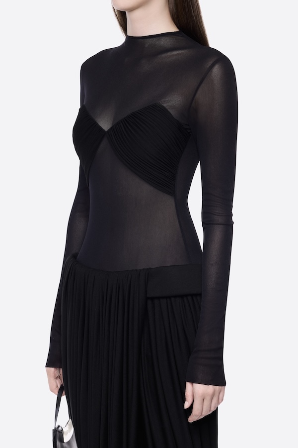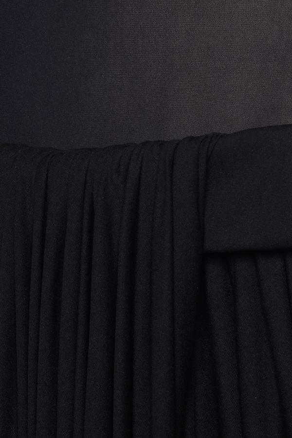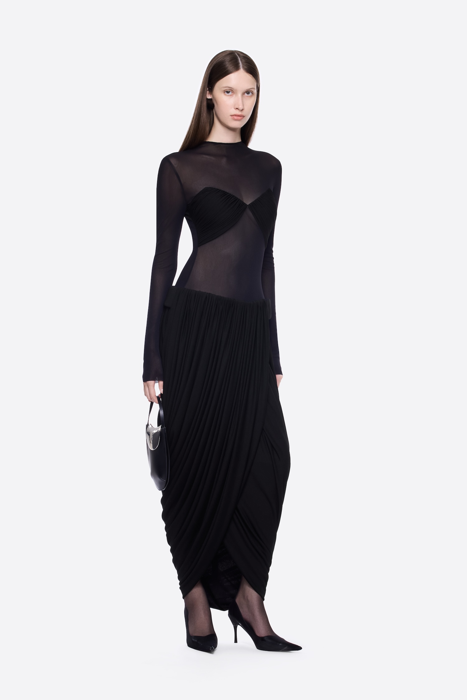 – Detail: Symmetrical draping details at bust, Double-layered top, Long sleeves, Twisted skirt, Pumped dress waistband