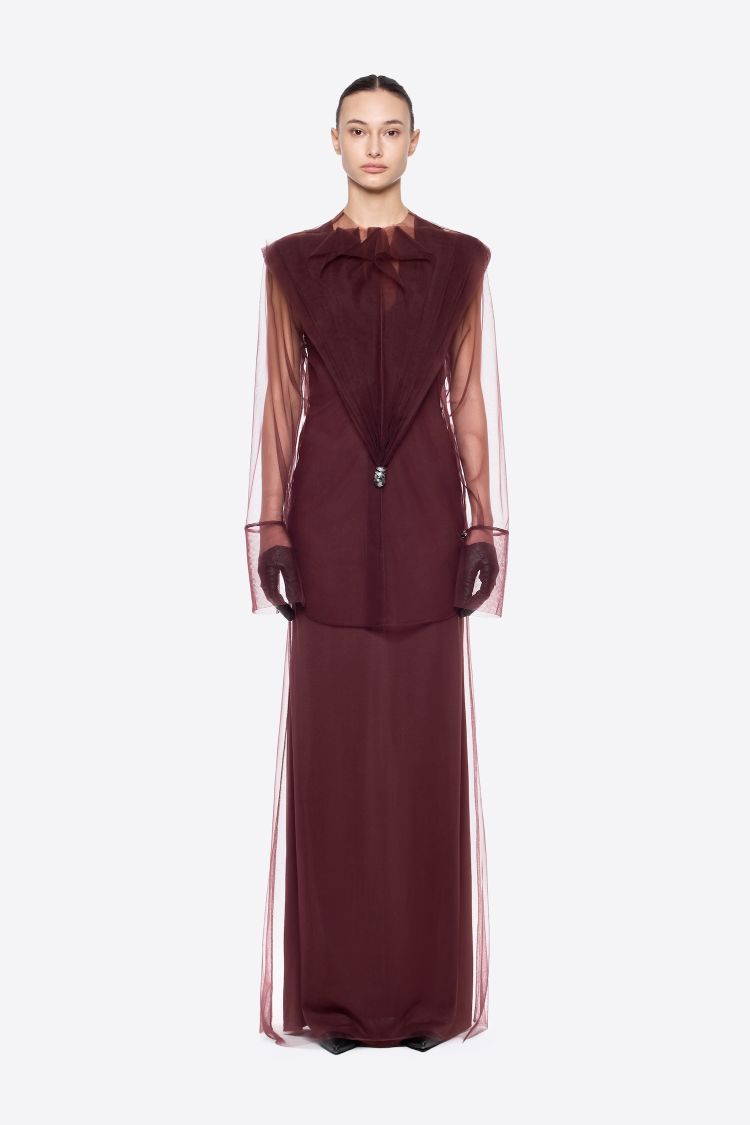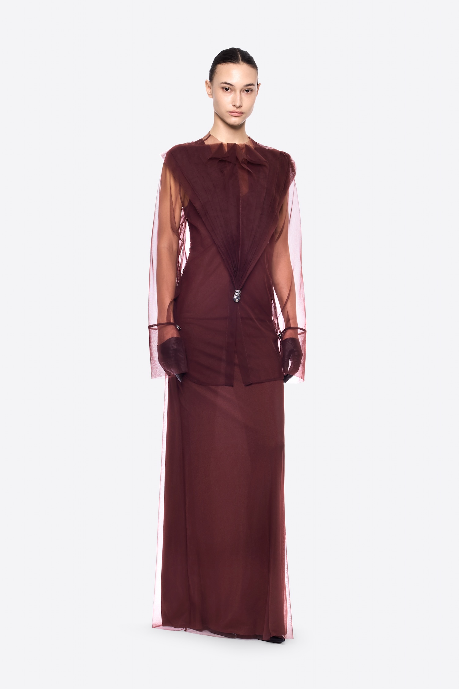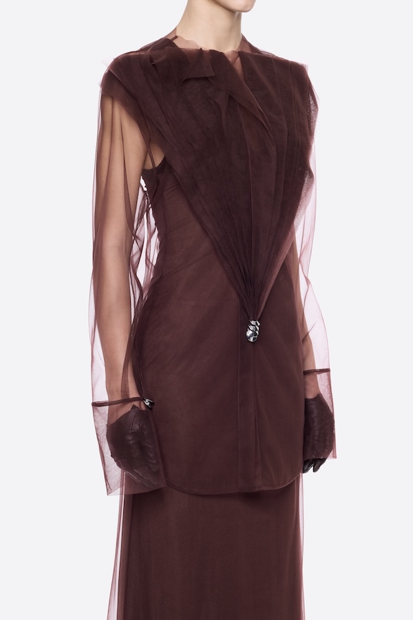 Form-fitting dress with layered sheer cover and Loose-fit shirt with triangular shaped sheer module and metalic detail