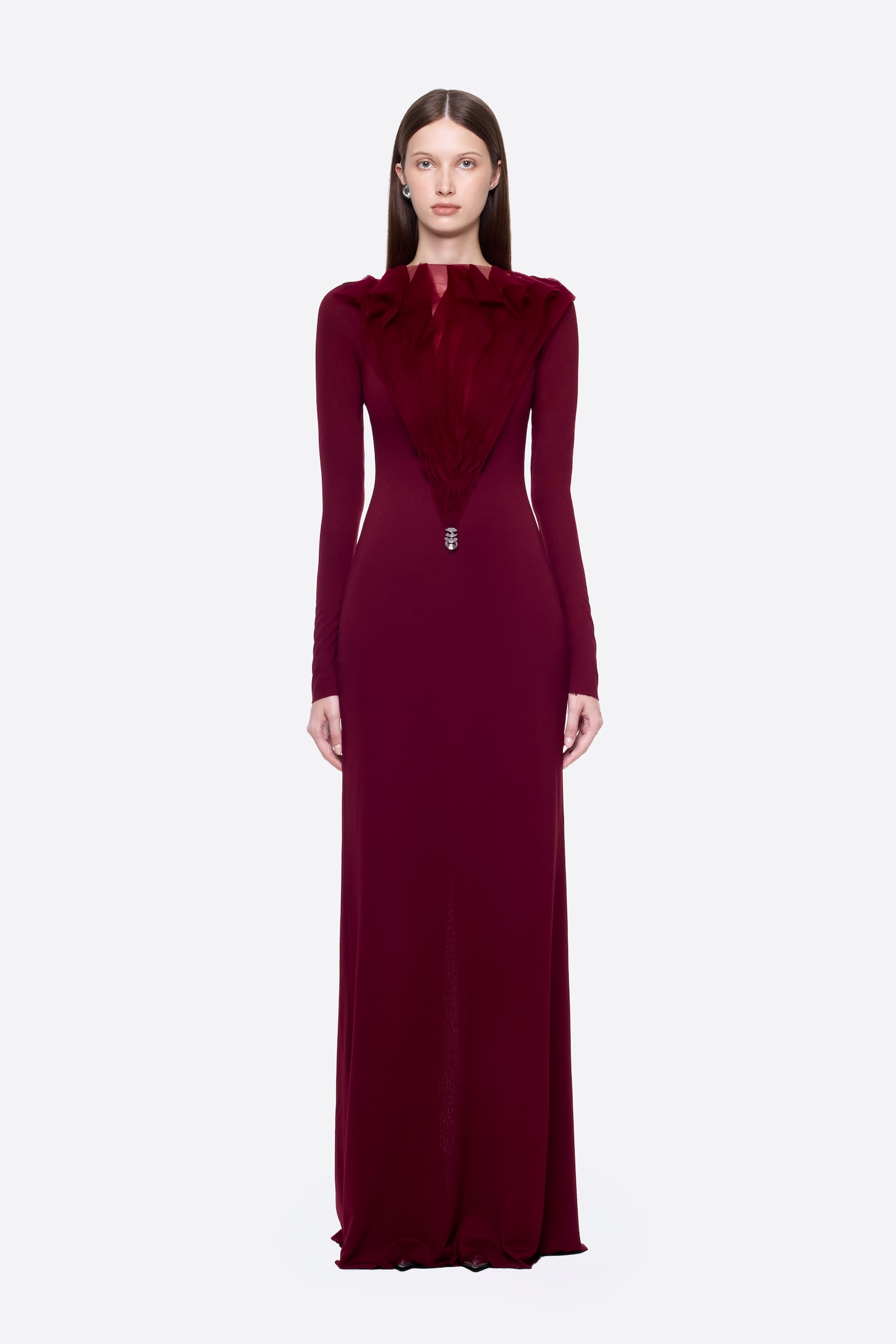 Long Stretch Crepe Knit dress and Loose-fit long triangular sheer cape with metalic detail