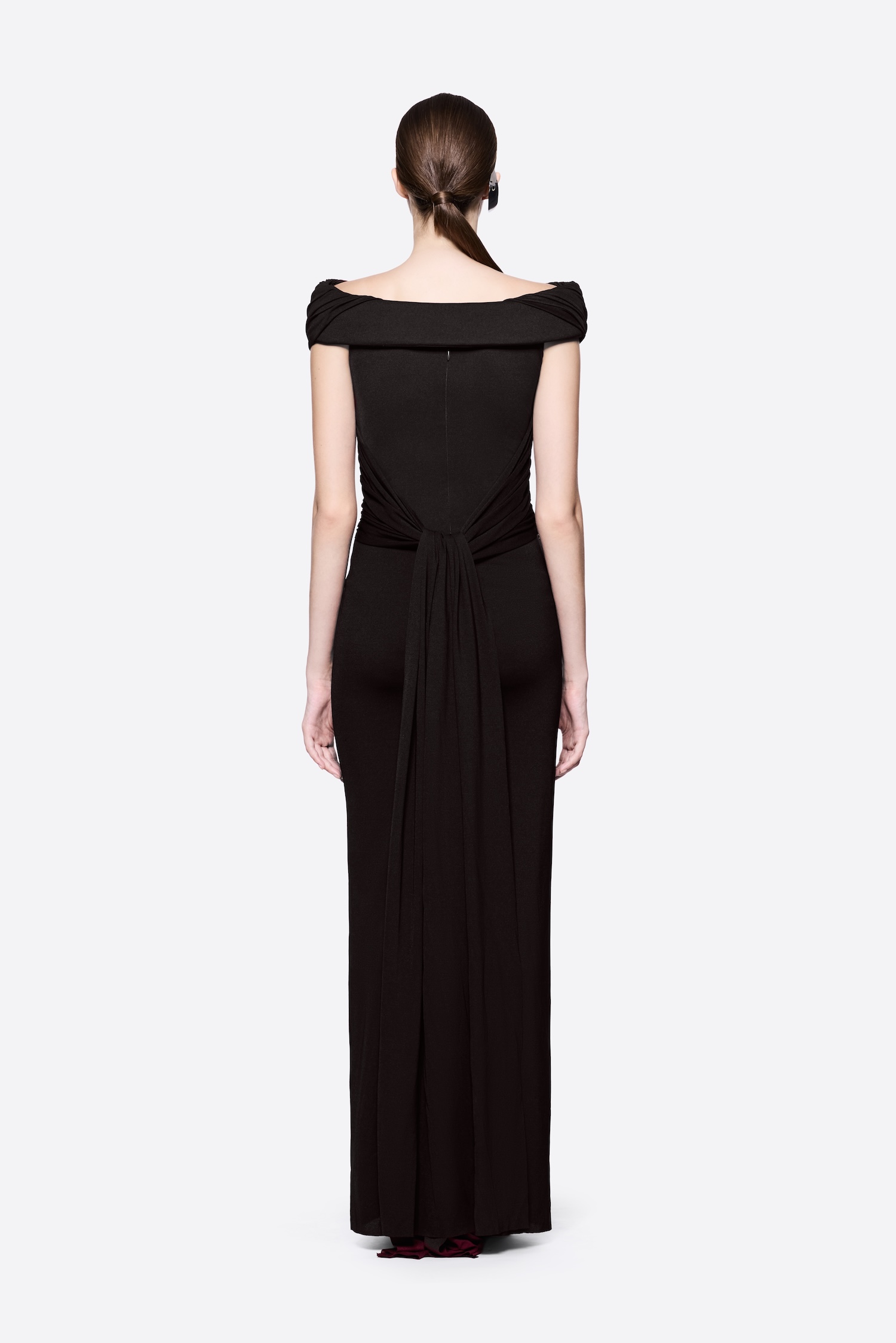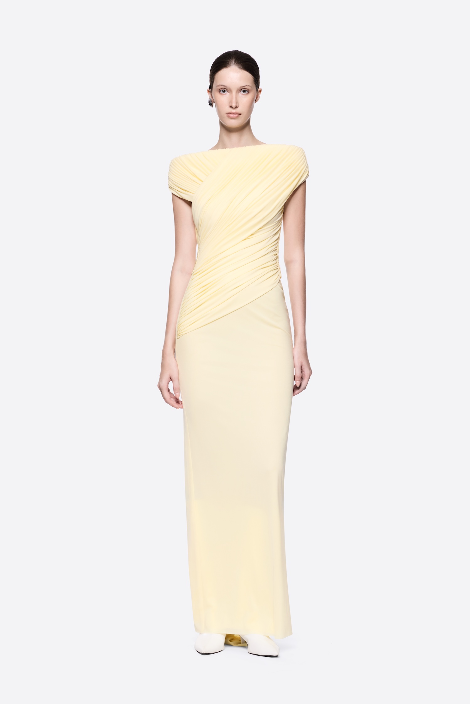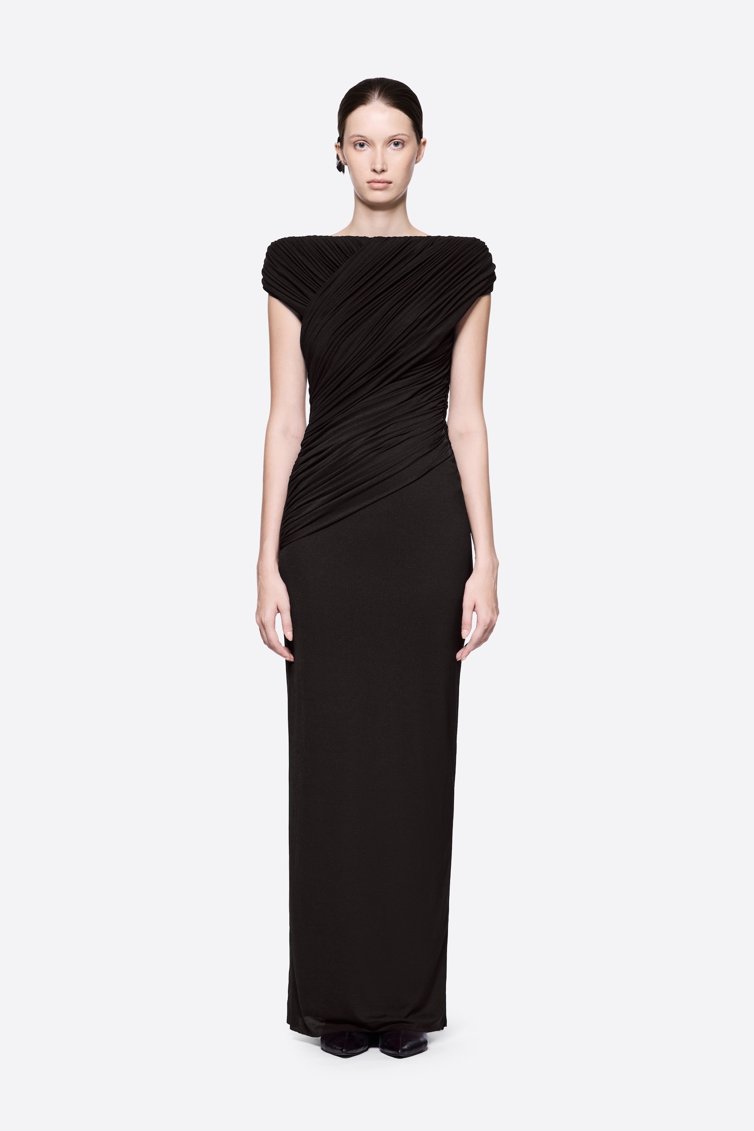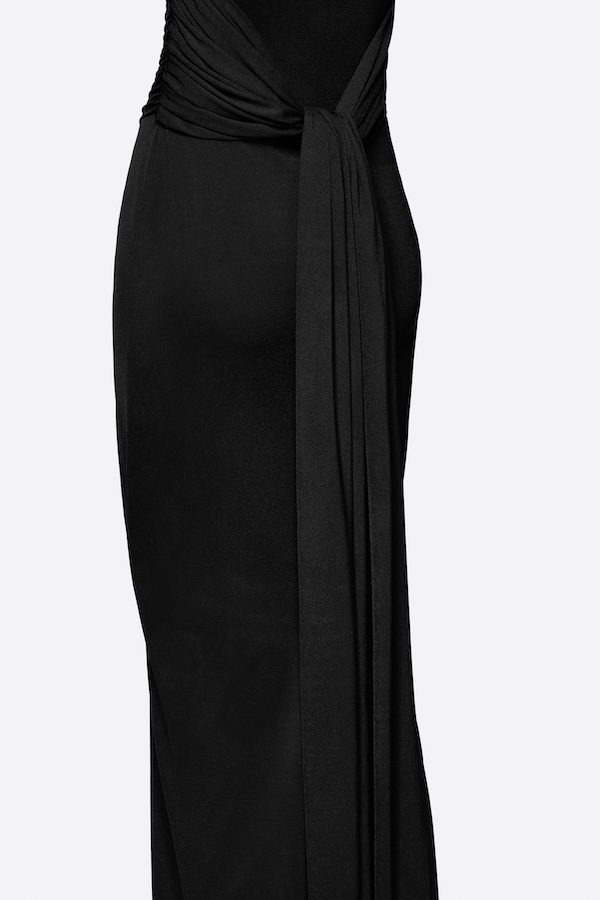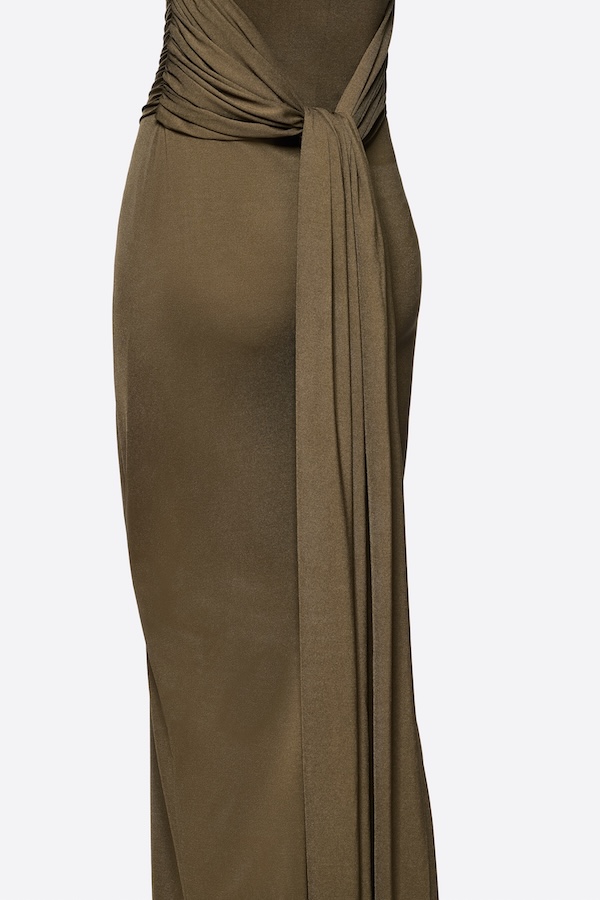 Sleeveless long dress with pumped shoulder details, symmetrical diagonal draping, and twisted knot draping details at the back