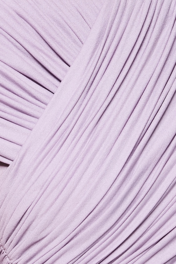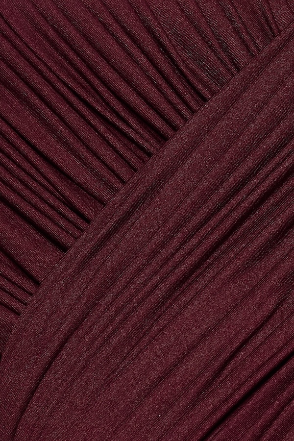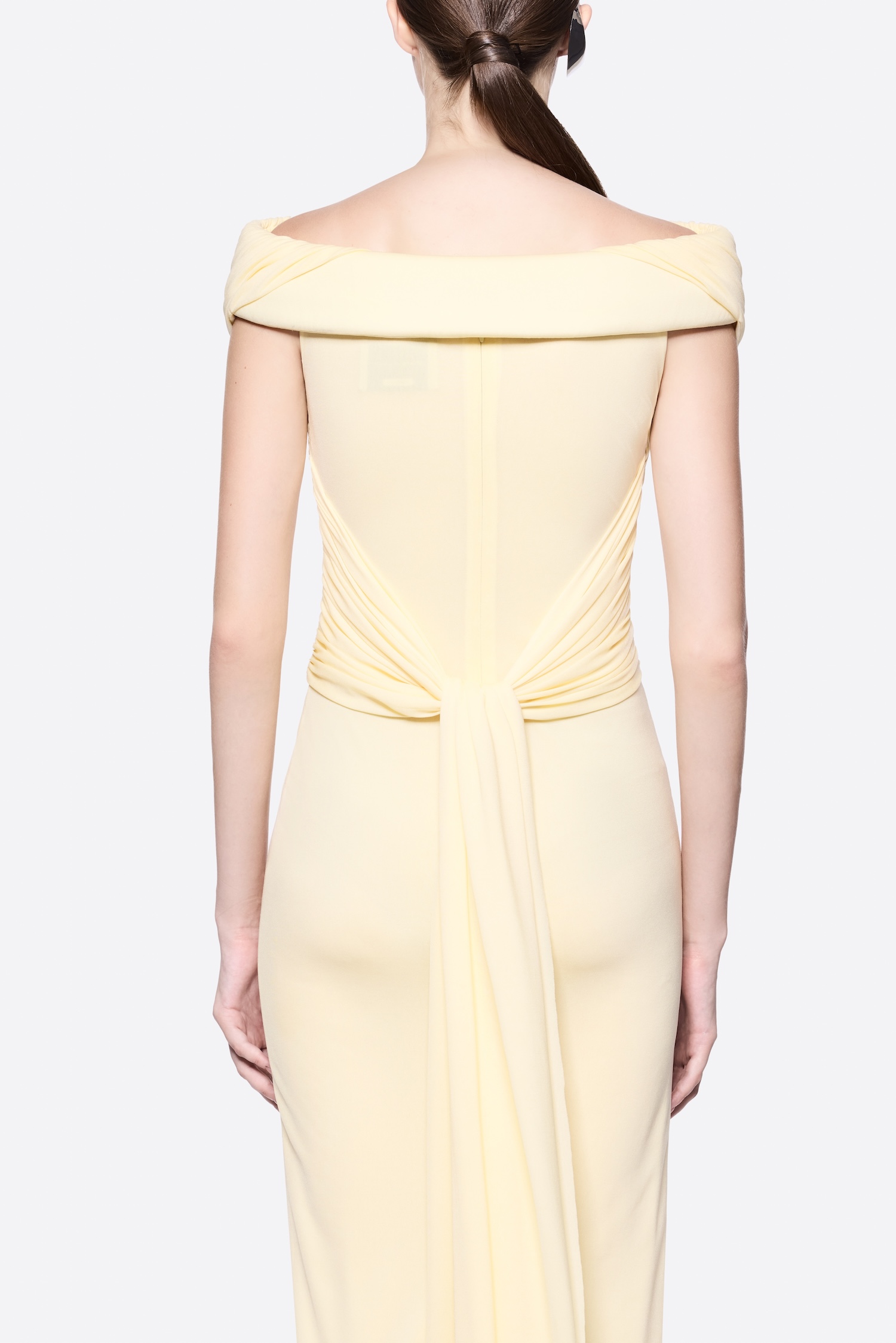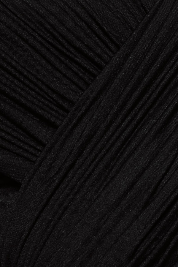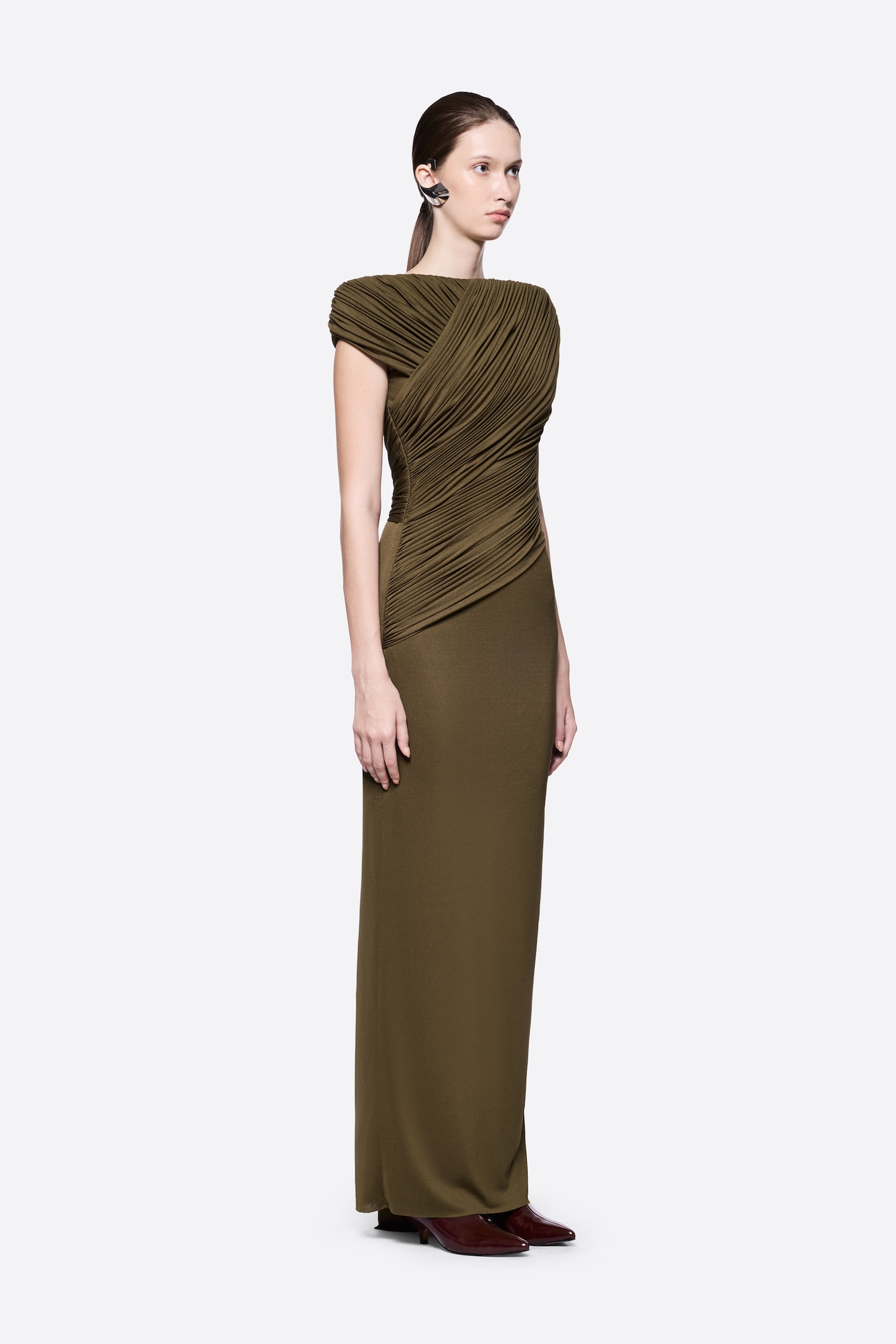 – Detail: Short sleeves, Pumped shoulder details, Symmetrical diagonal draping, Twisted draping details at the back