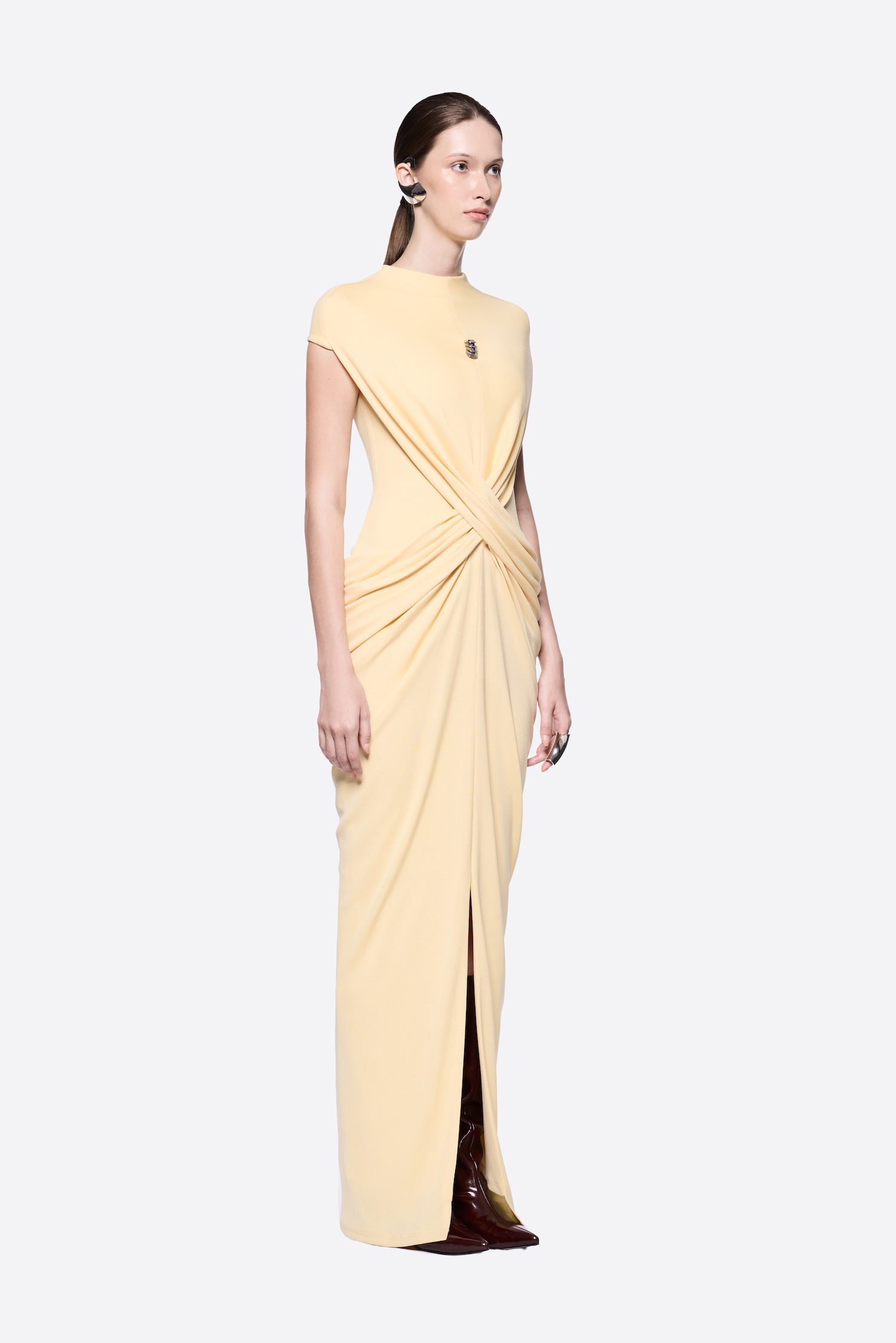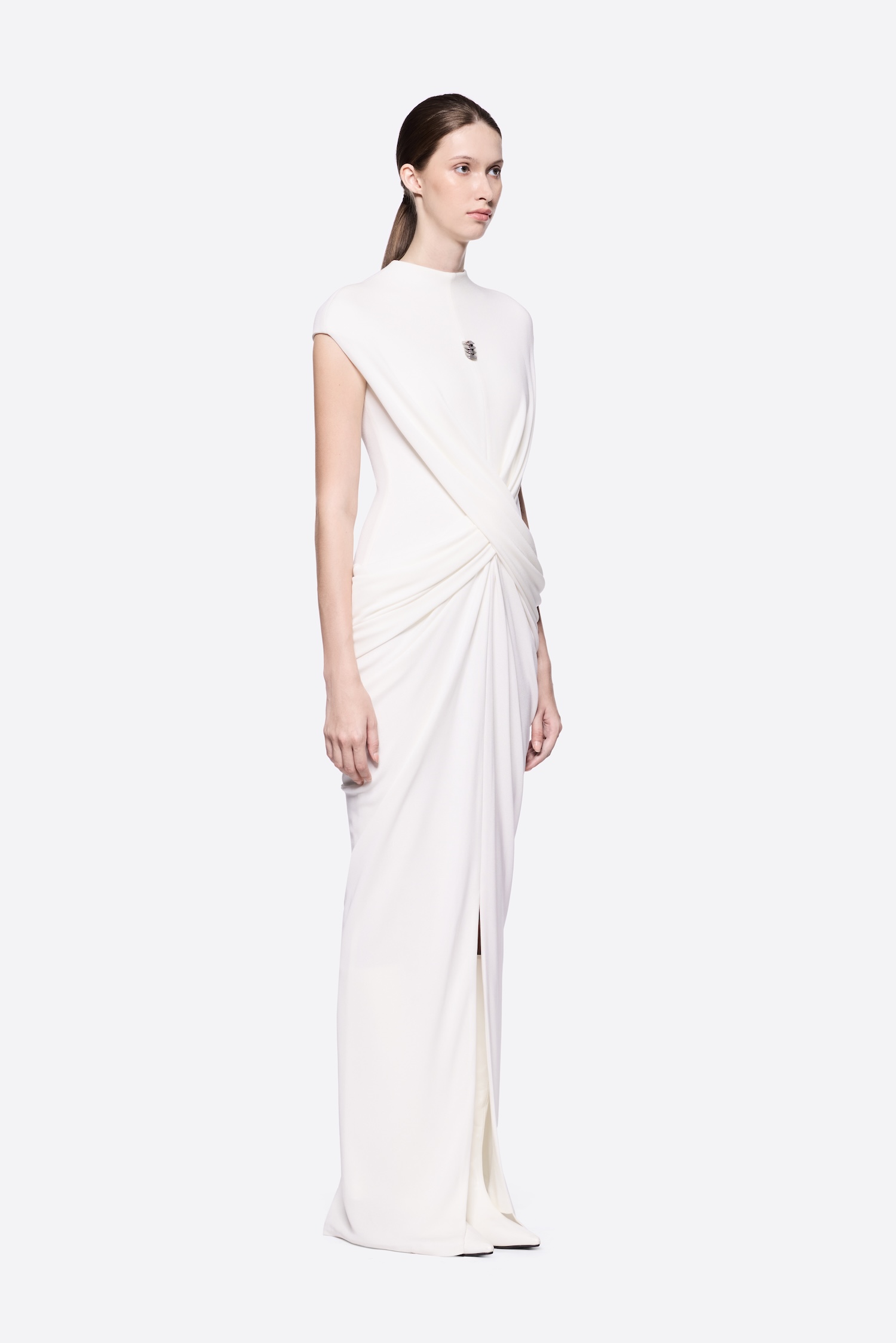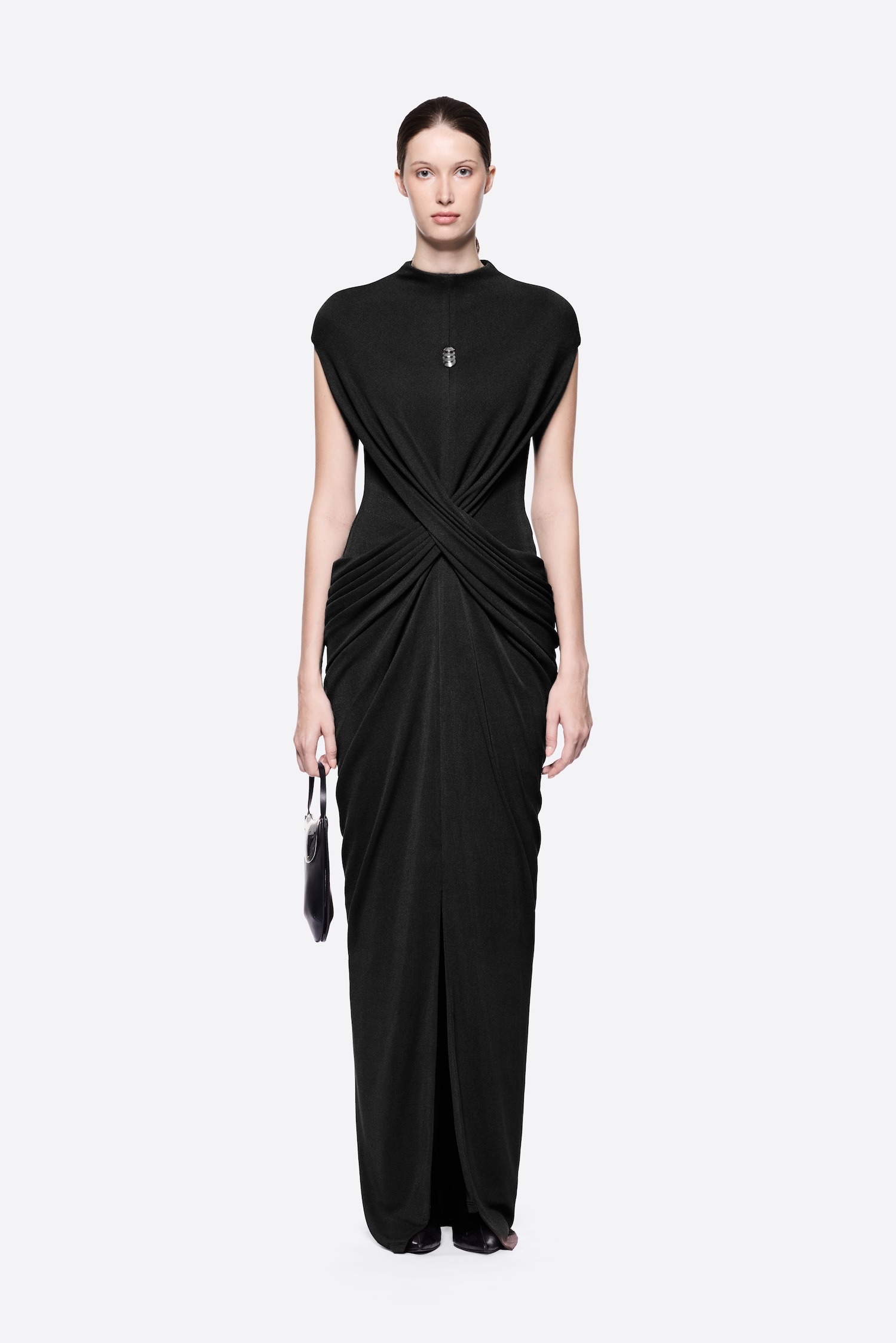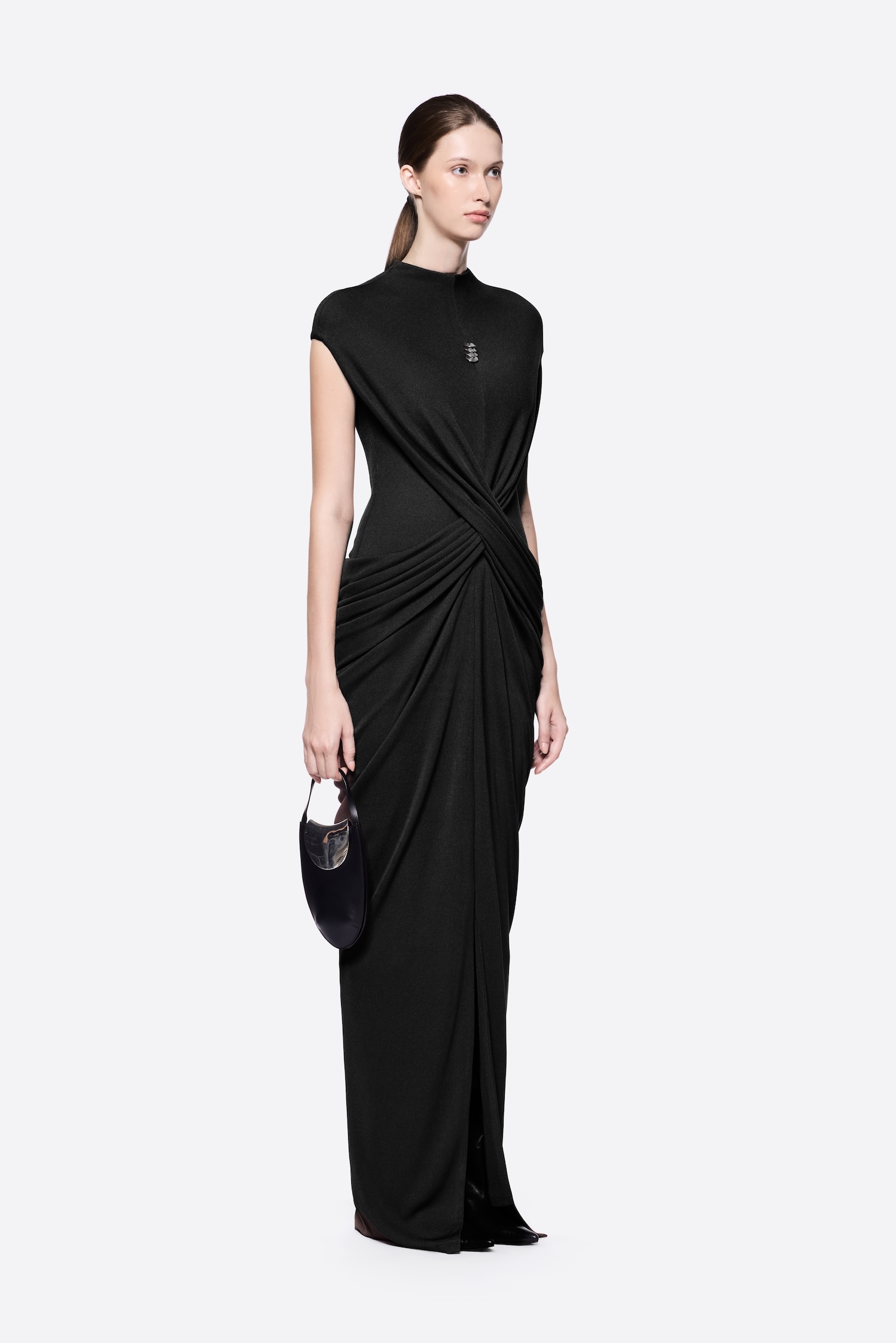Form-fitting long dress with diagonal draping, front slit, and signature metal detail