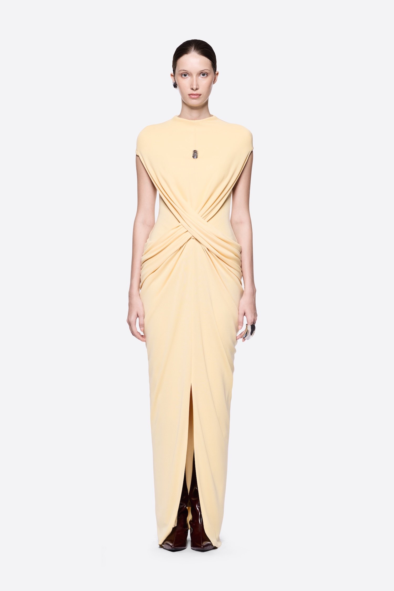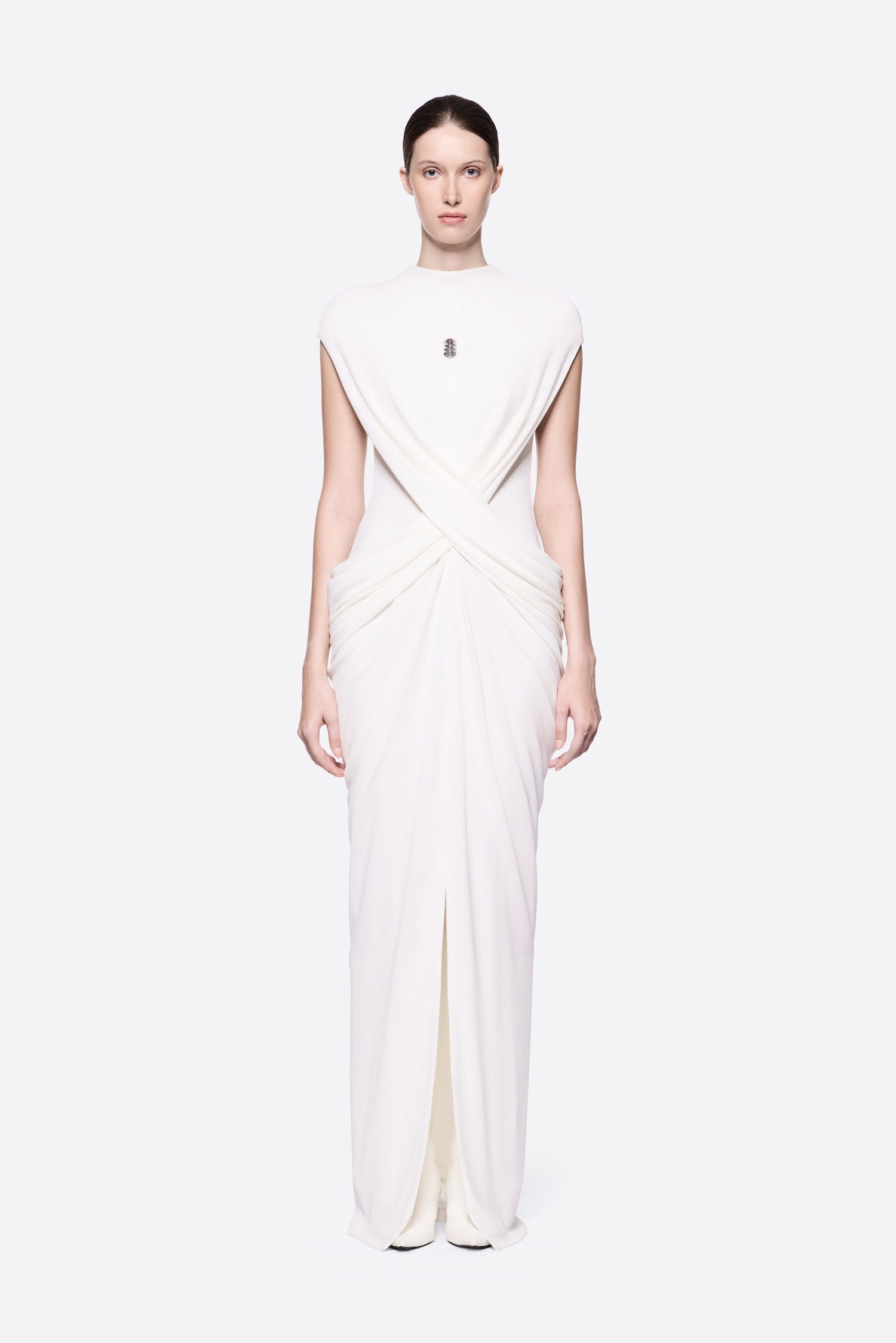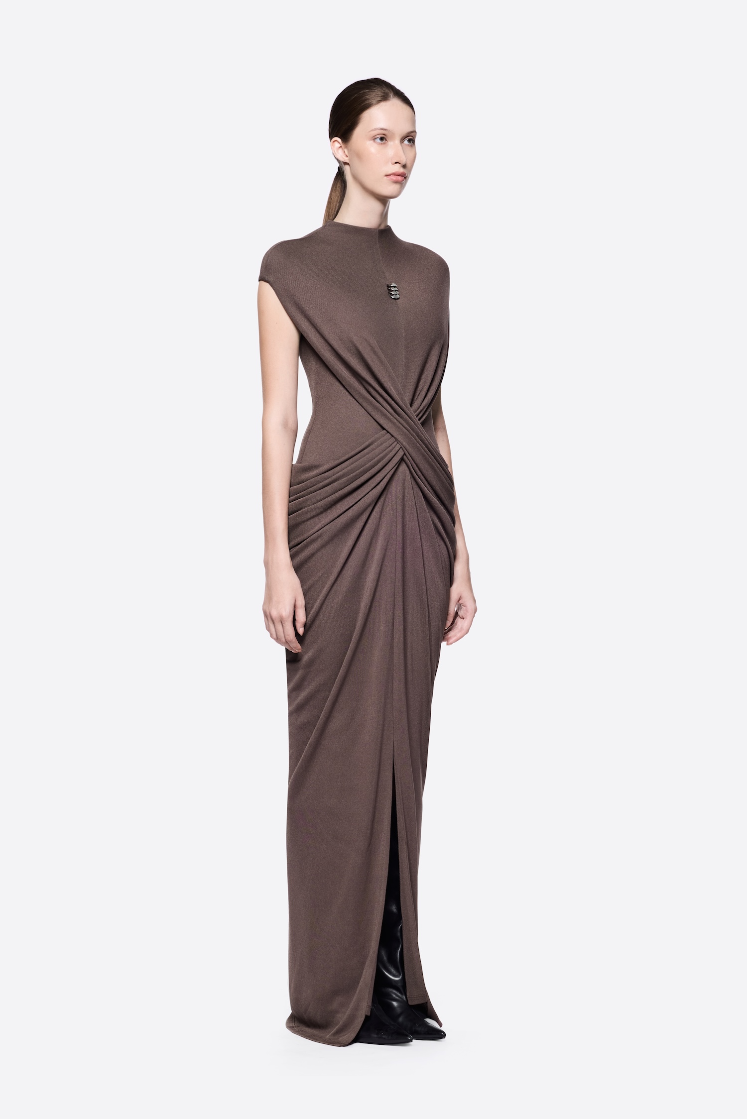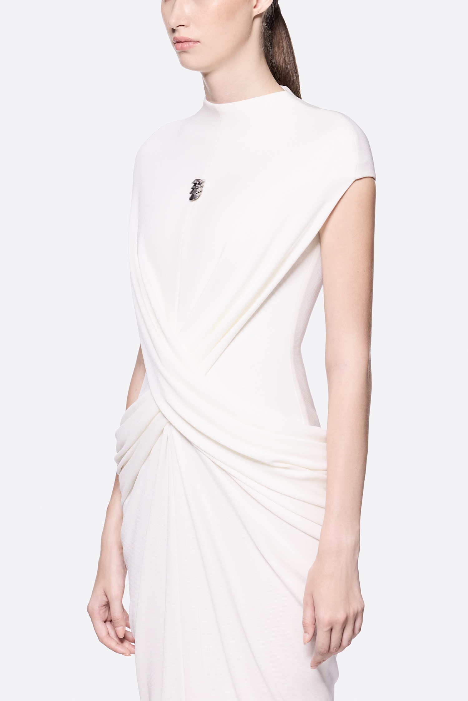 Form-fitting long dress with diagonal draping, front slit, and signature metal detail