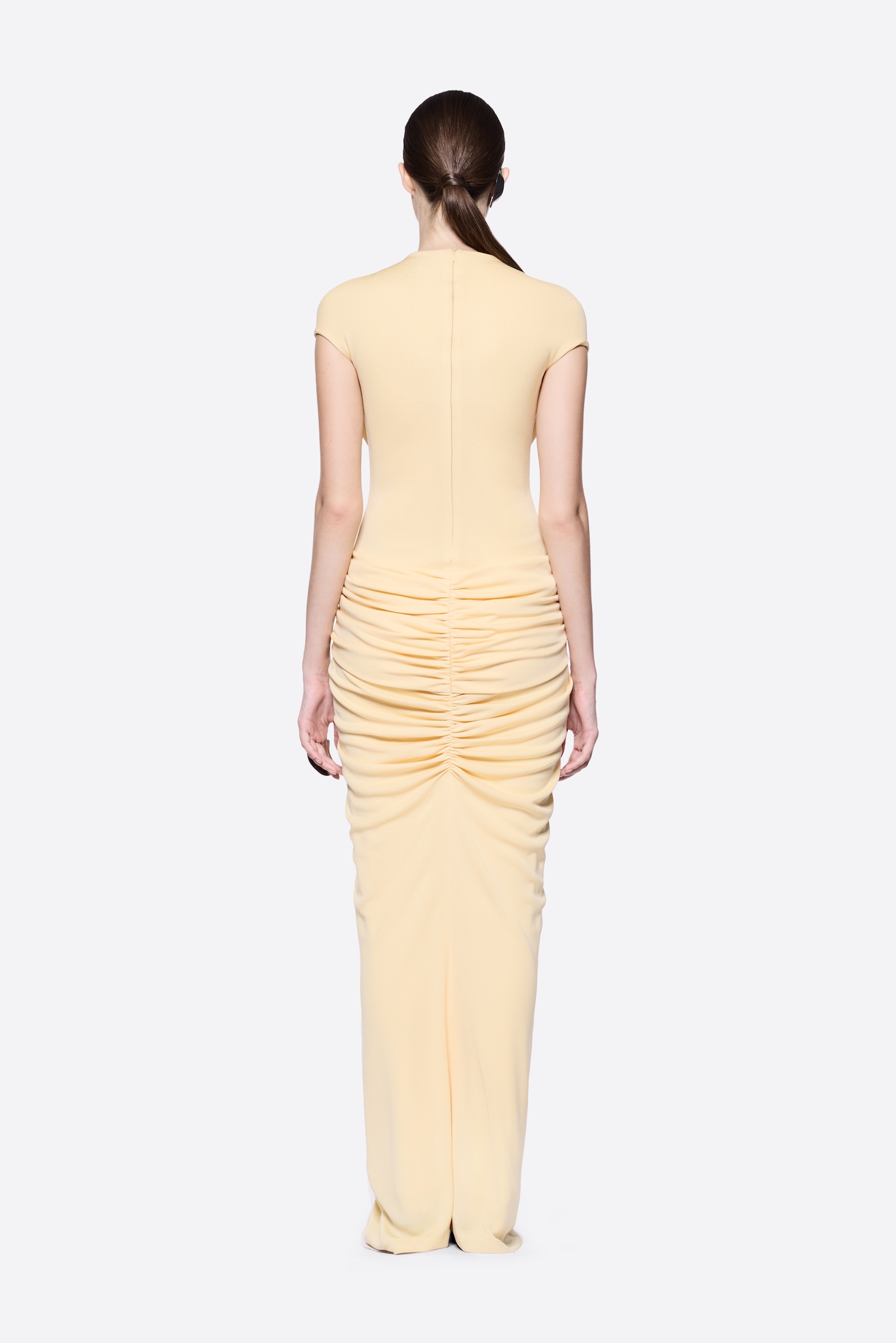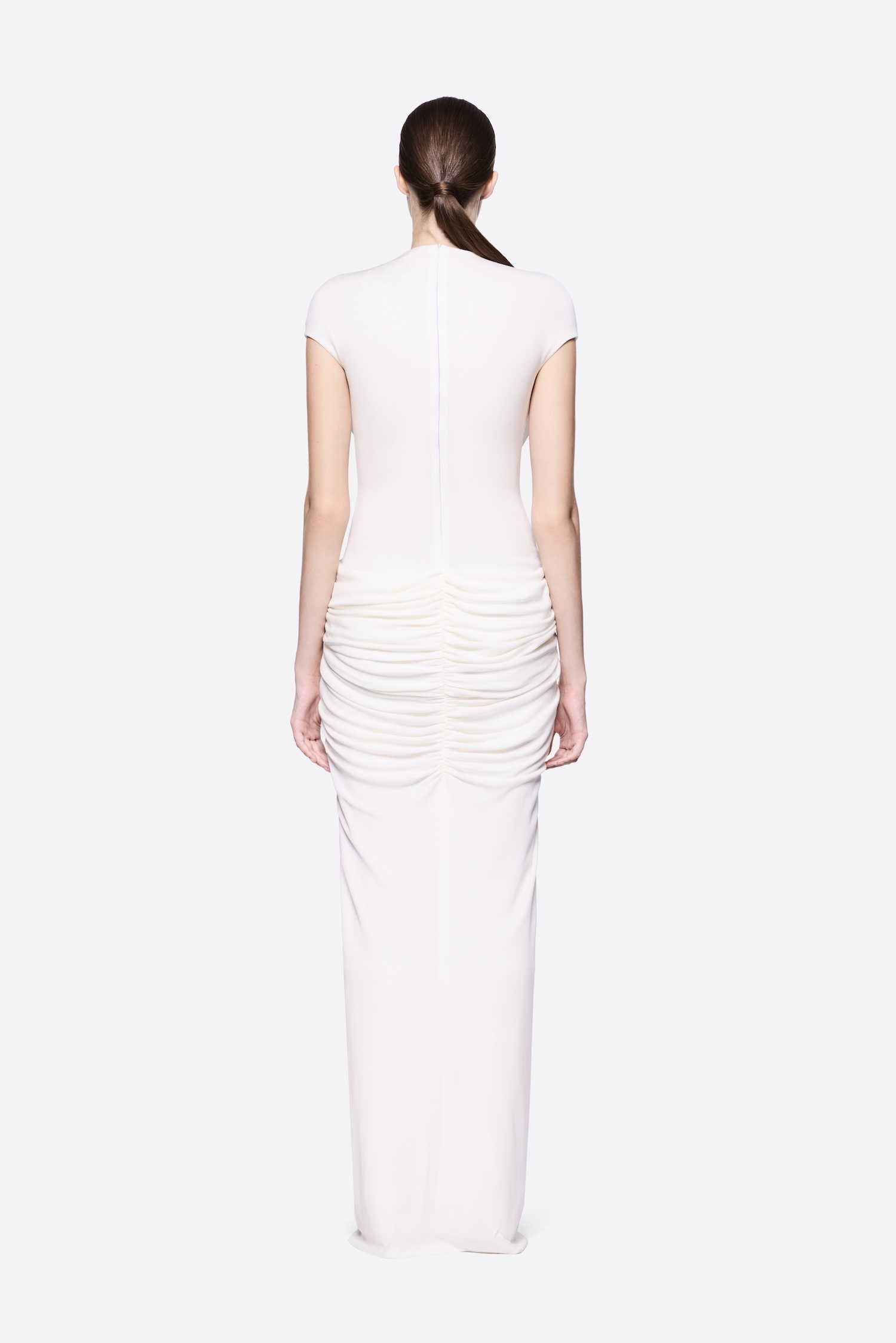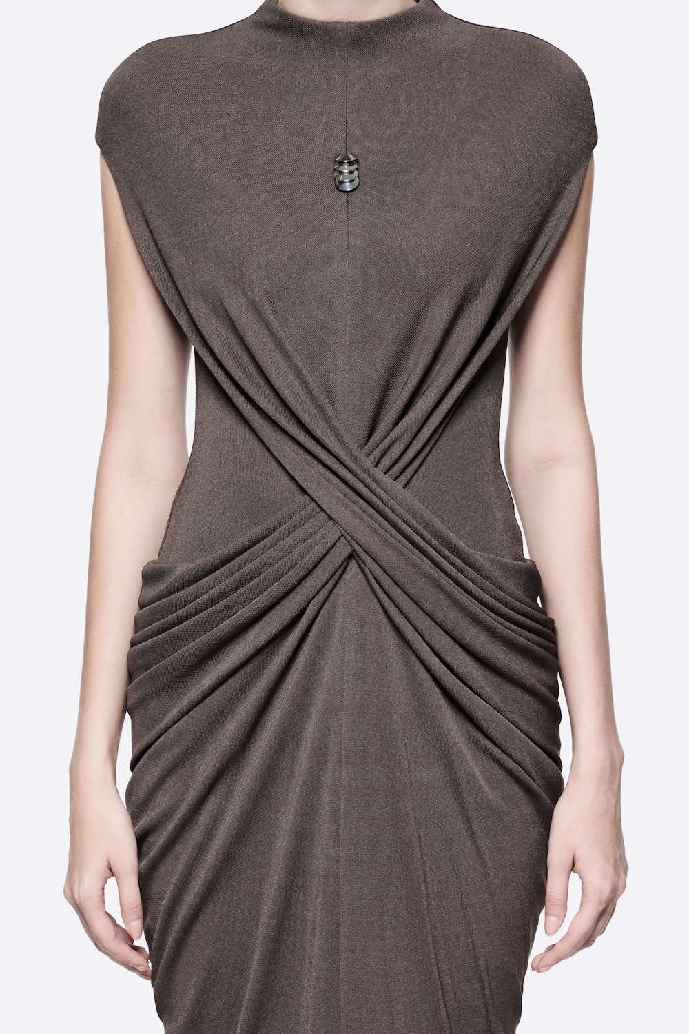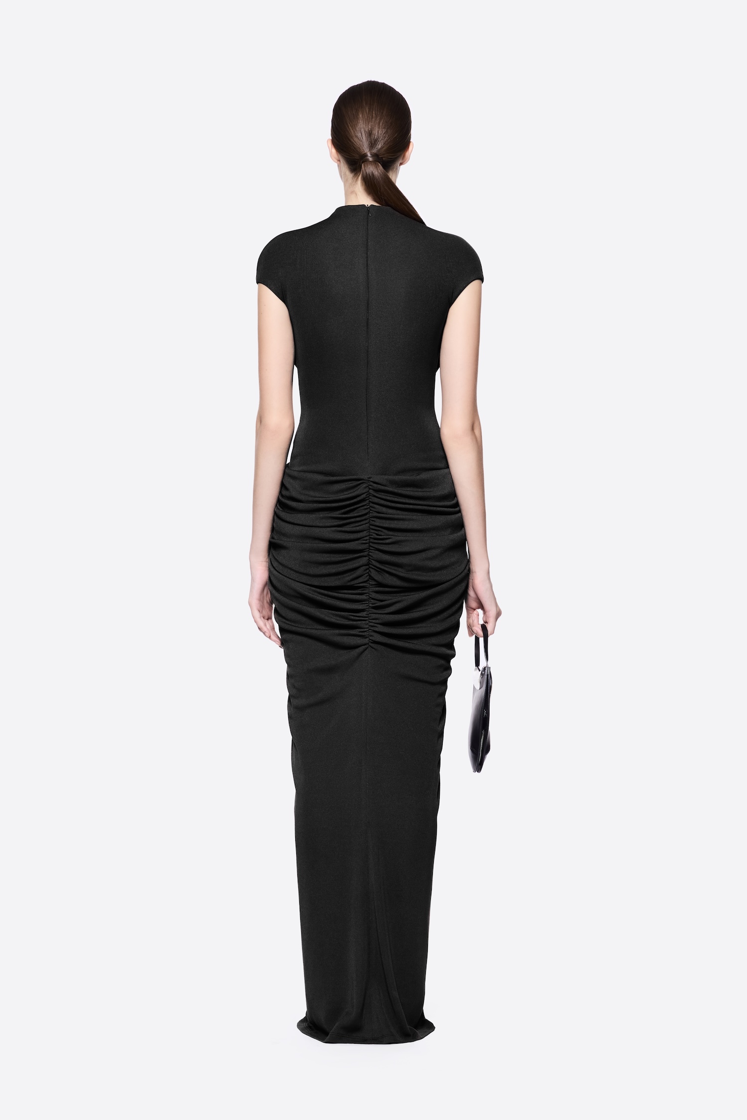 Form-fitting long dress with diagonal draping, front slit, and signature metal detail