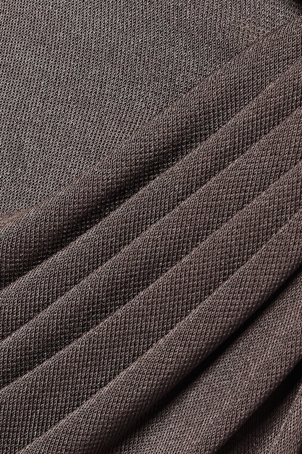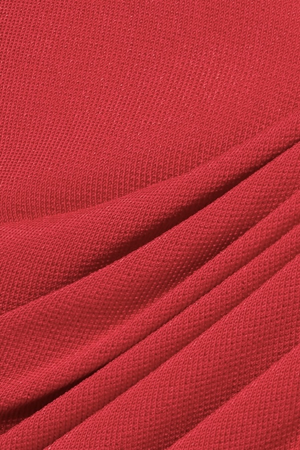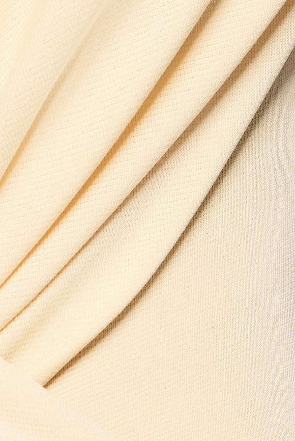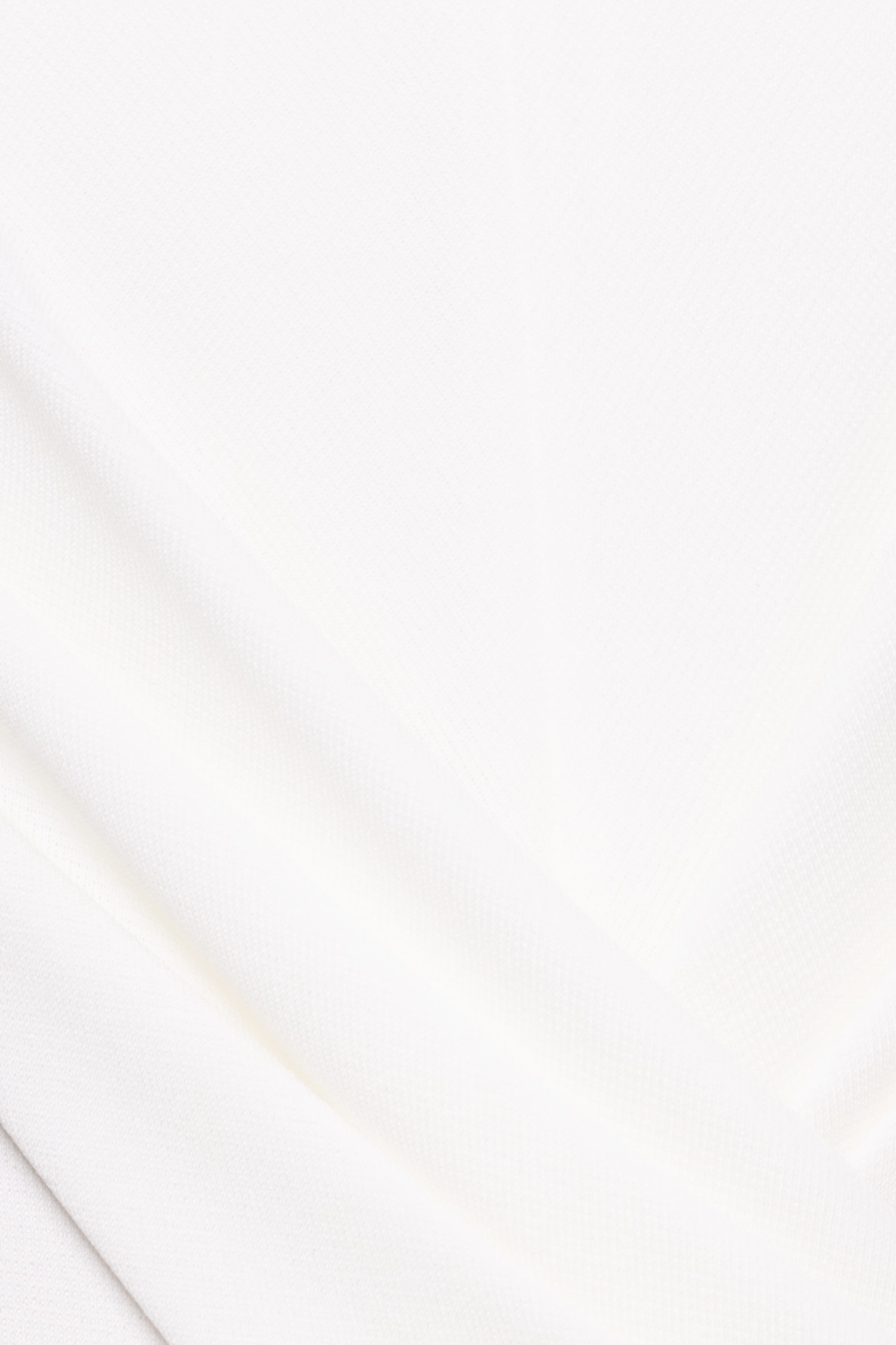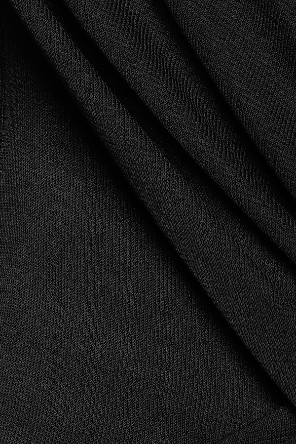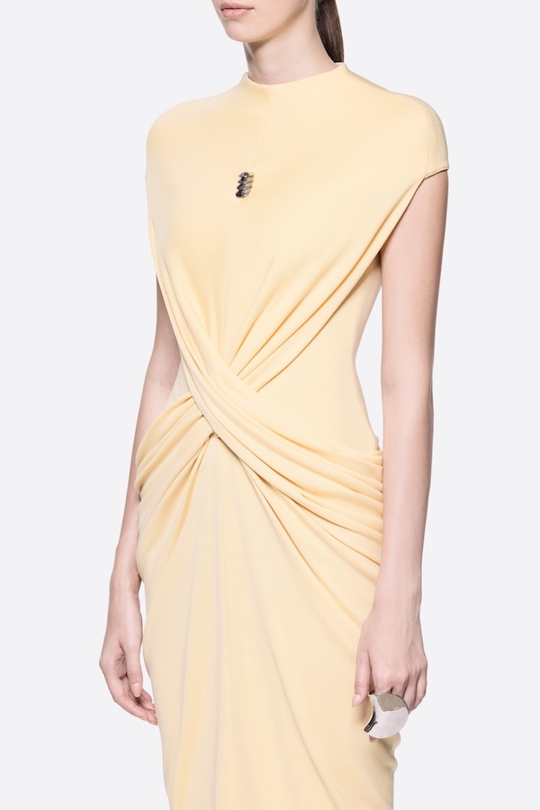 – Detail: short sleeves, Diagonal draping details on the body, Front slit draped details, metallic detail