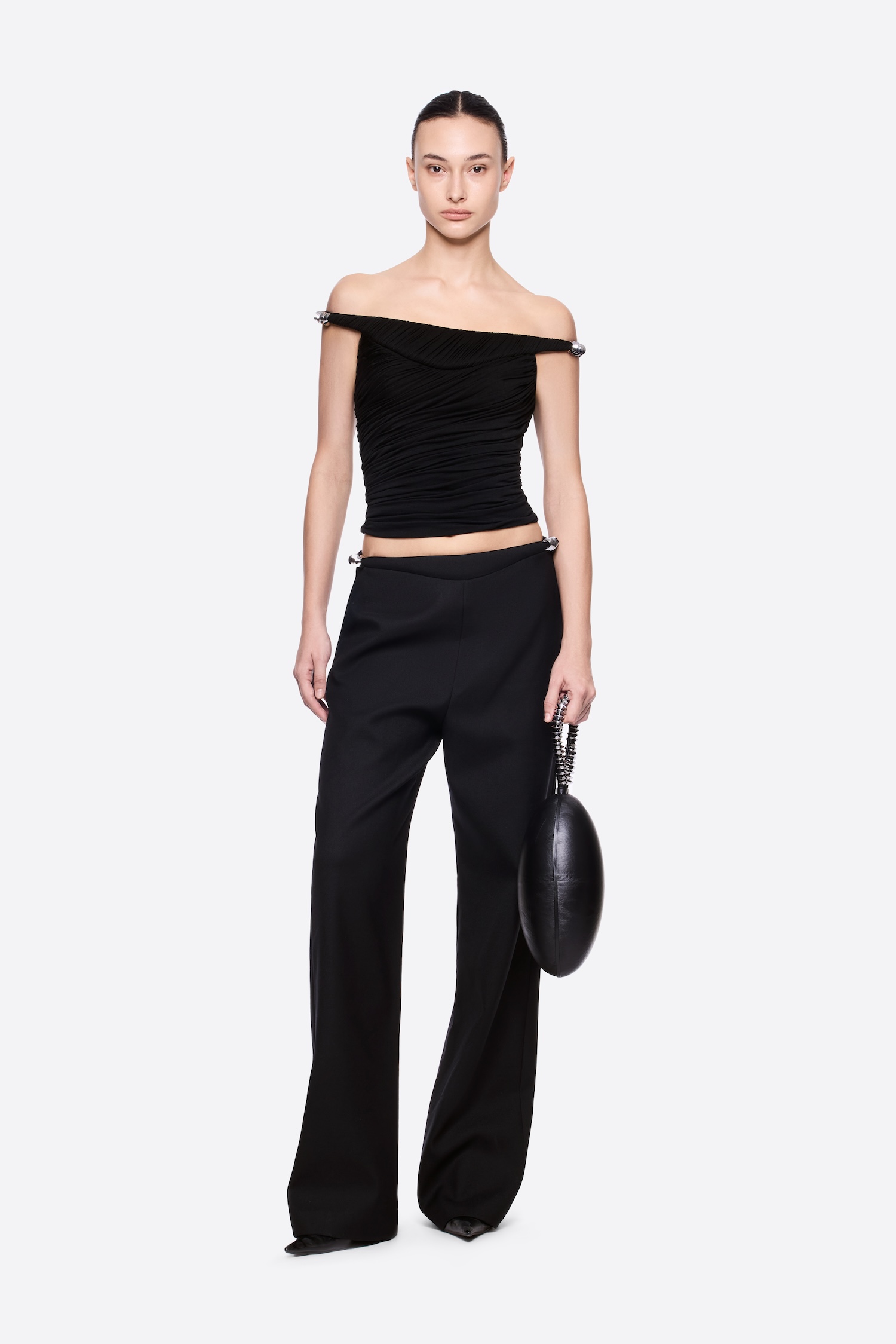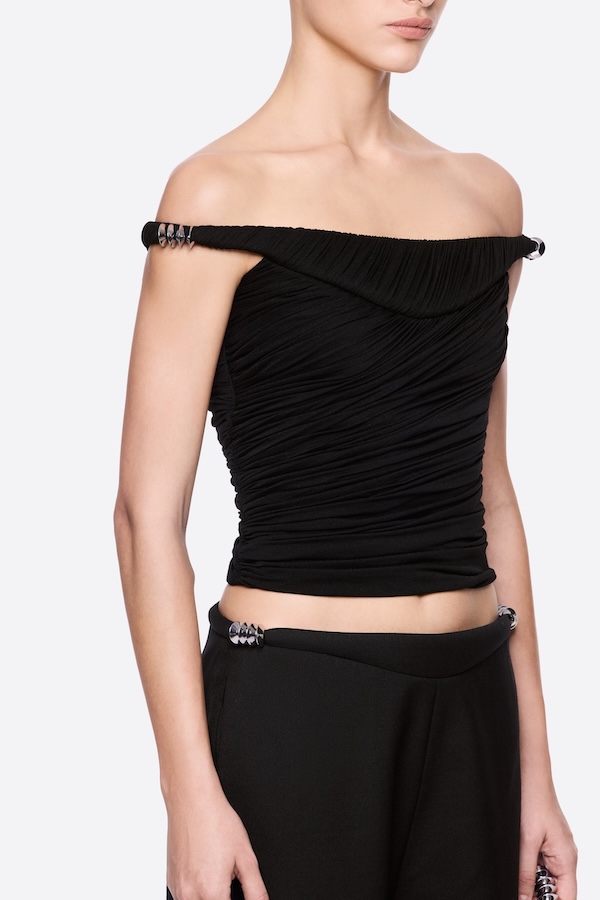 Off-shoulder form-fitting top with pumped bust cup, asymmetrical draping details and metalic details on both shoulders