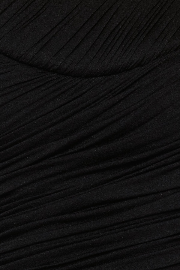 – Detail: Asymmetrical draping details, Pump draping cup details, metallic details on both shoulder