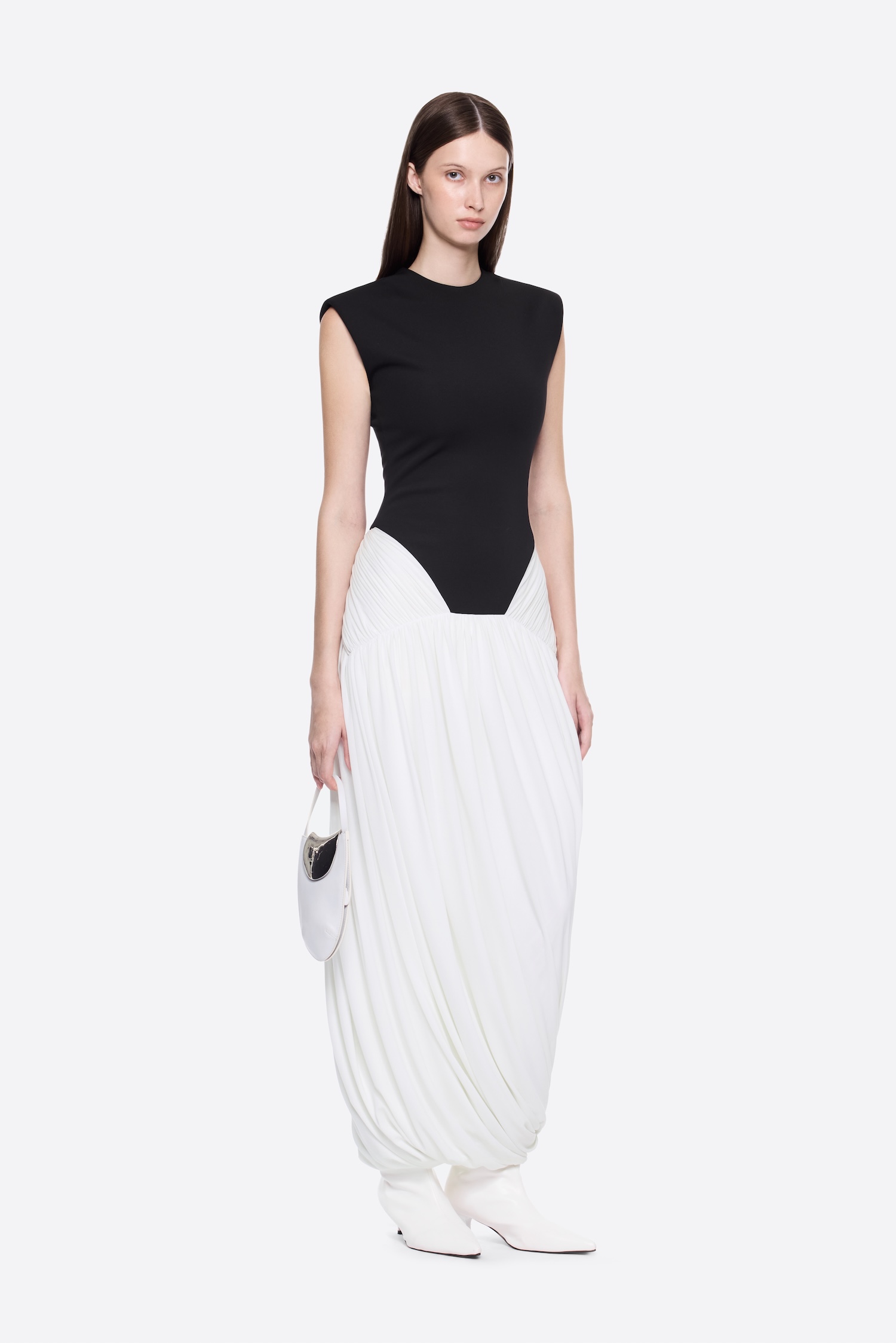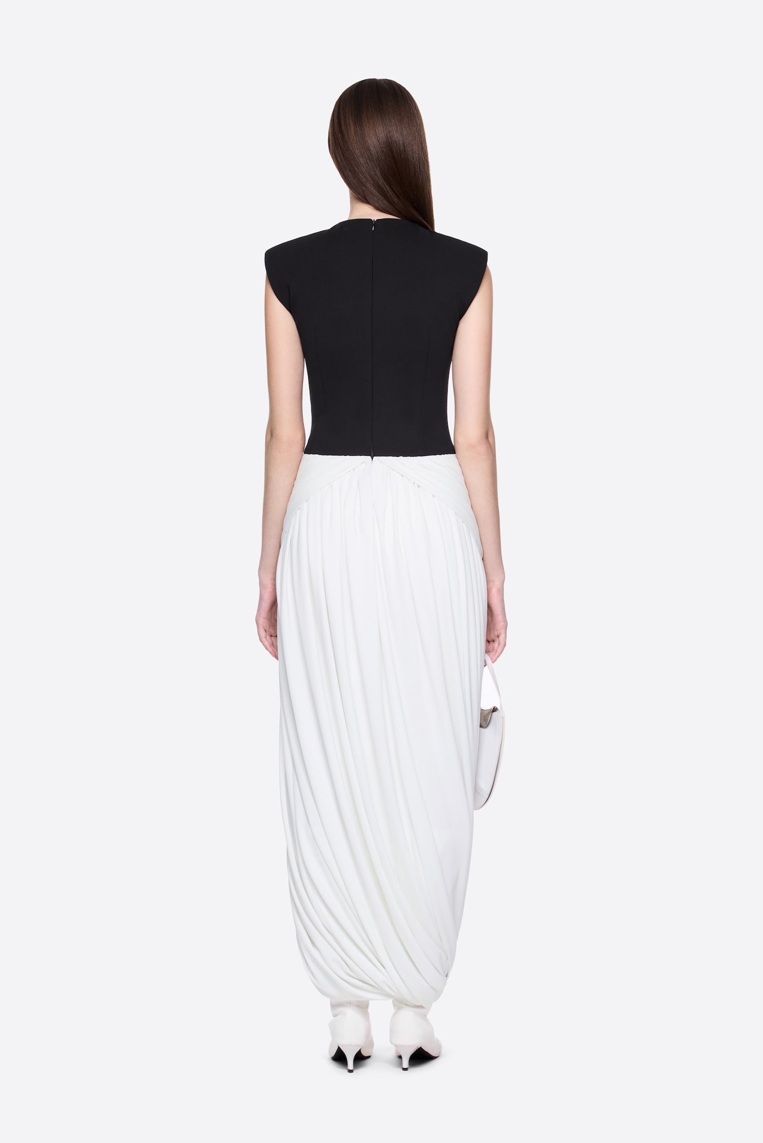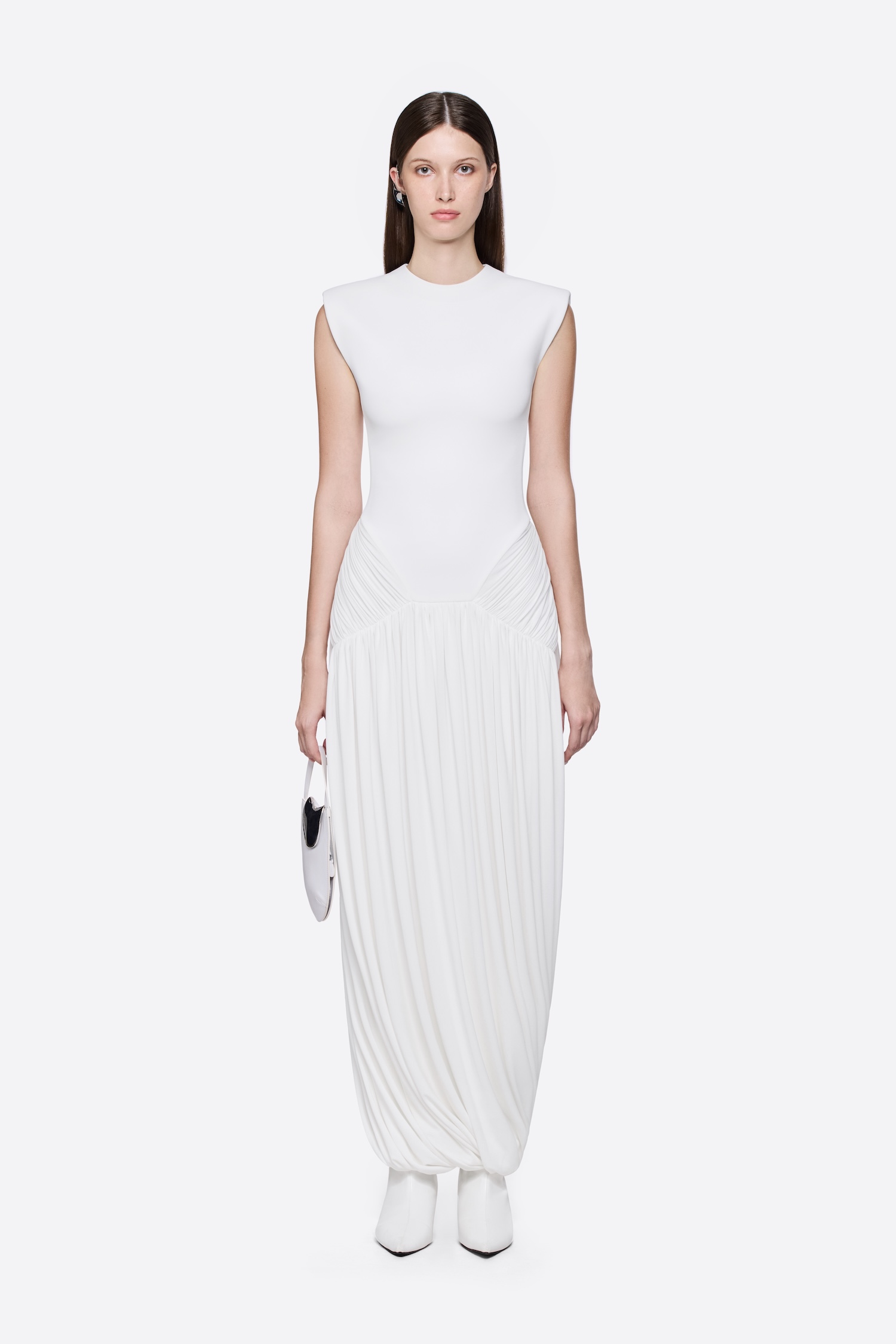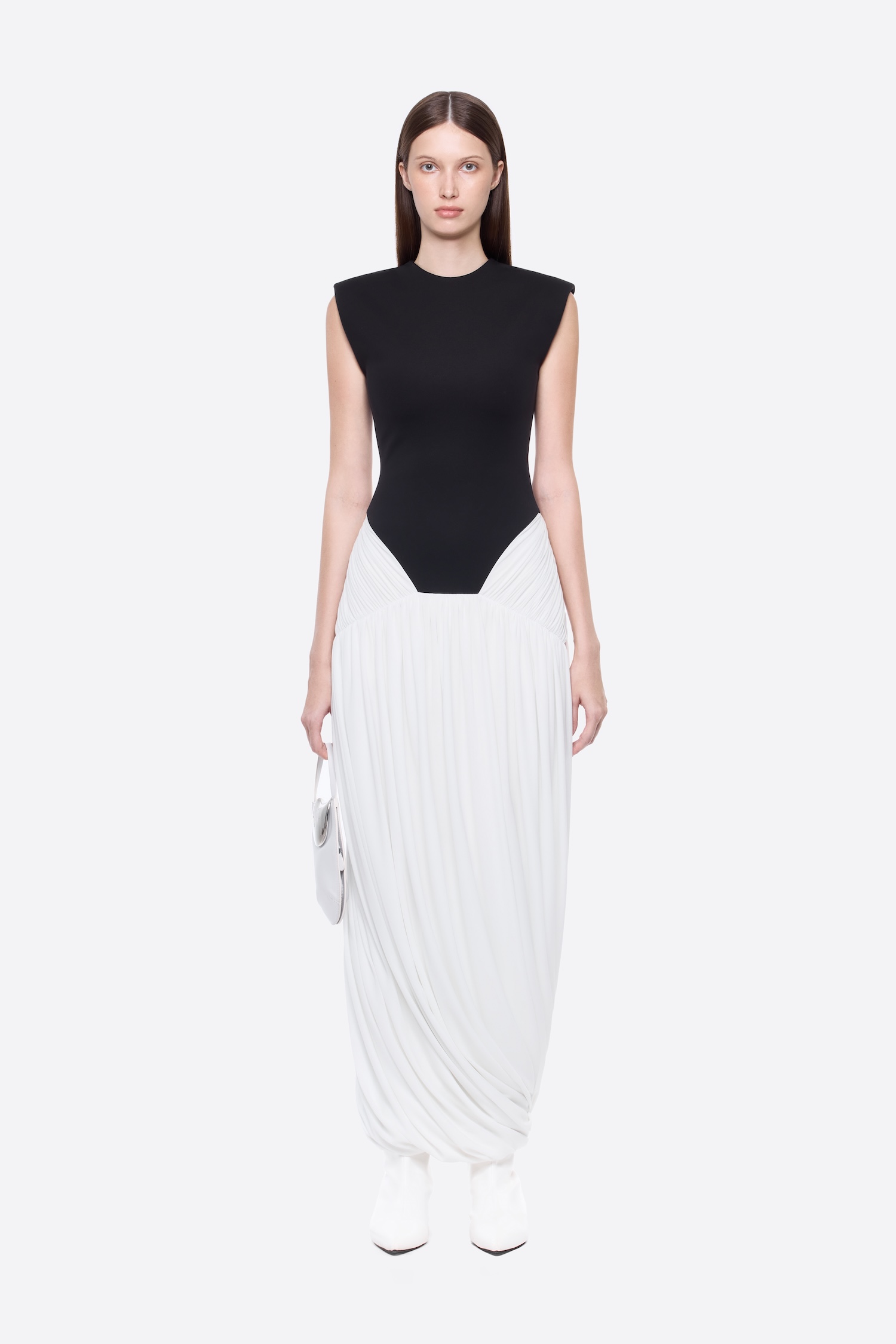 Sleeveless dress with padded shoulders, circular twisted skirt, and symmetrical draped details at bust and hip