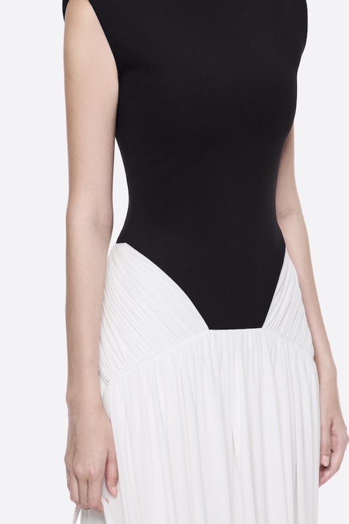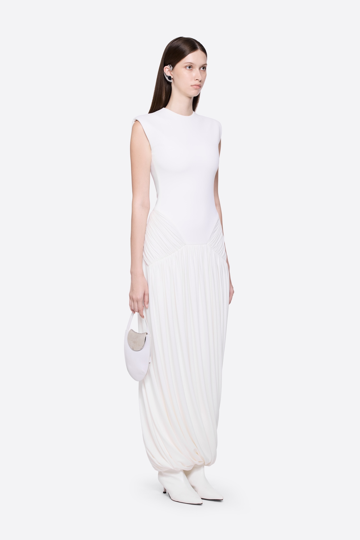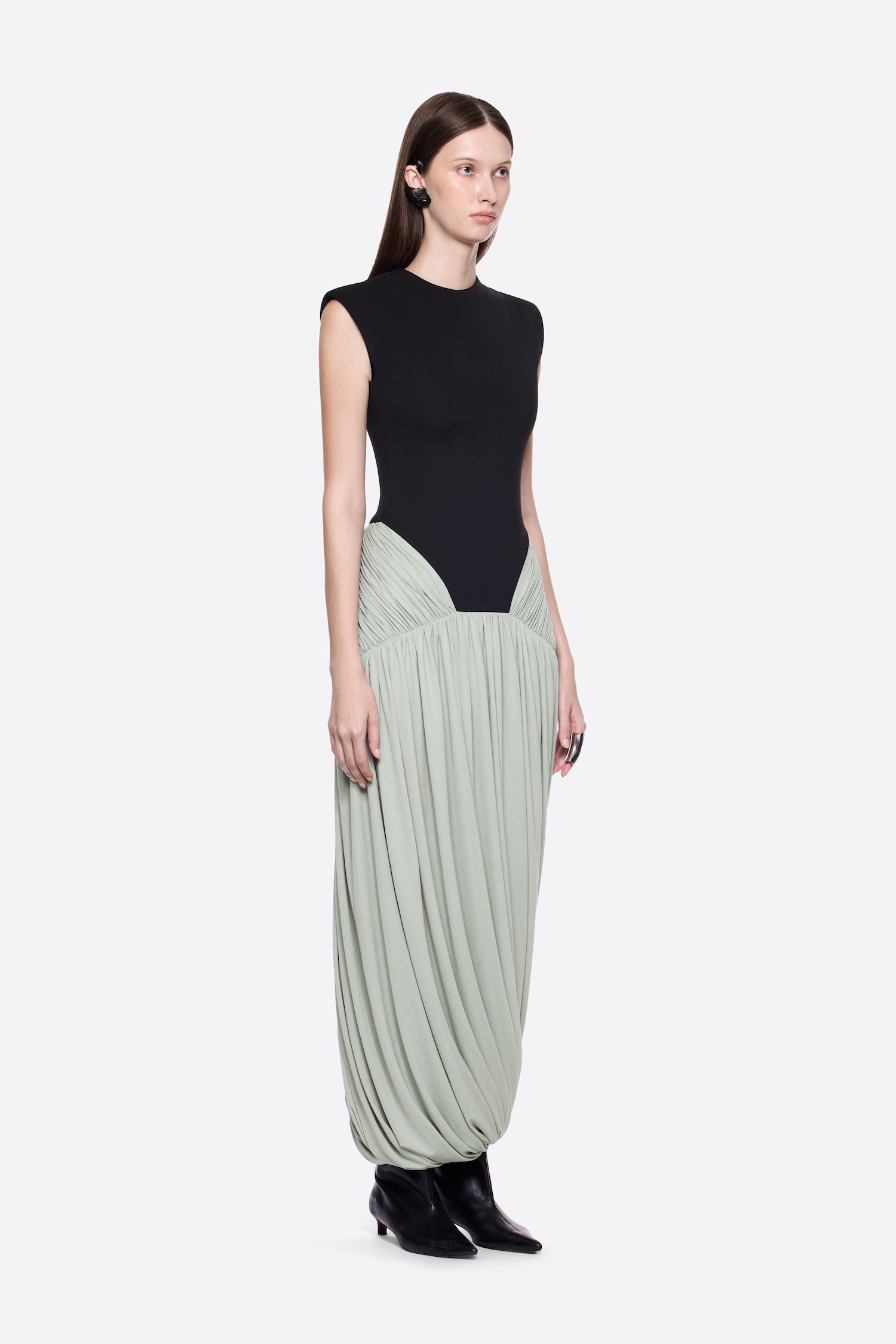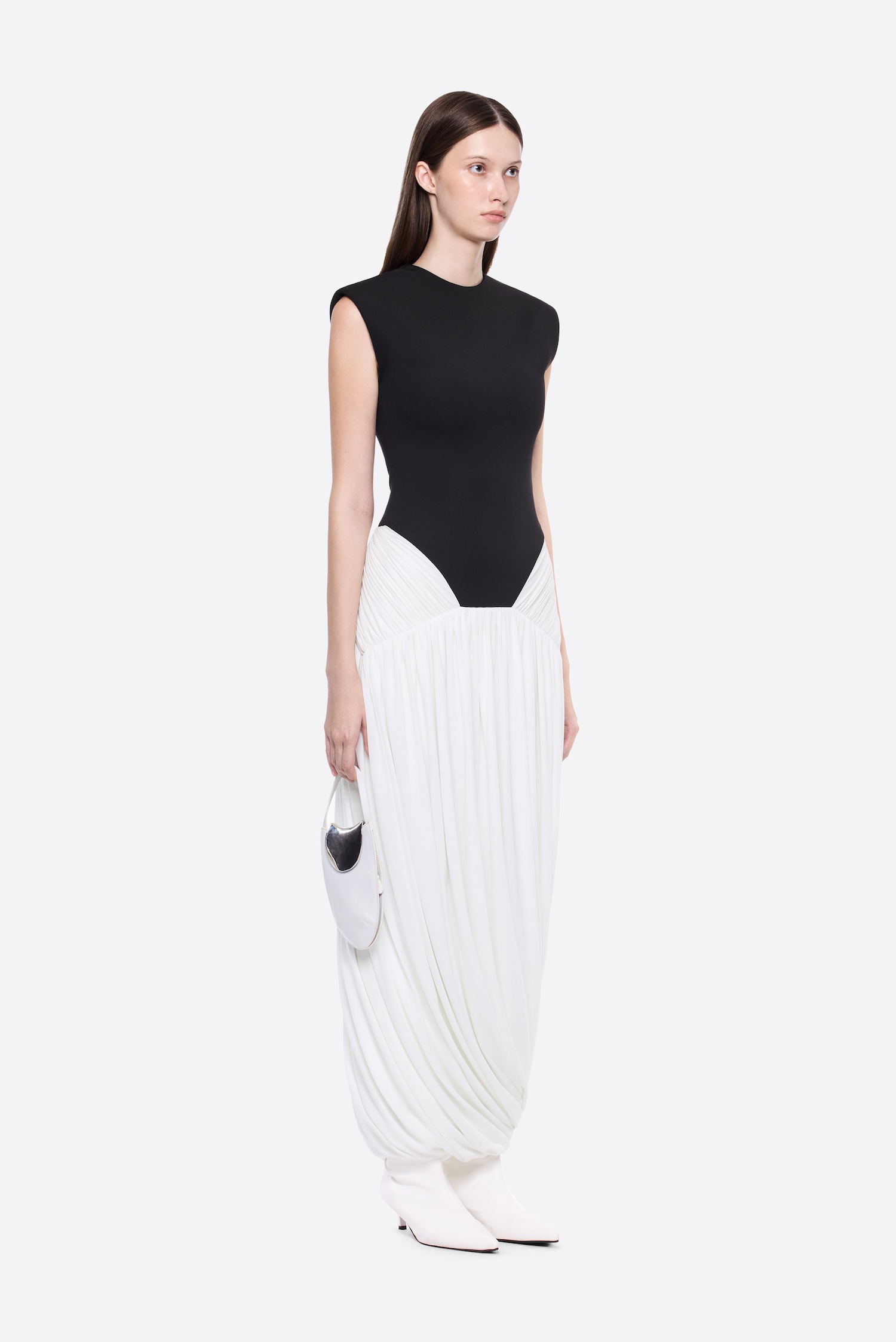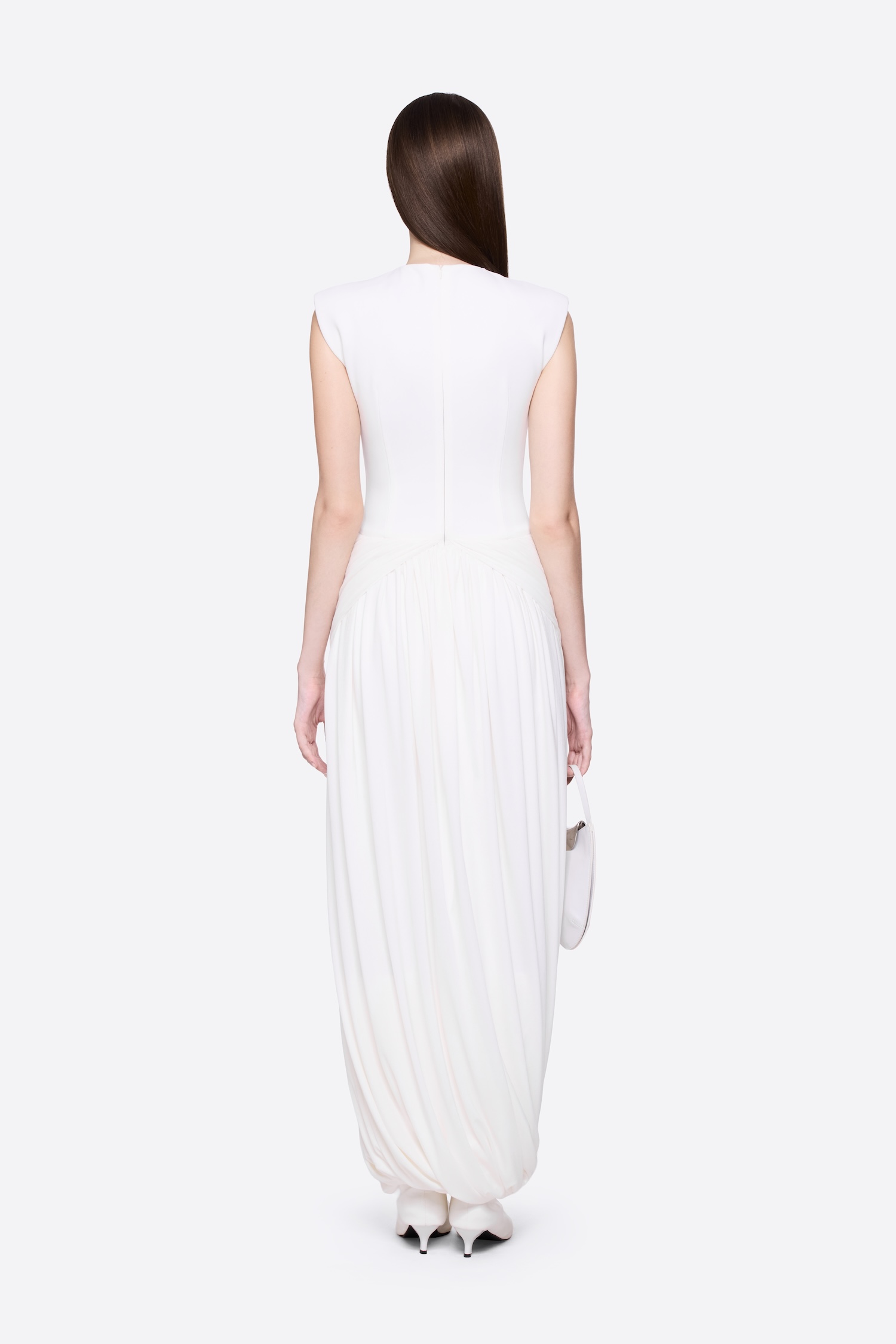 Sleeveless dress with padded shoulders, circular twisted skirt, and symmetrical draped details at bust and hip