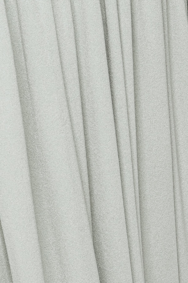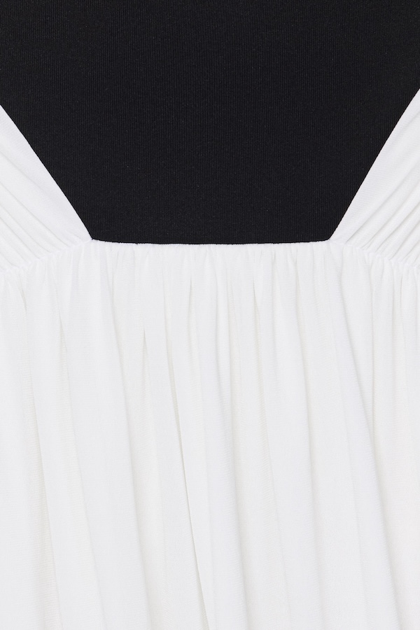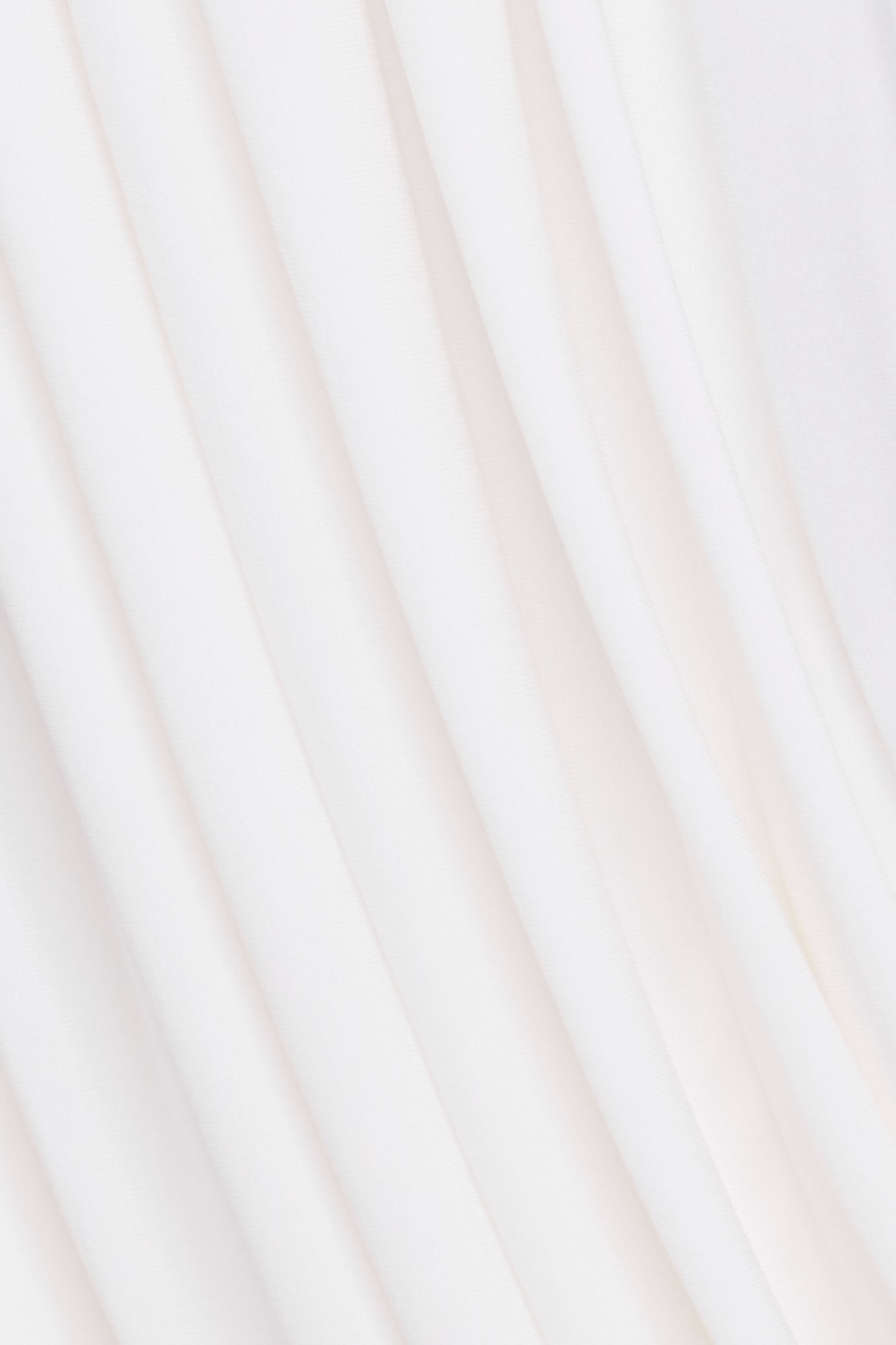 – Detail: Symmetrical draping details at hip, Circular twisted skirt, Padded shoulders, Sleeveless