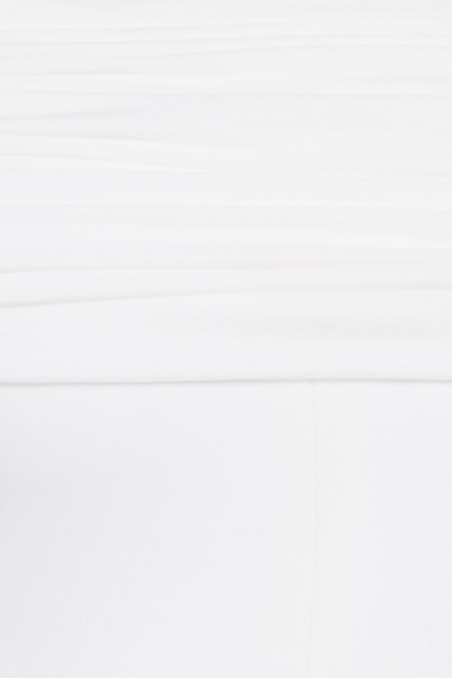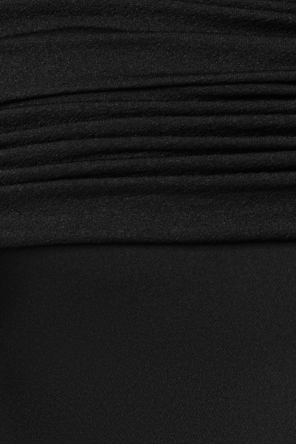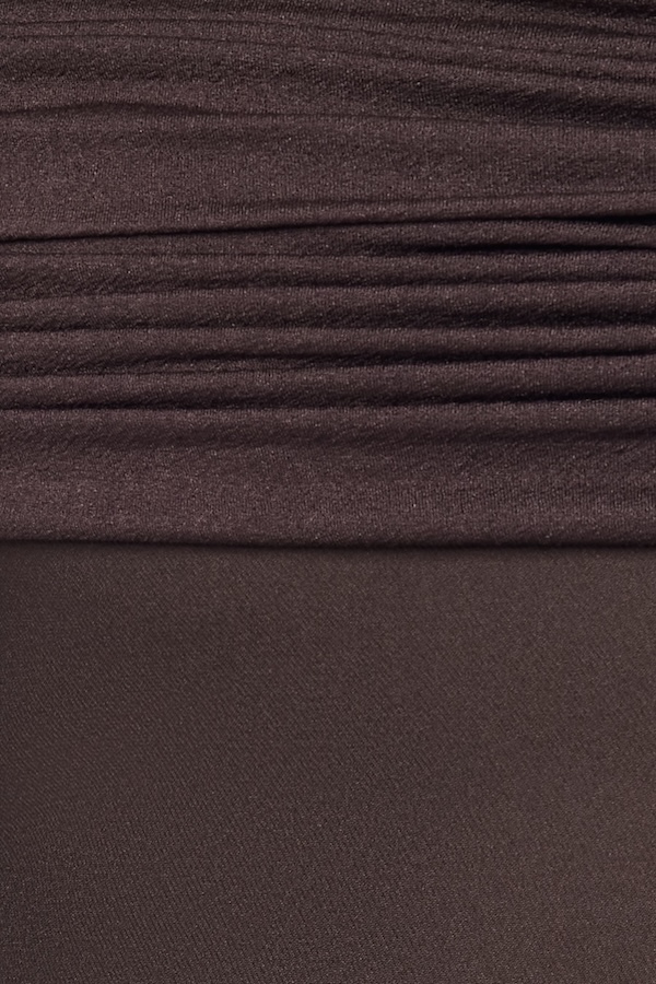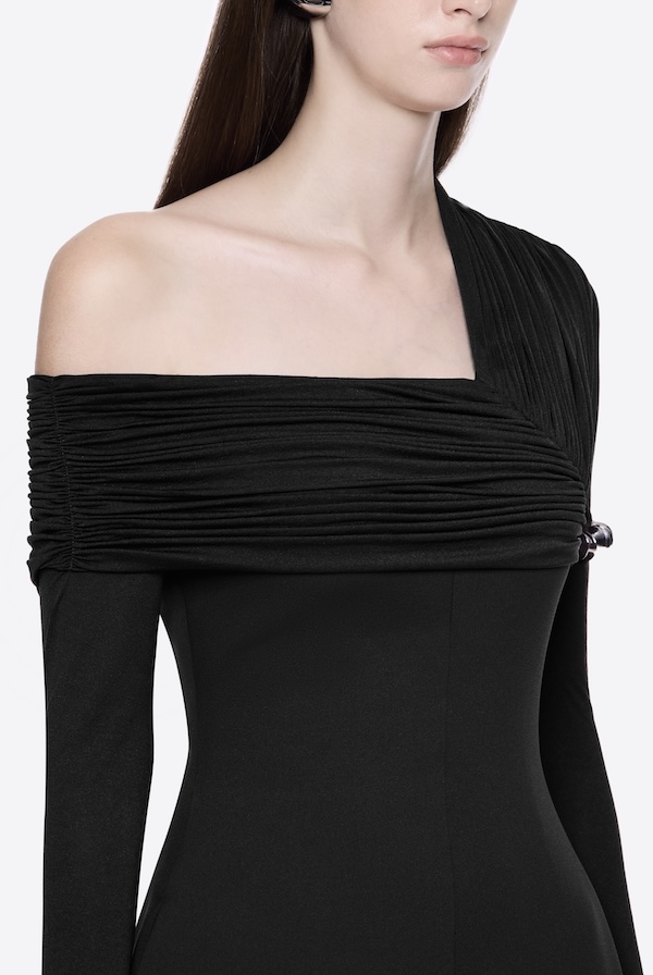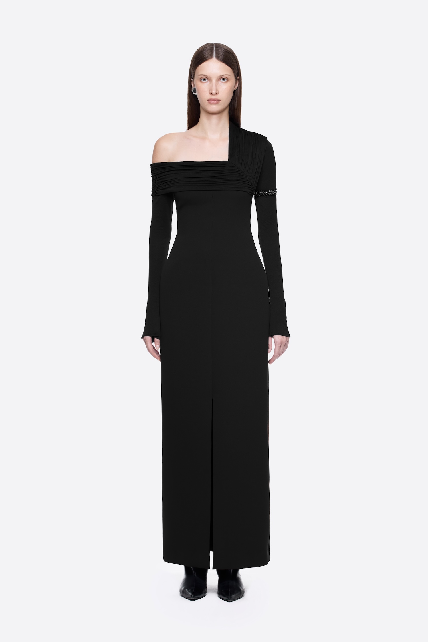 – Detail: Asymmetric off-shoulder draping, Long sleeves, Front slit accent