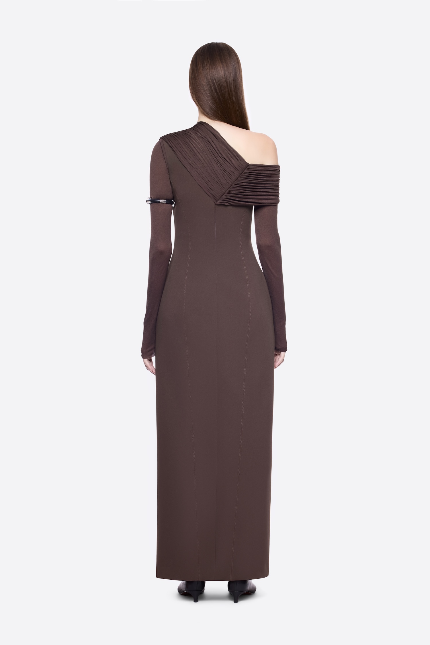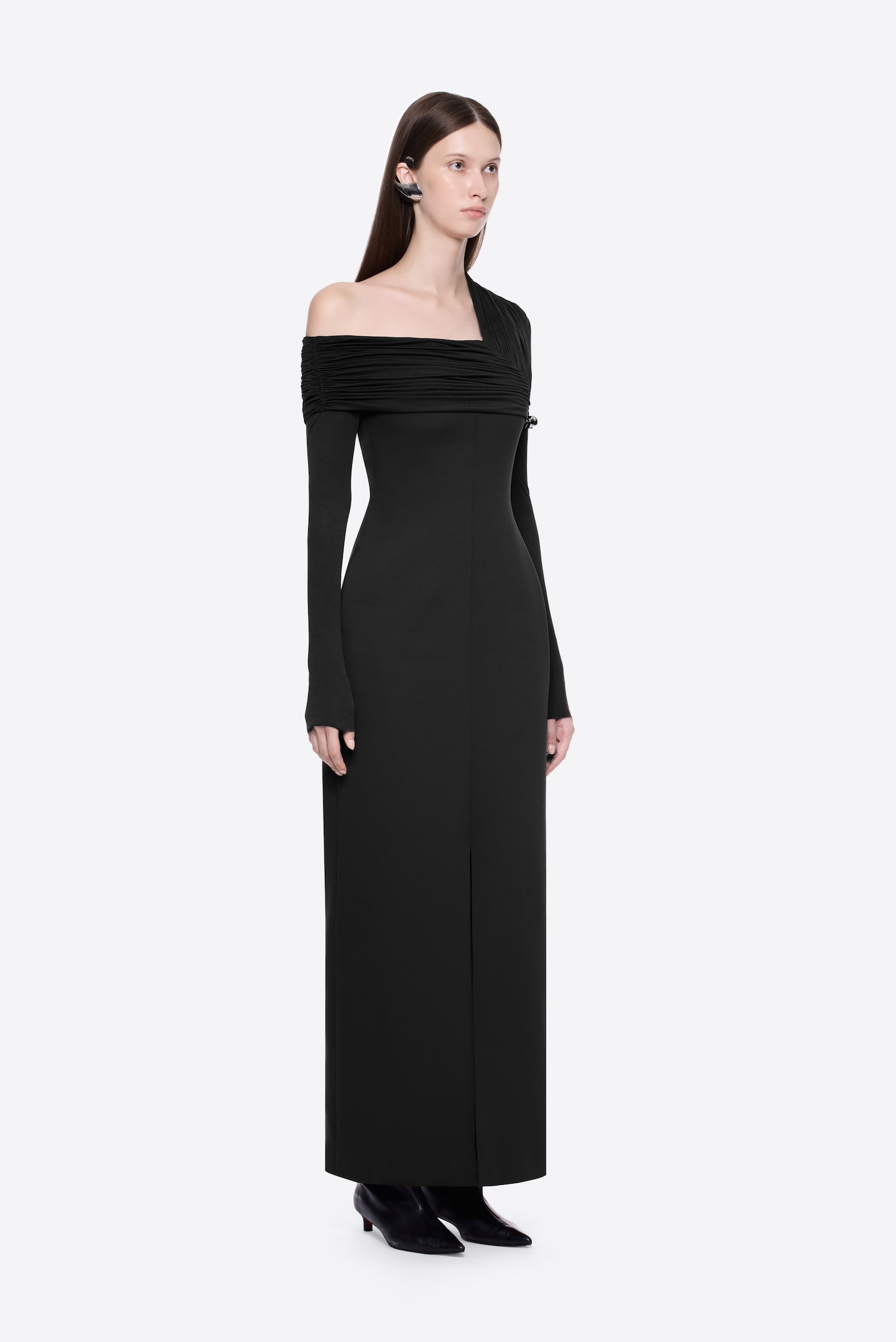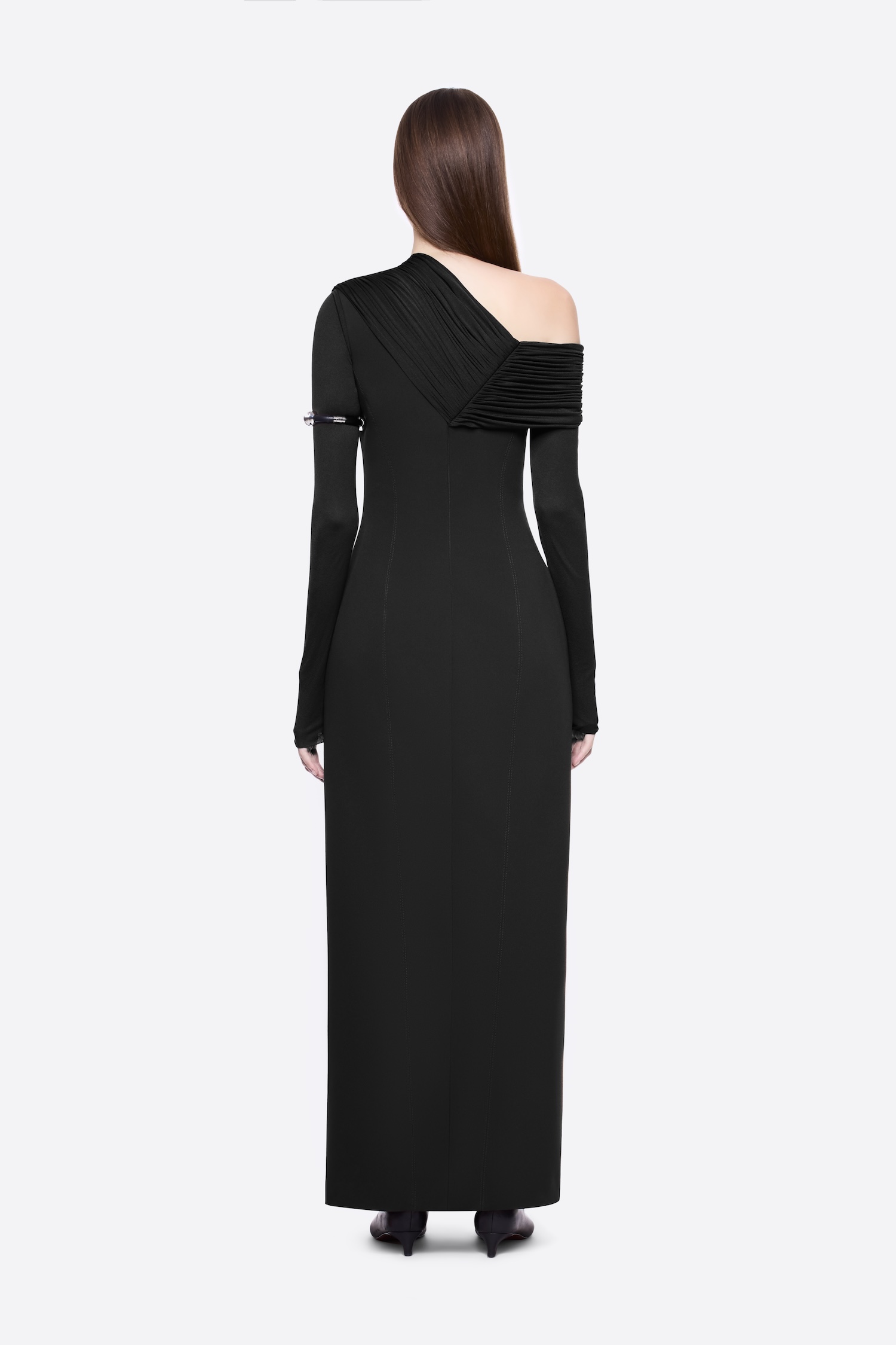 Form-fitting long dress with asymmetric off-shoulder draping and a front slit accent