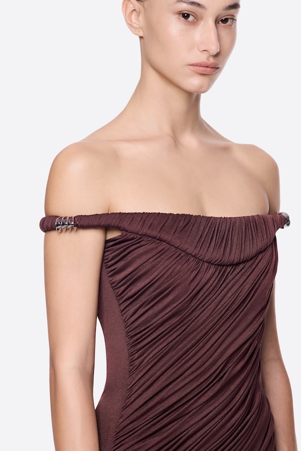 Off-shoulder form-fitting mini dress with pump draping details and metalic details on both shoulders